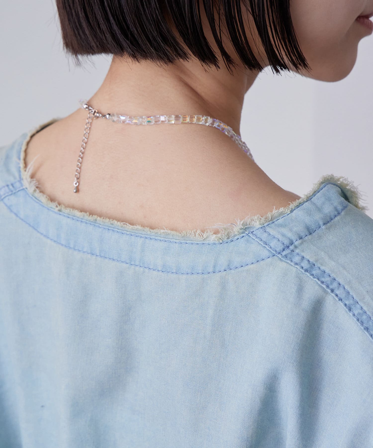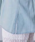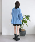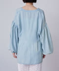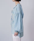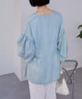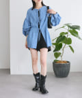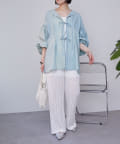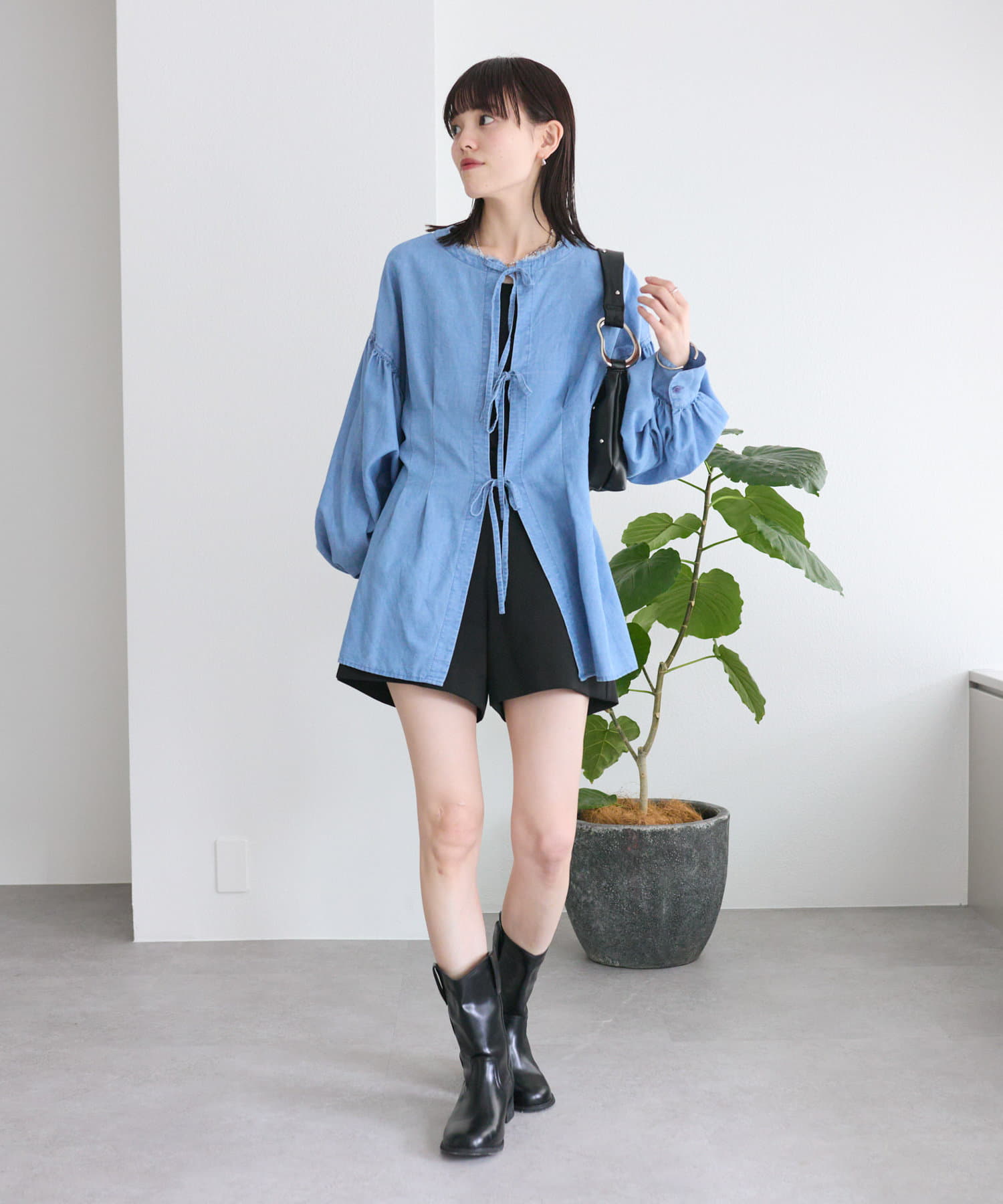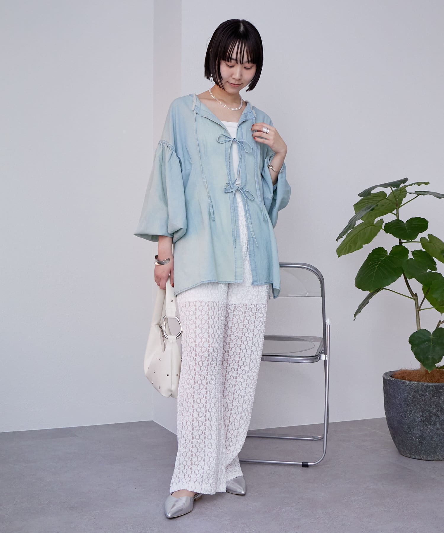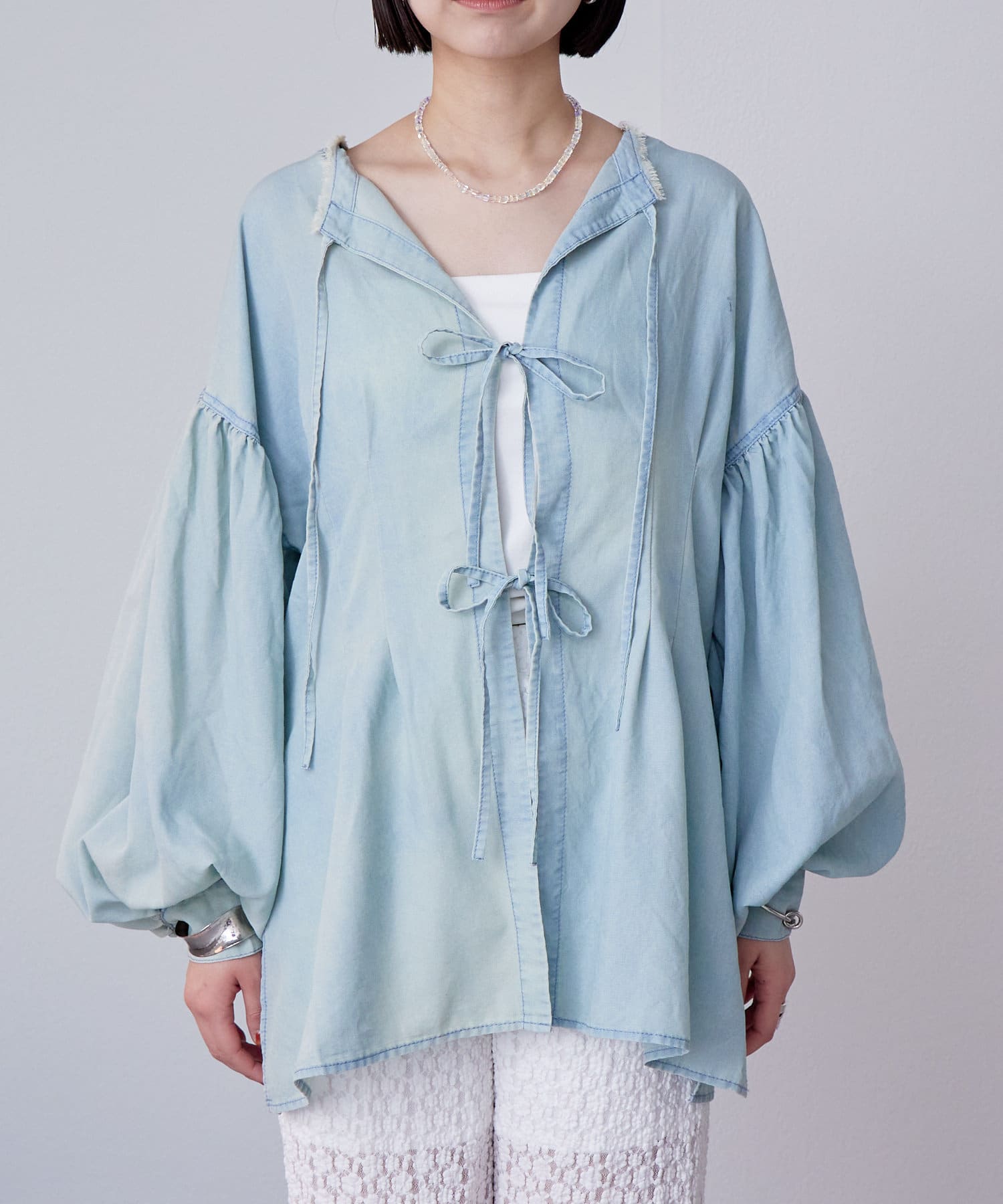 前開きデザインで、ウエスト部分にはリボンで結べる紐が付いているため、シルエットの変化を楽しめるシャツ。