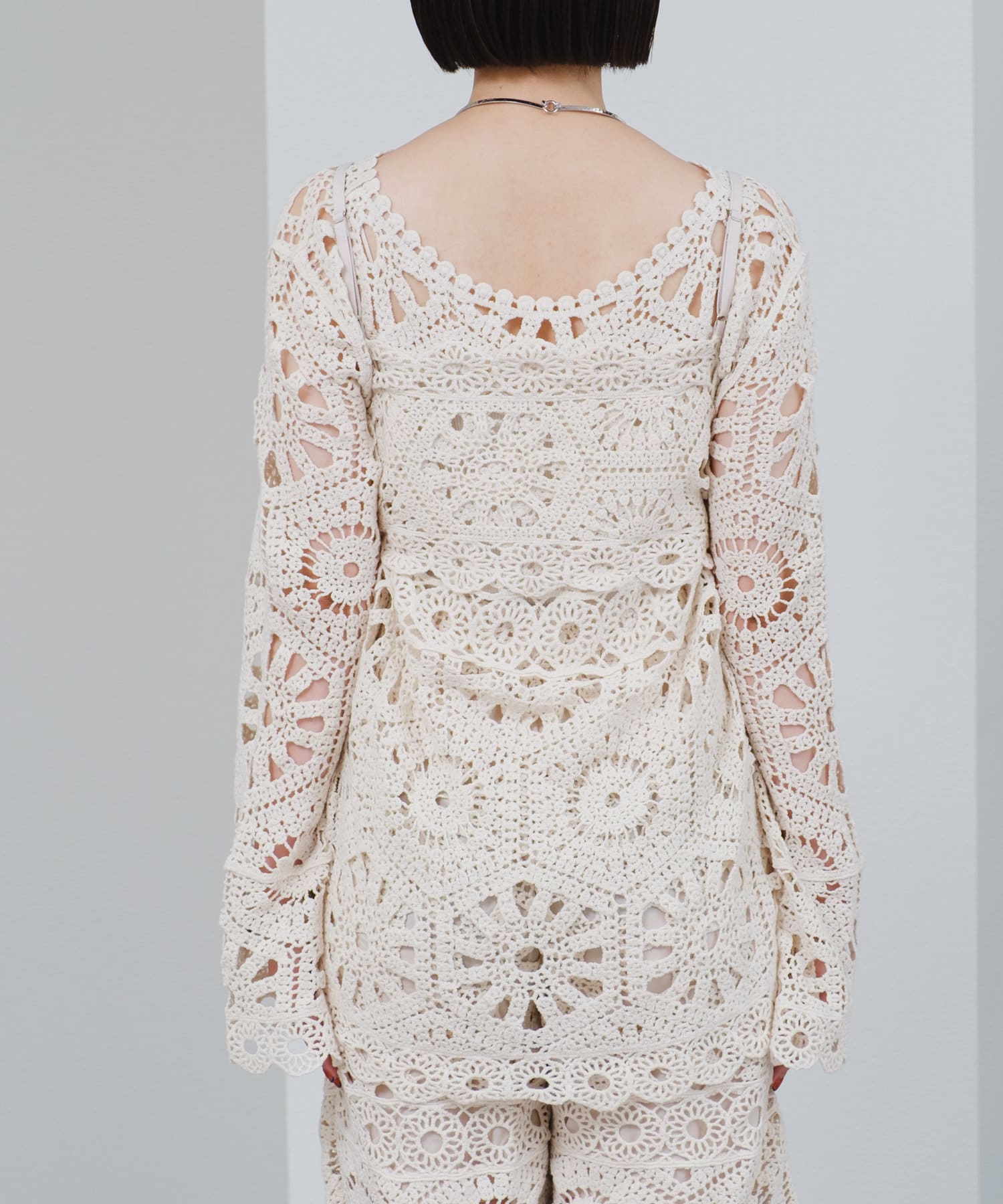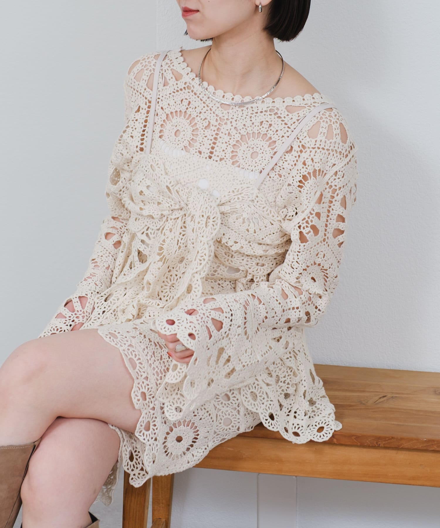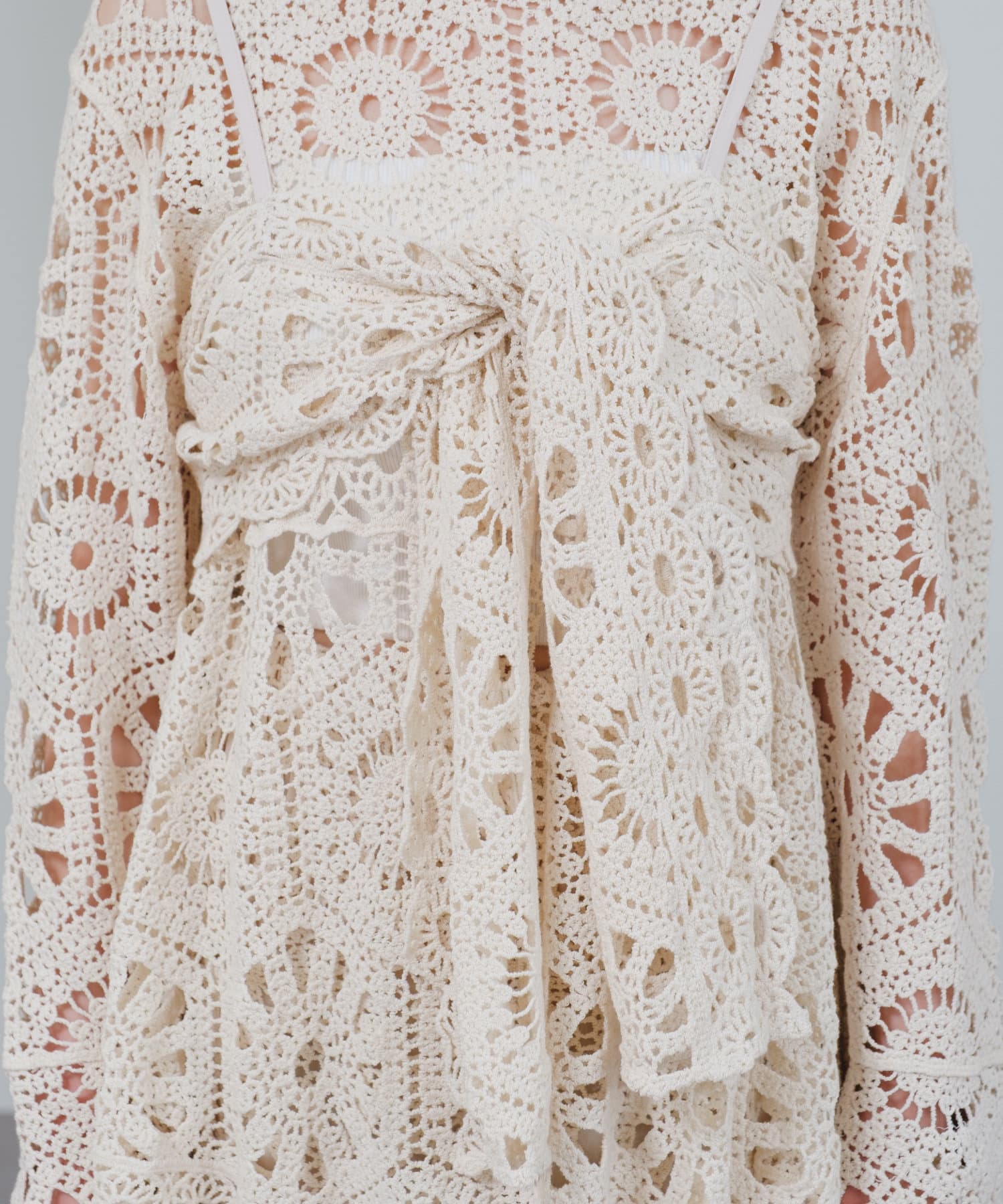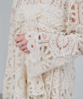 クロシェ編みのブラウスとビスチェがセットになったトップス。