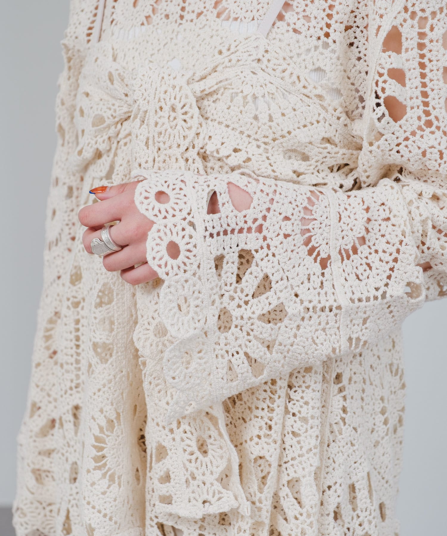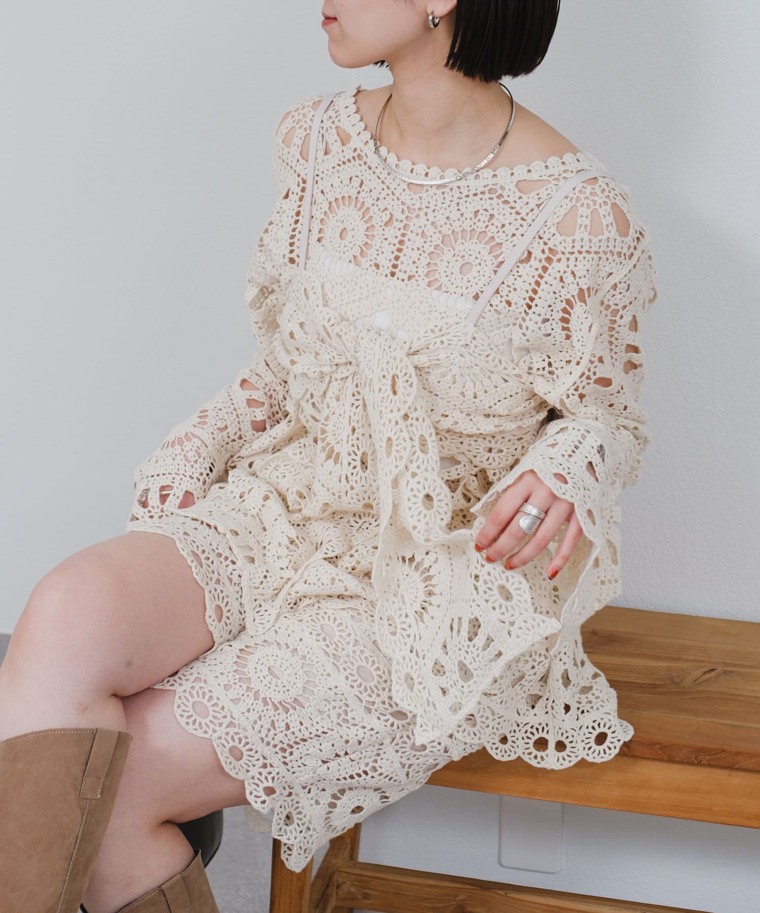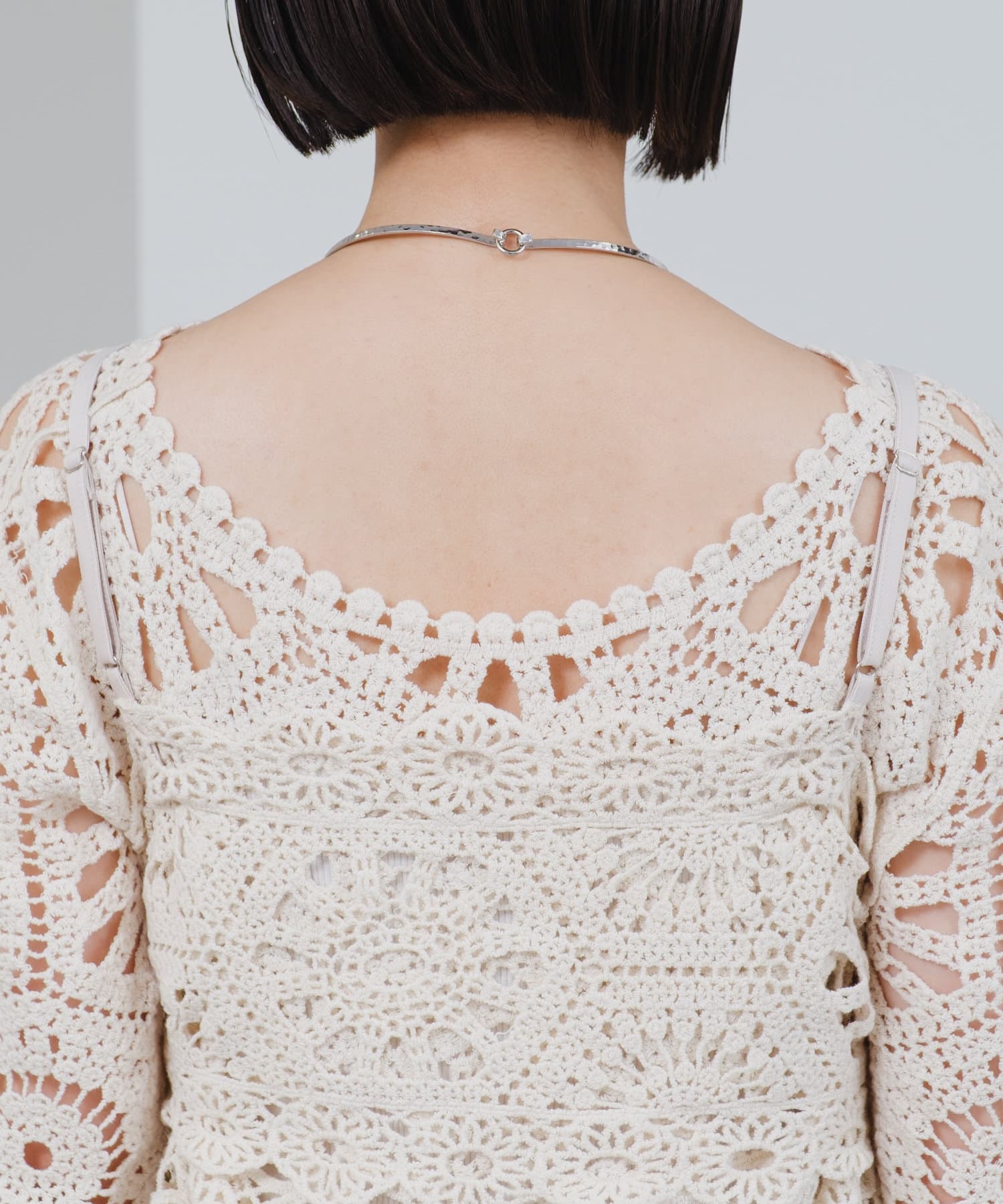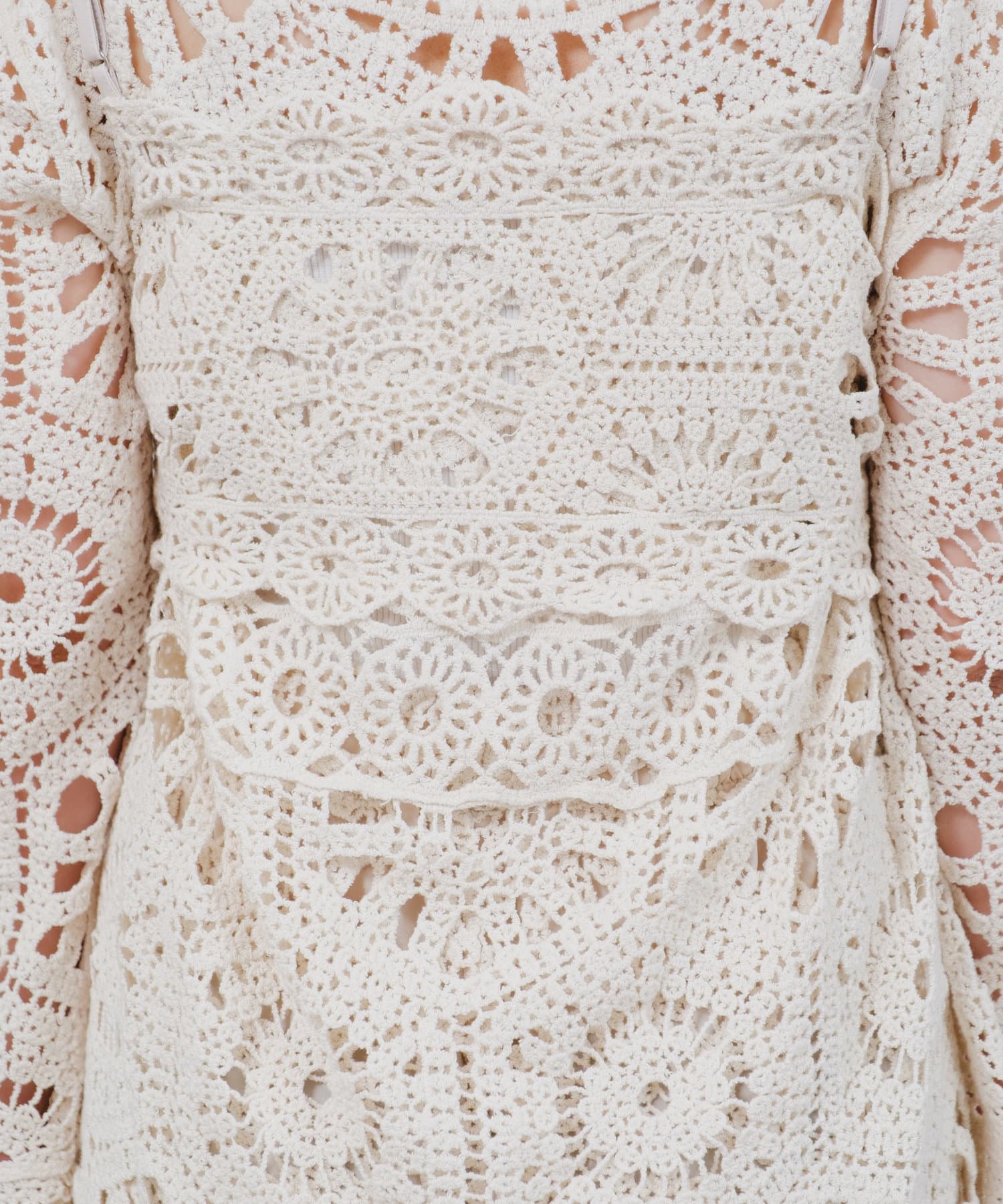 クロシェ編みのブラウスとビスチェがセットになったトップス。