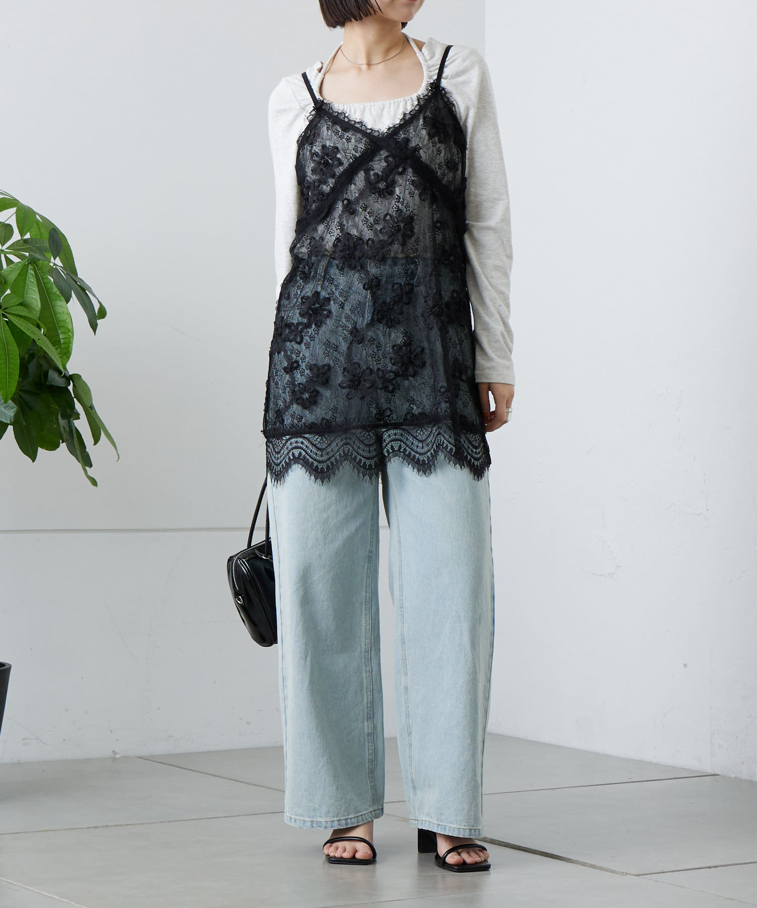 レース素材のキャミで暑い日でも可愛くレイヤードして着れます。