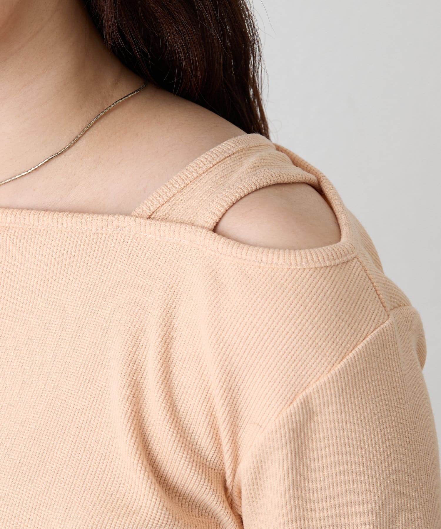 オフショル風の程よい肌見せと、裾のスリットで大人も着やすい抜け感が出ます◎