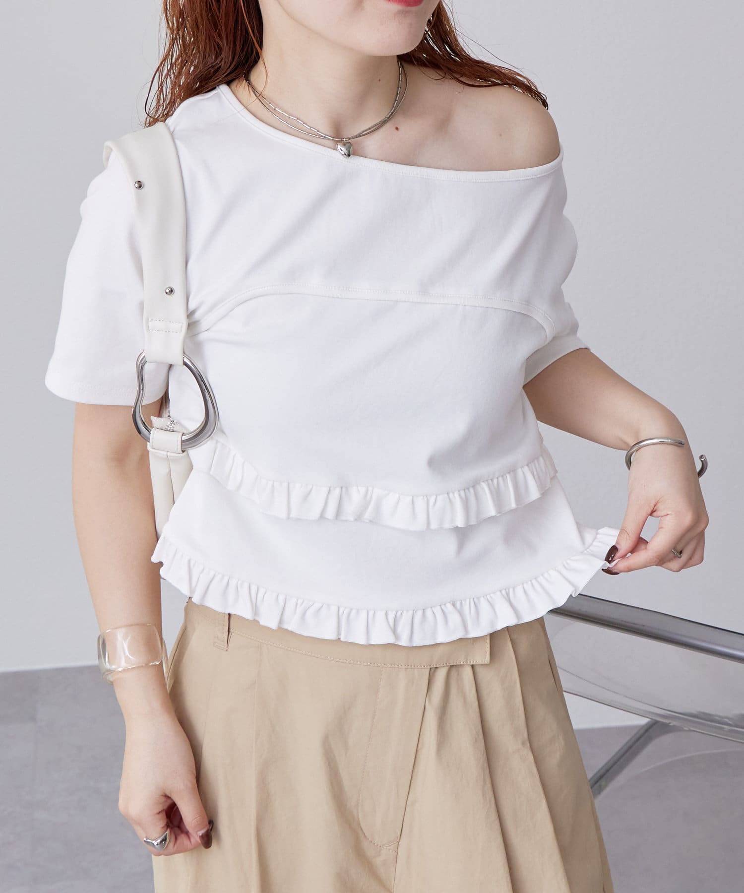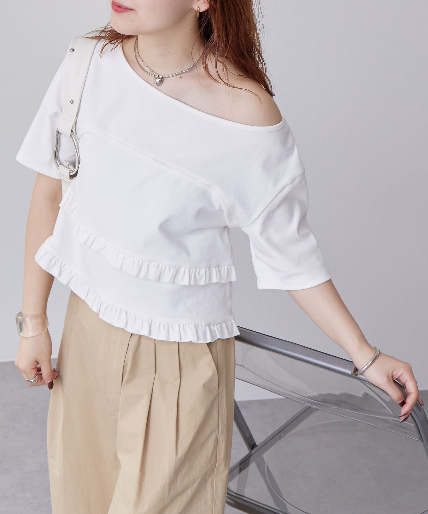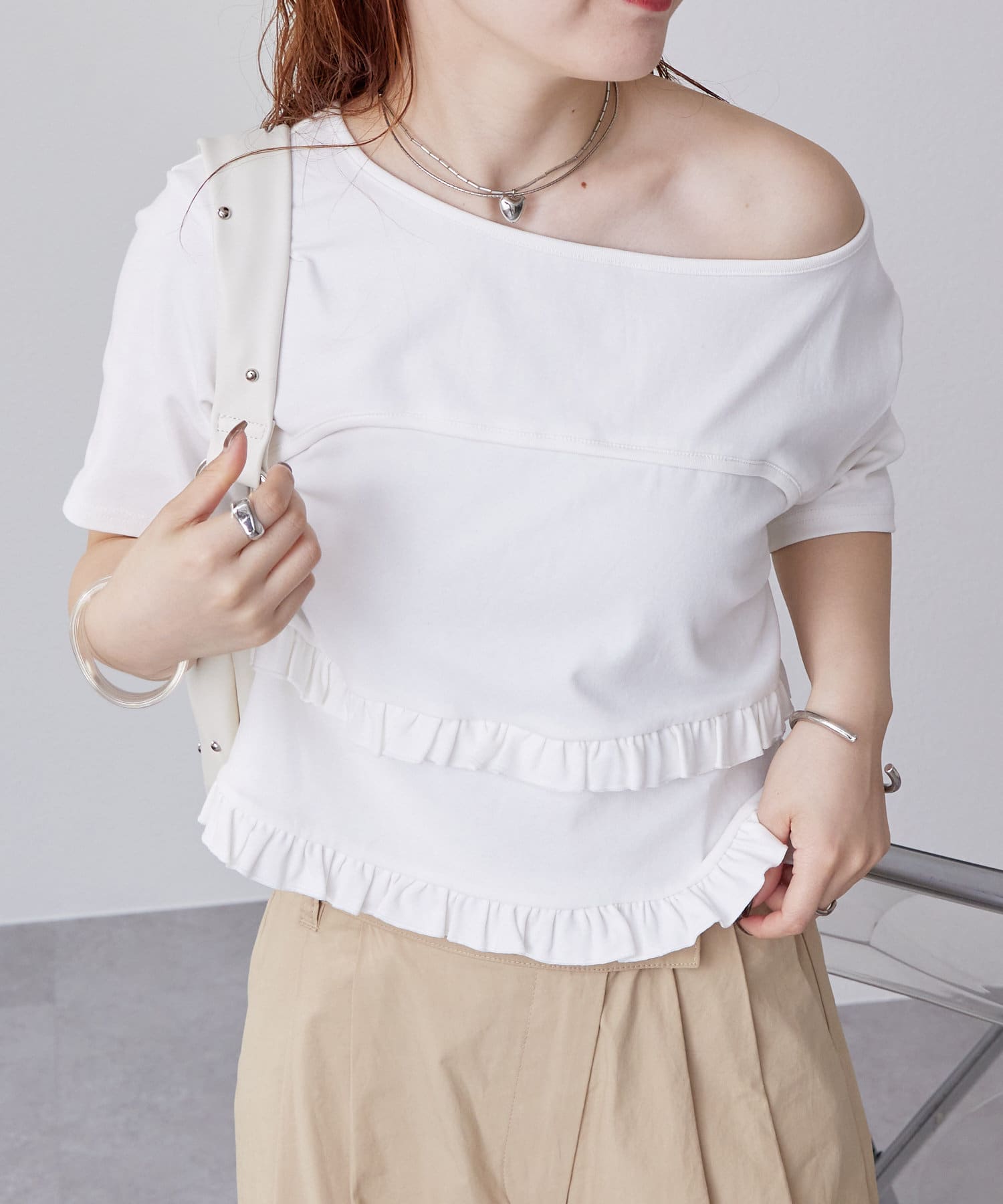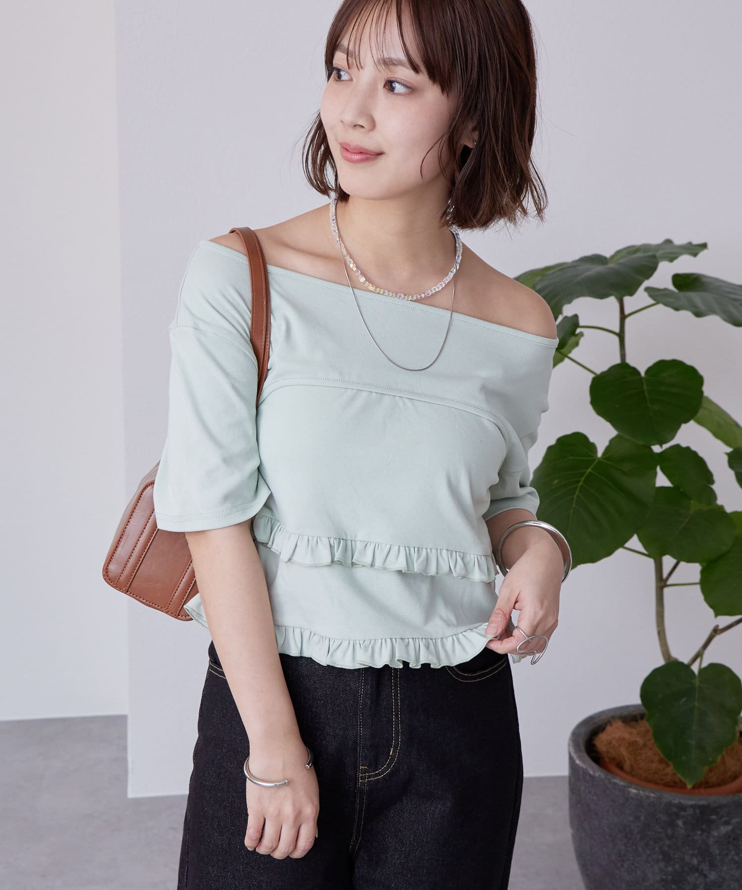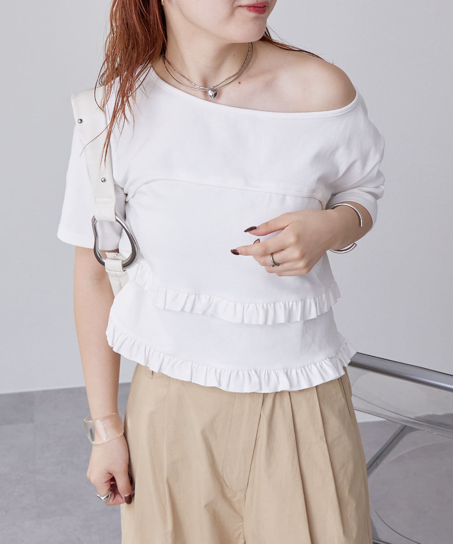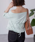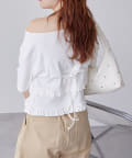 伸縮性のある素材感なので、肩を落としてワンショルやオフショルにして着ていただけます♡