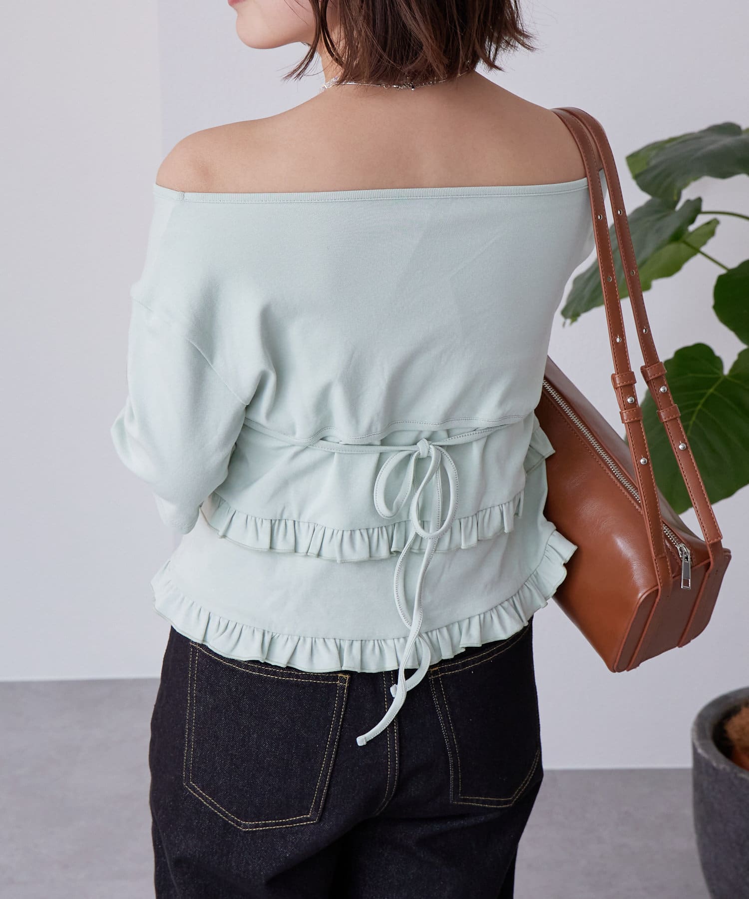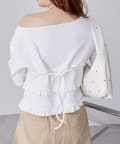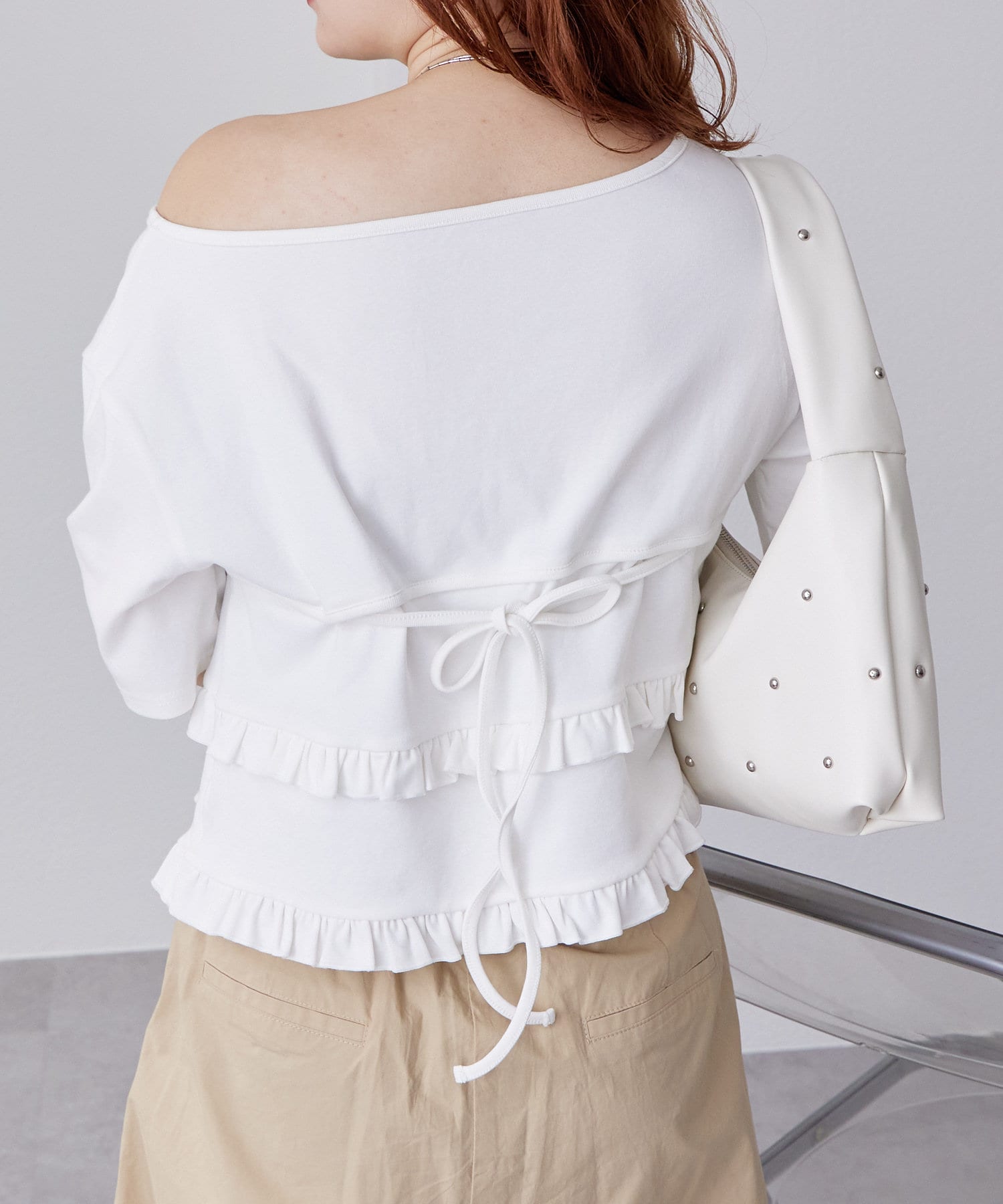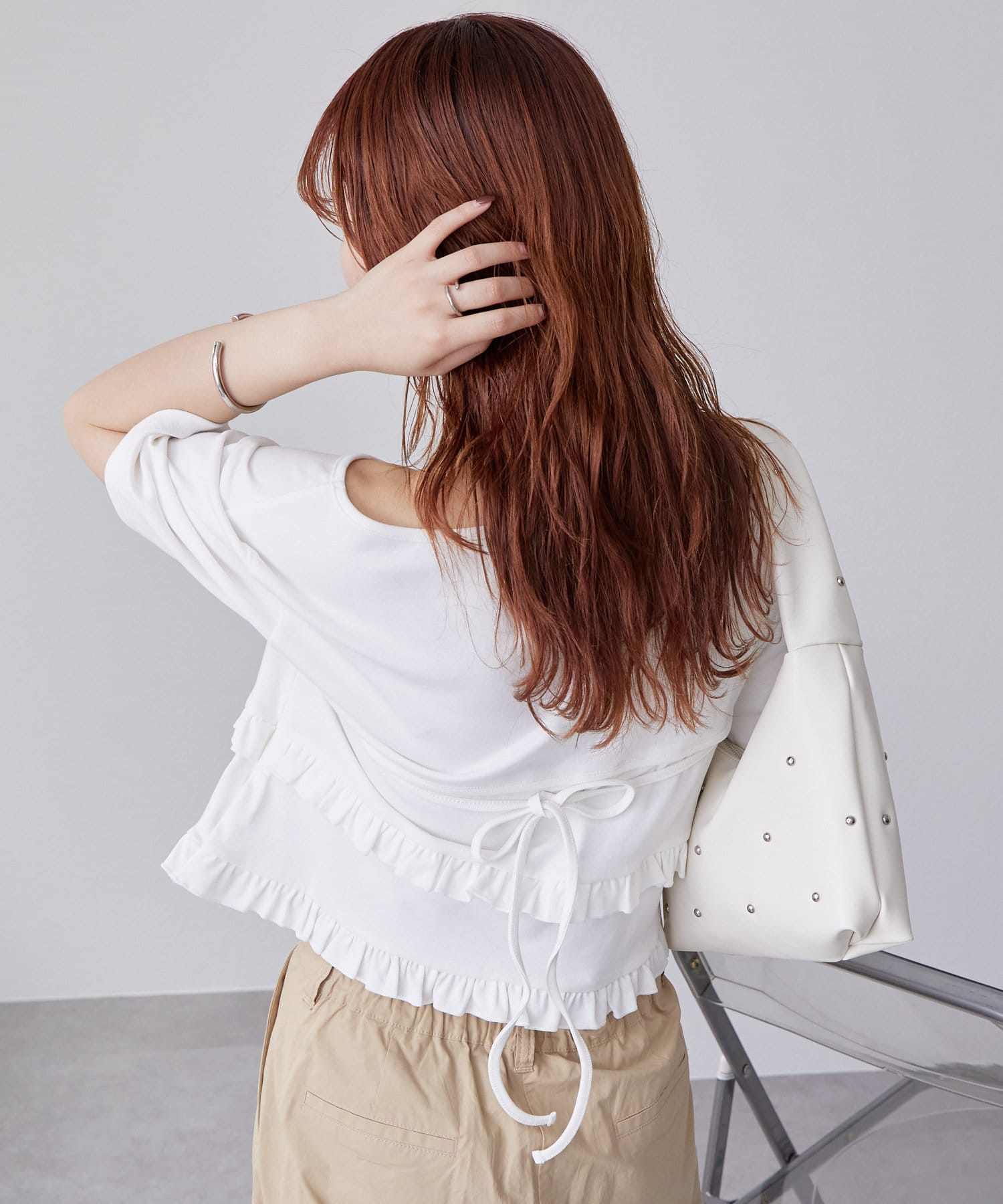 バックスタイルにリボンで結ぶデザインが施されており、後ろ姿も魅力的なTシャツ。