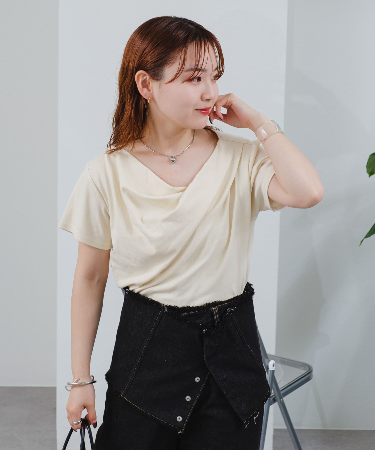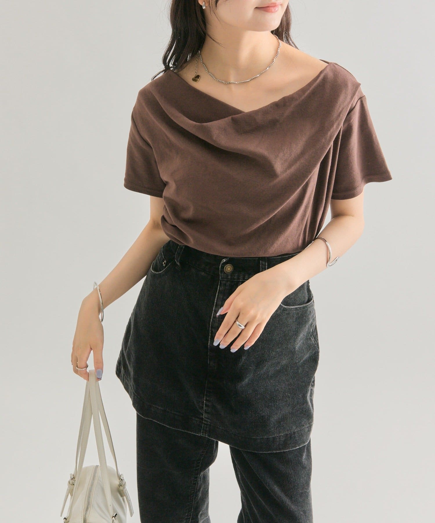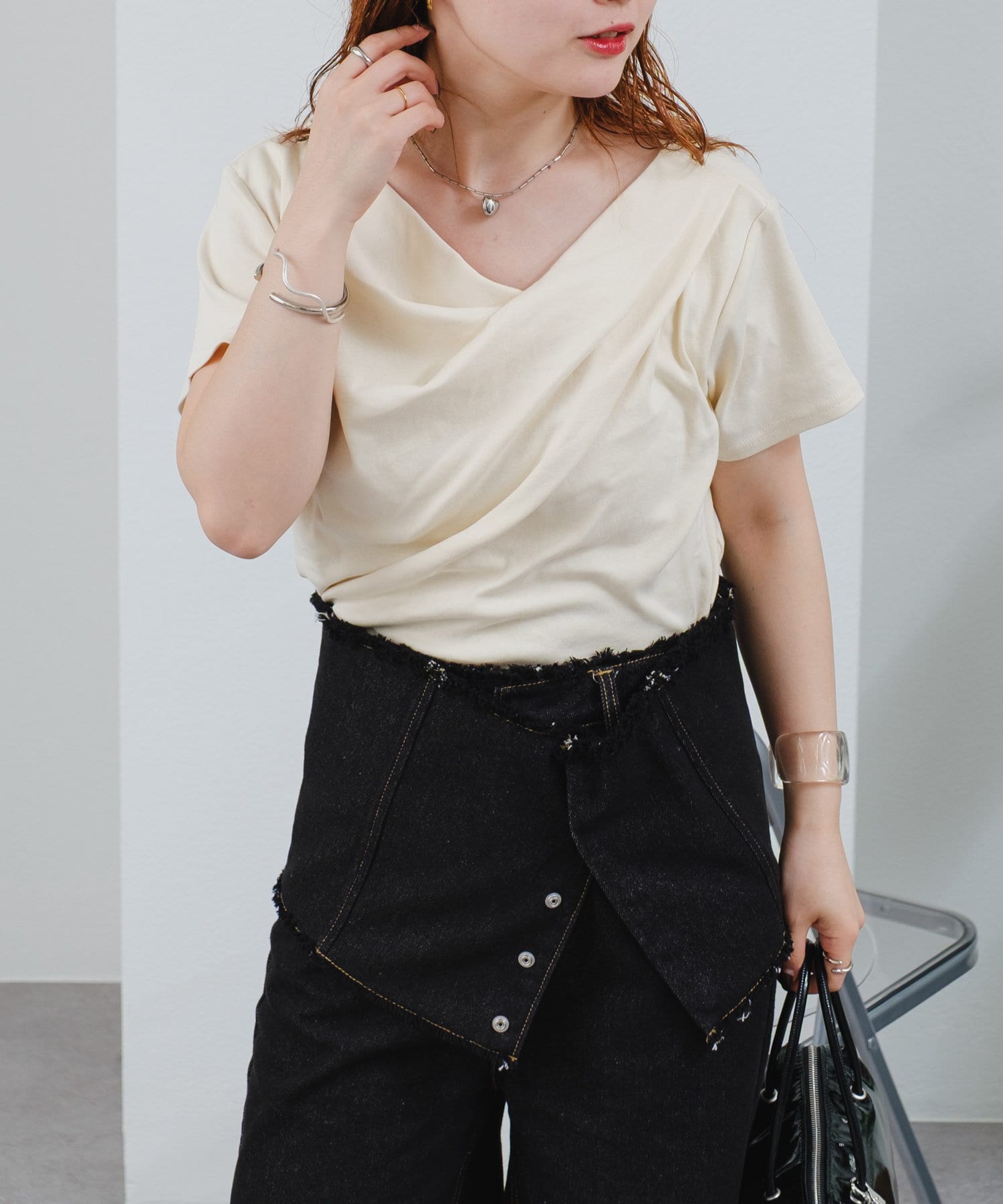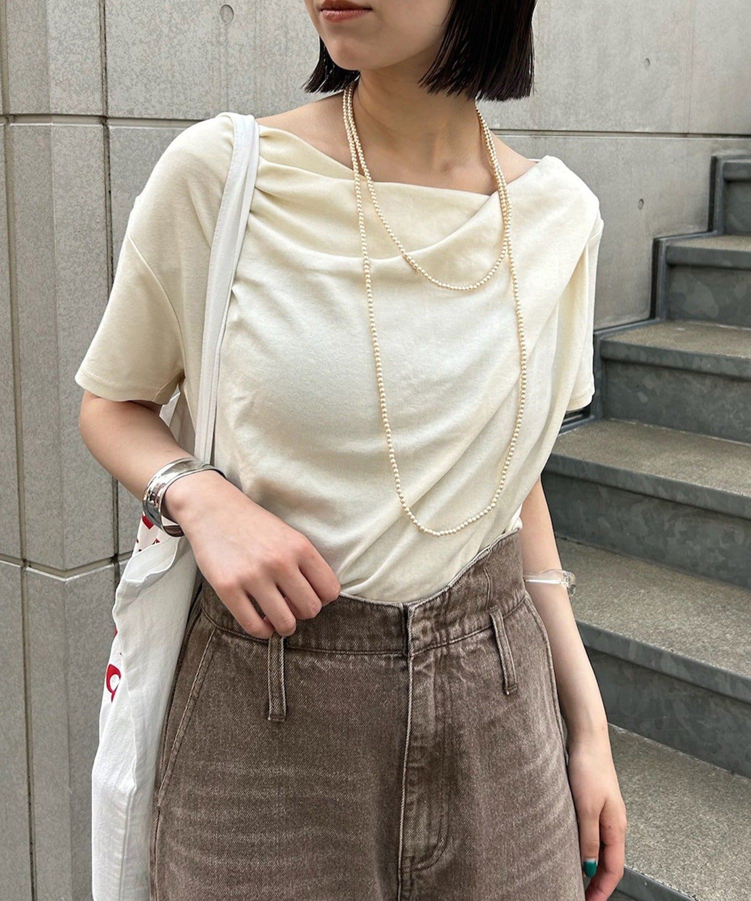 オフショルや、ワンショルダースタイルで顔まわりをスッキリさせるスタイリングを!