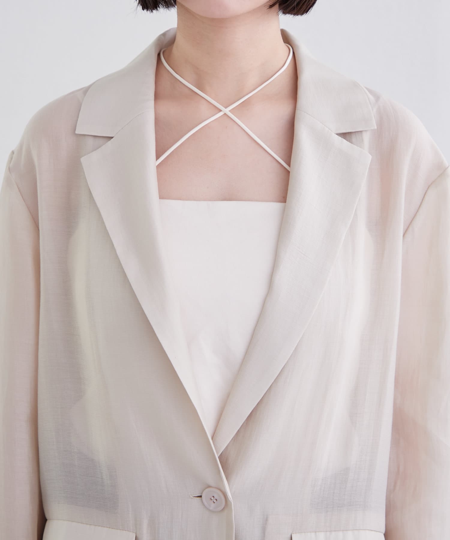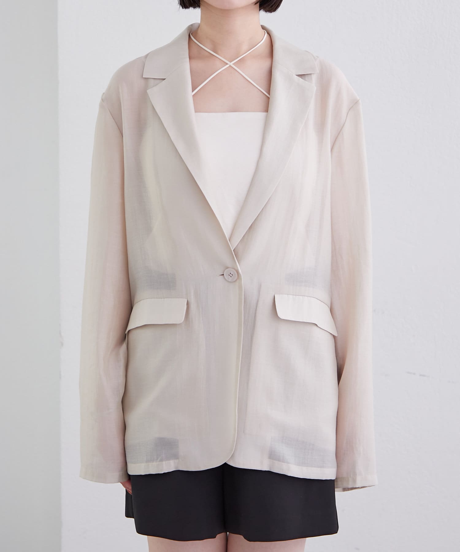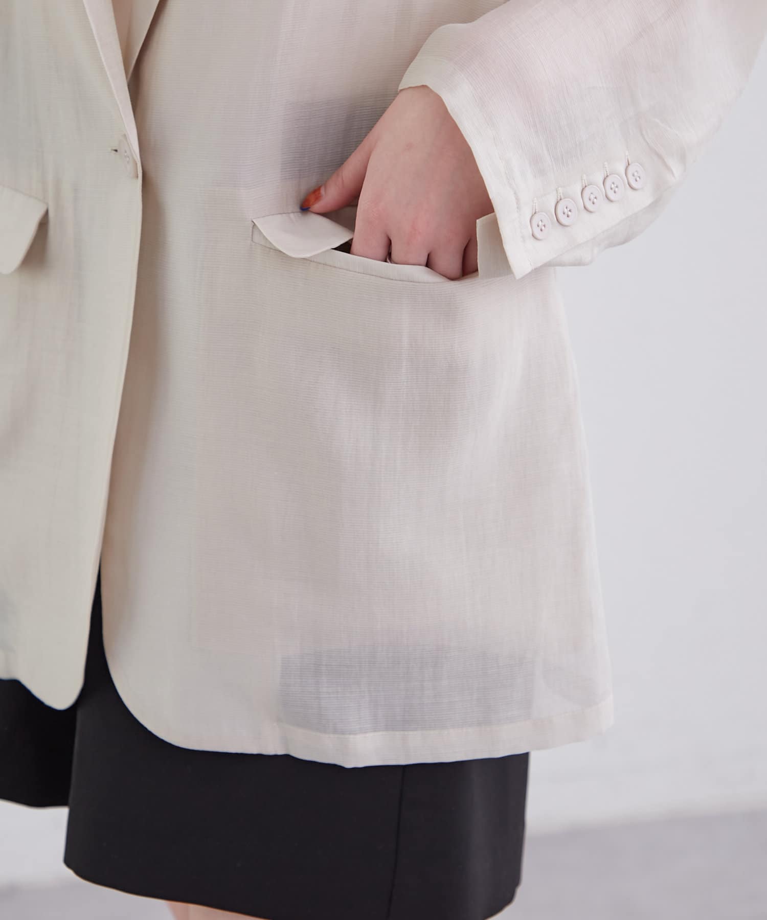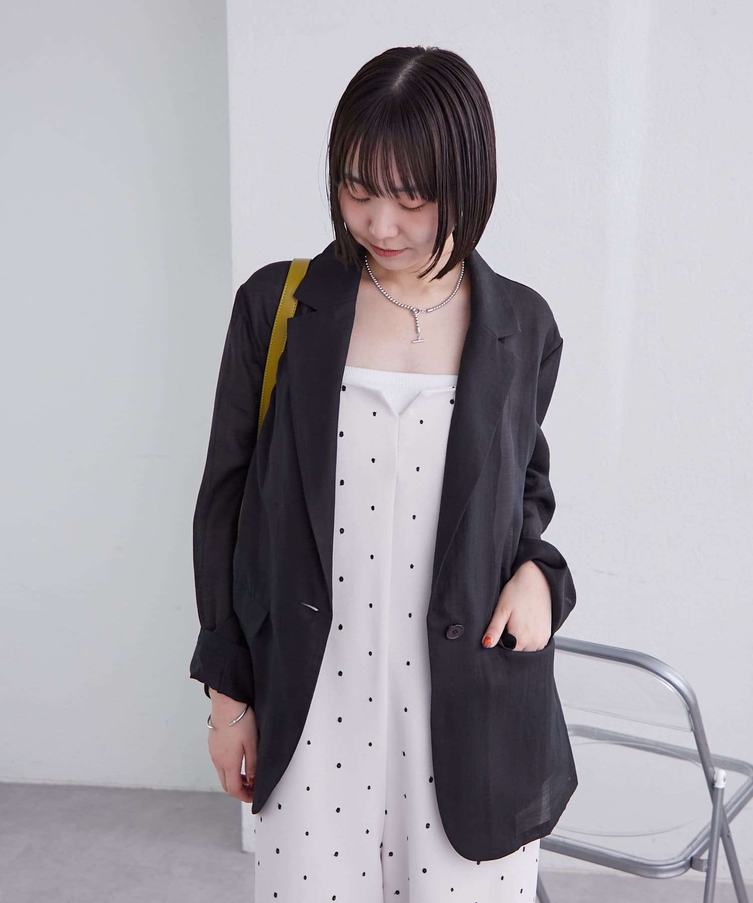 ベーシックなテーラードデザインながらも、薄手のポリエステル素材で透け感と軽やかな落ち感がポイント◎