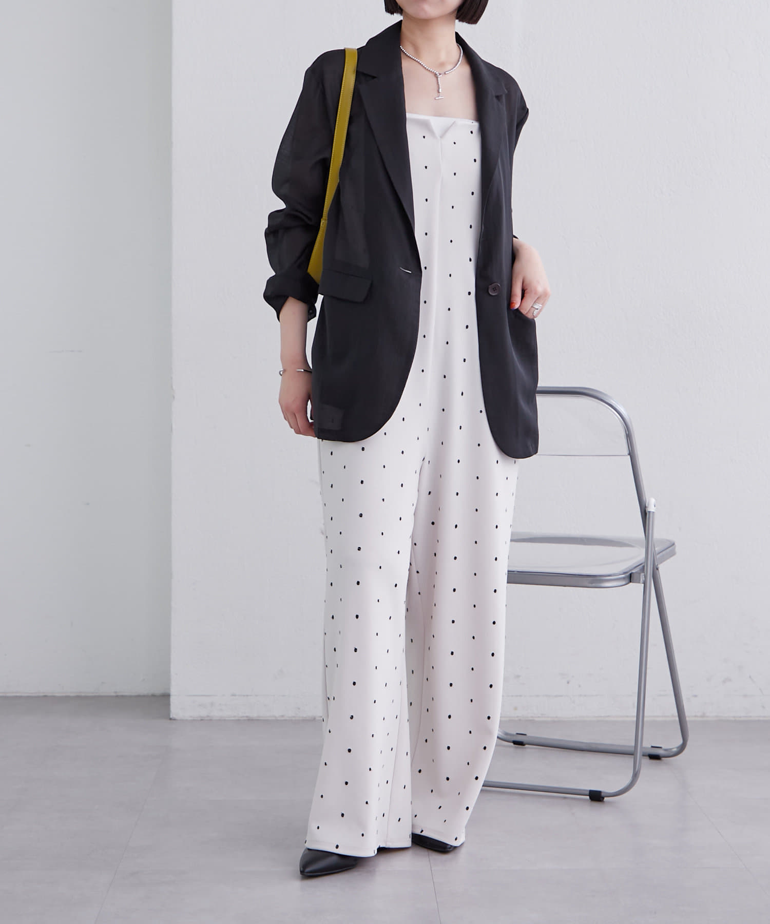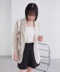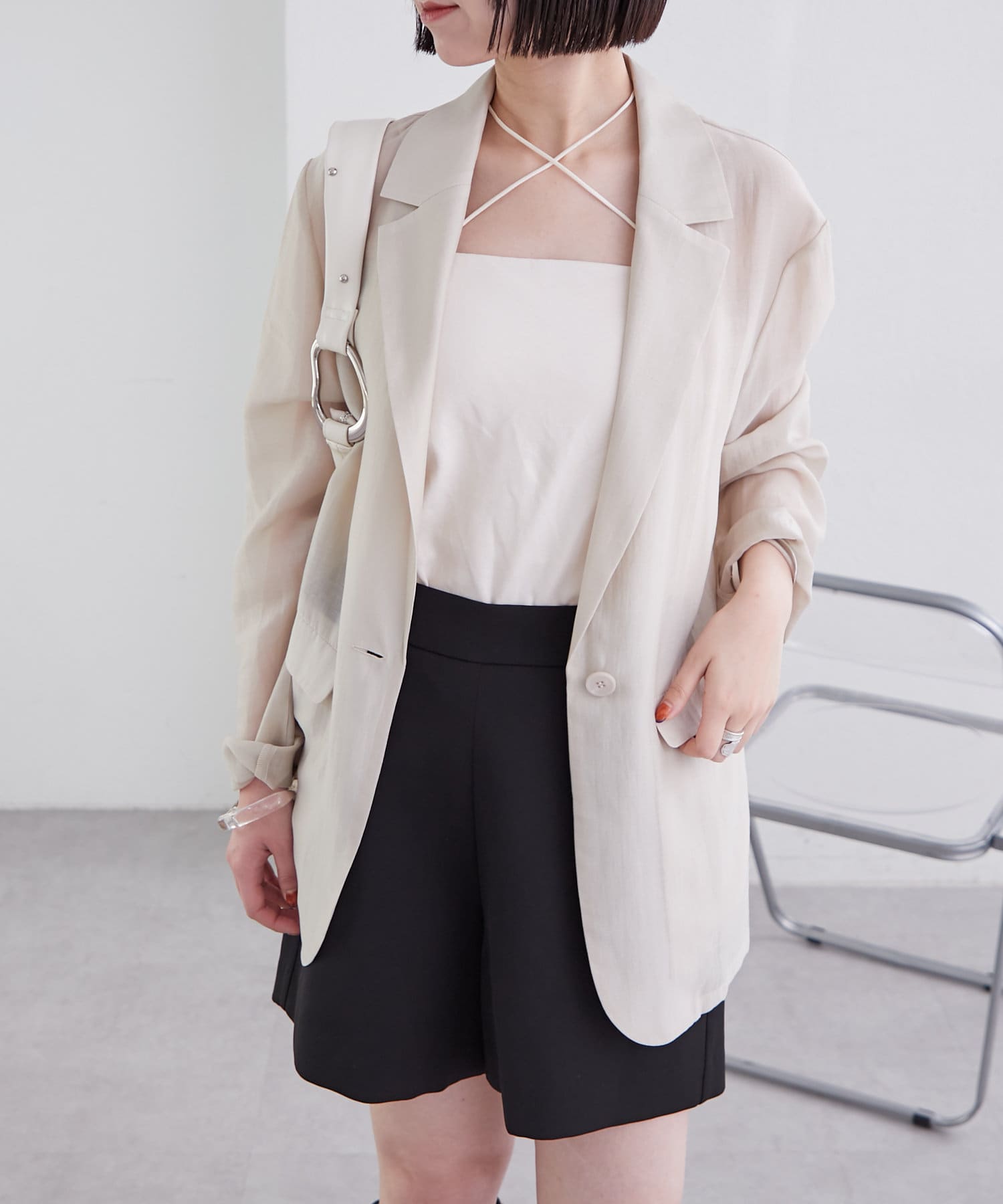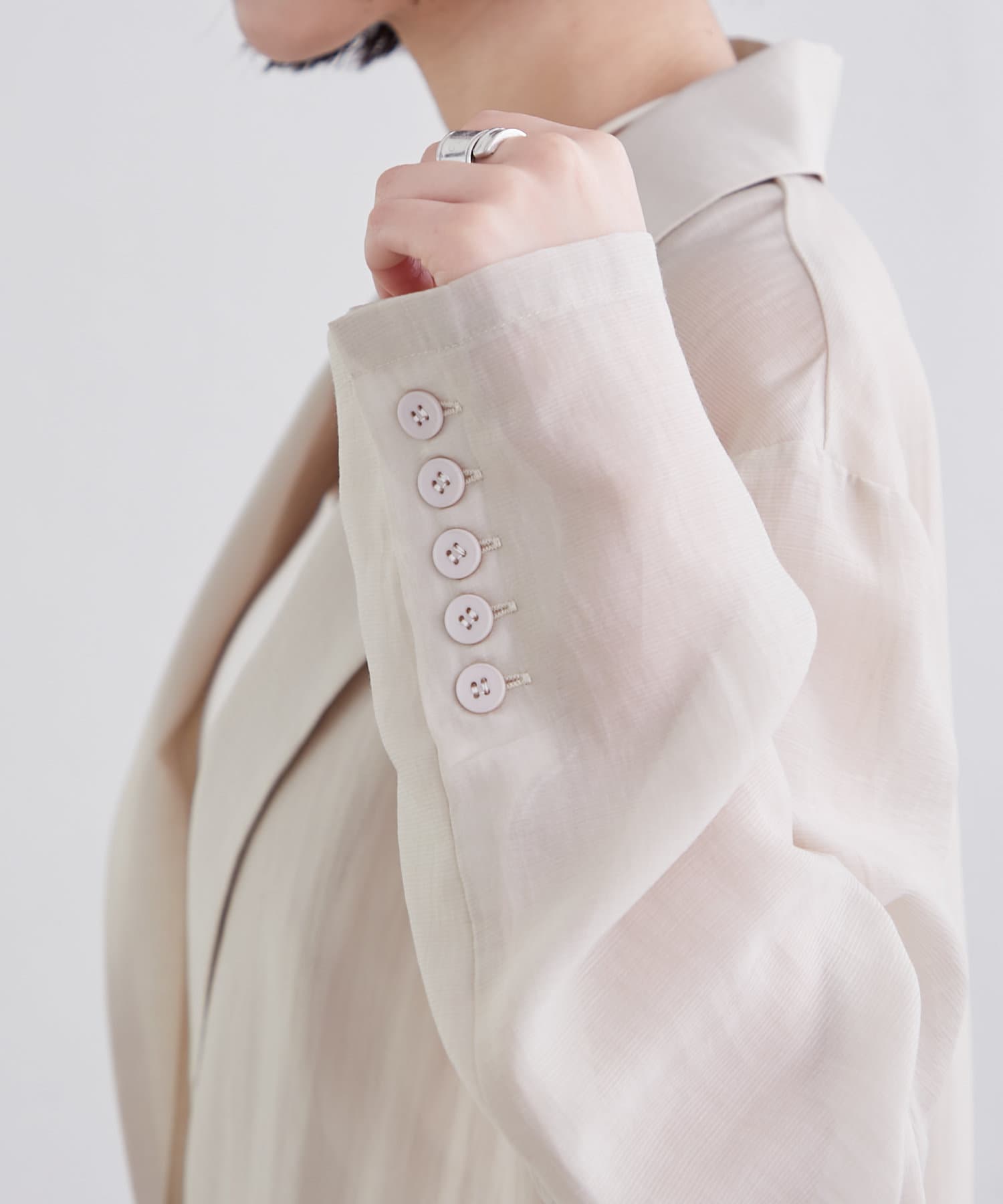 ベーシックなテーラードデザインながらも、薄手のポリエステル素材で透け感と軽やかな落ち感がポイント◎