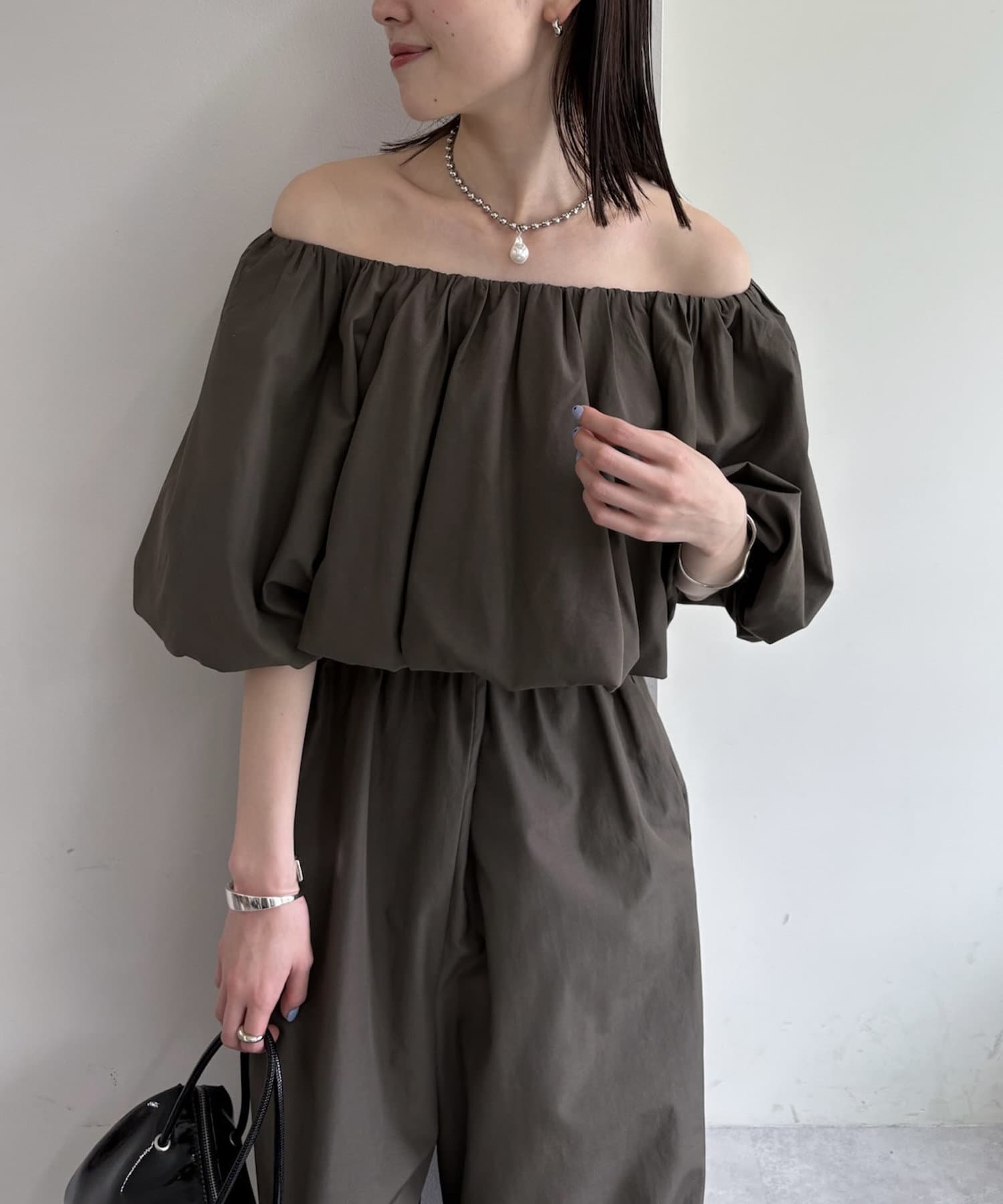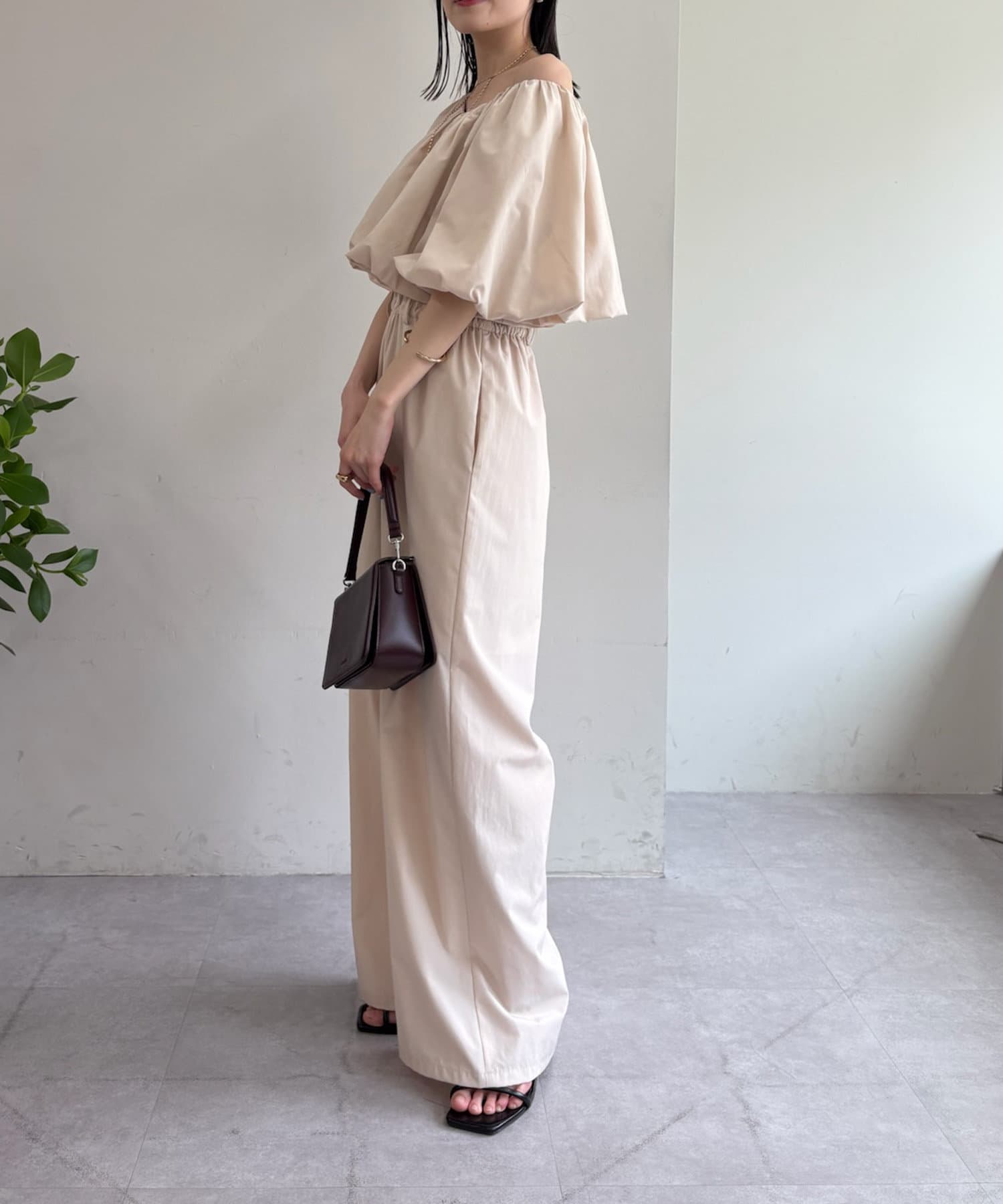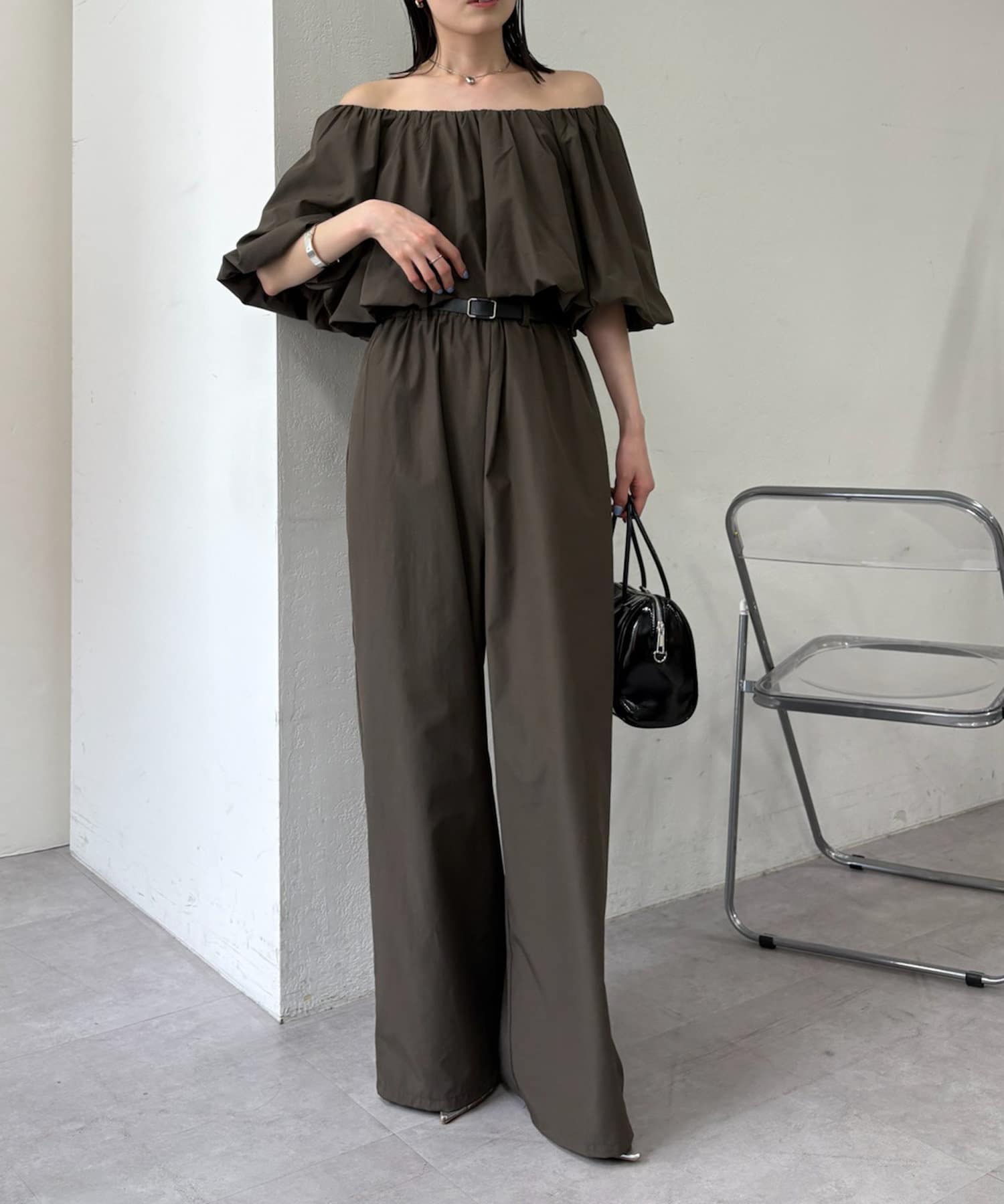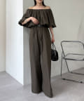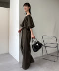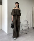肩を落としたオフショルダーデザインが女性らしい、リラックス感のあるオールインワン。