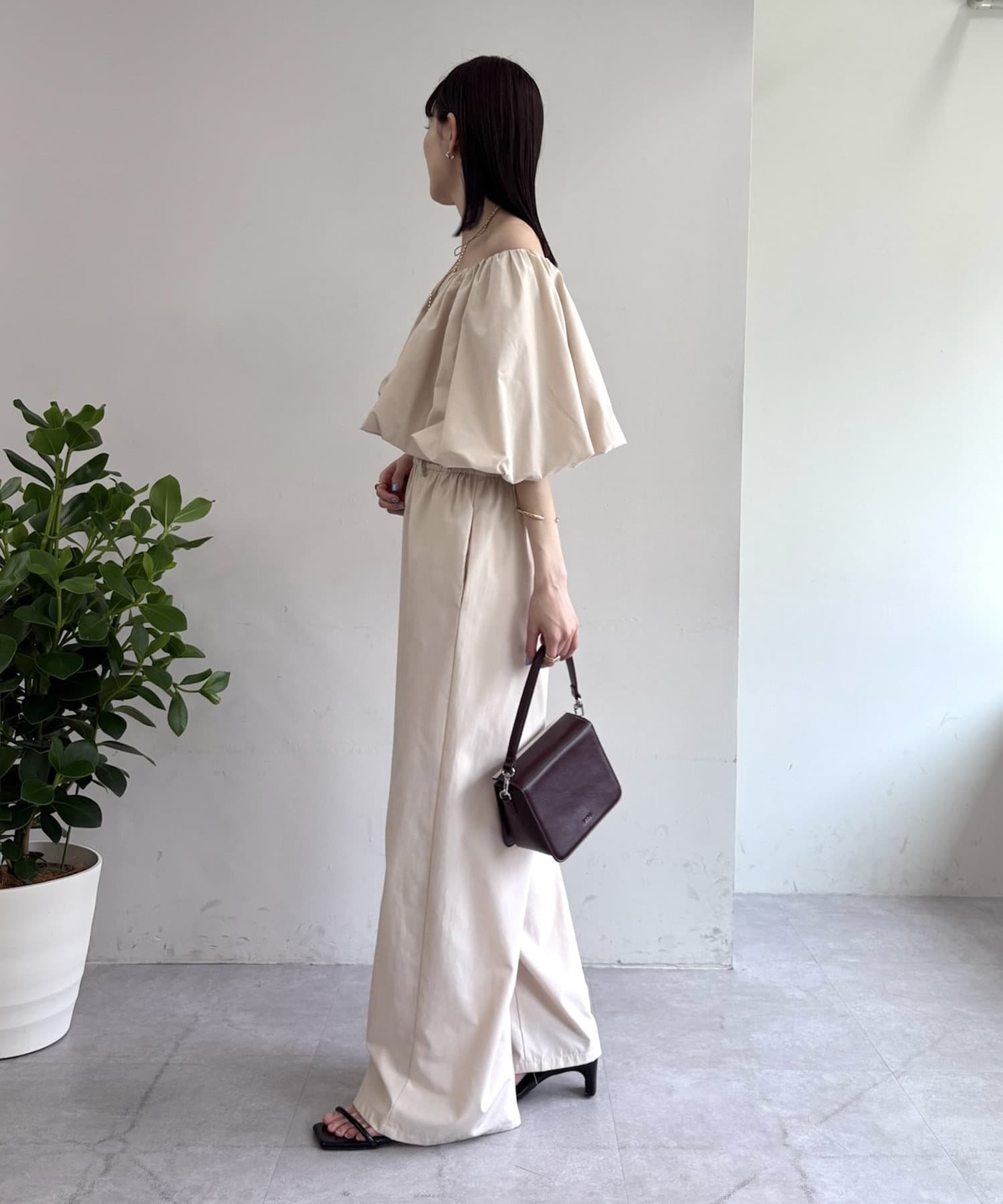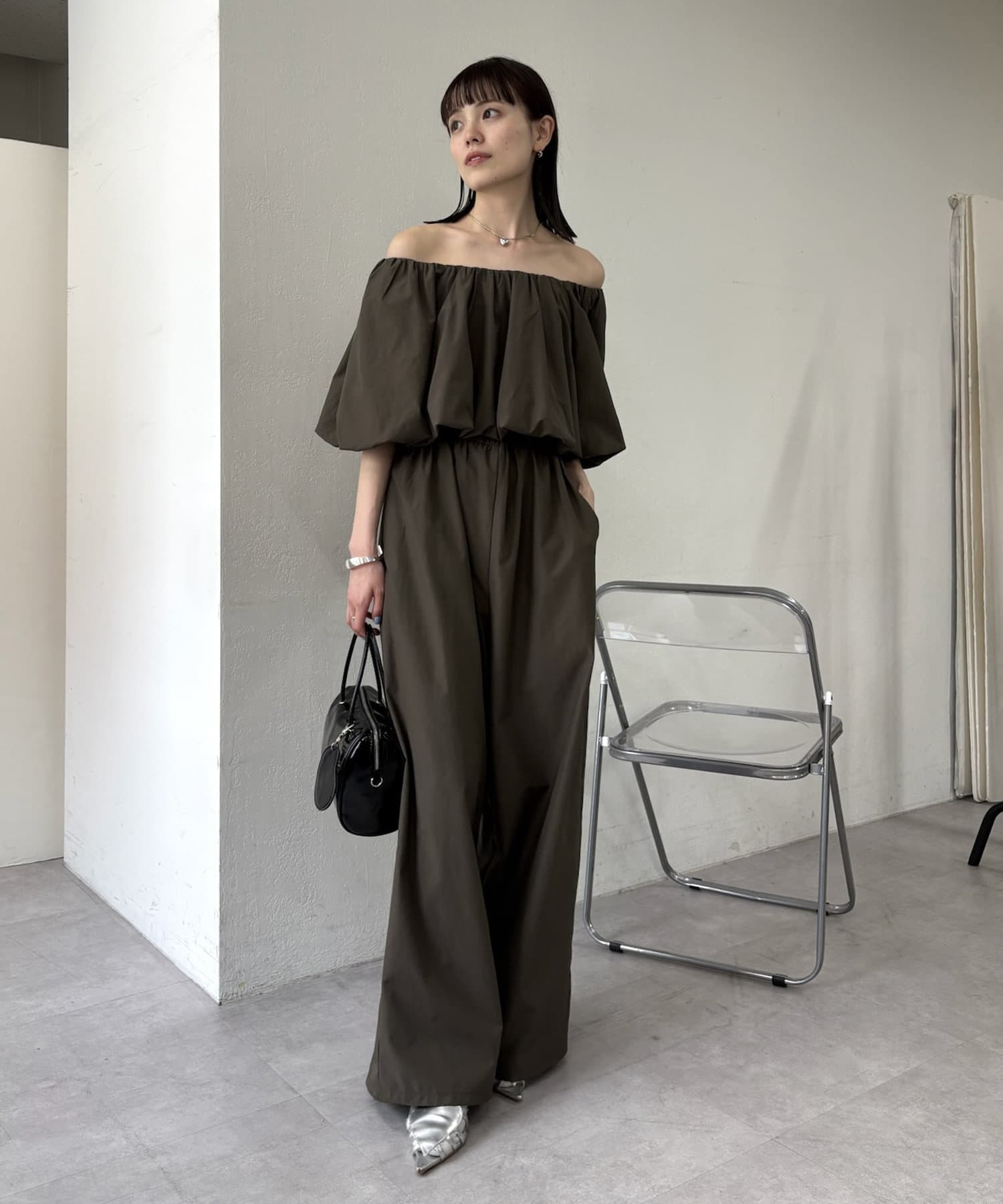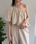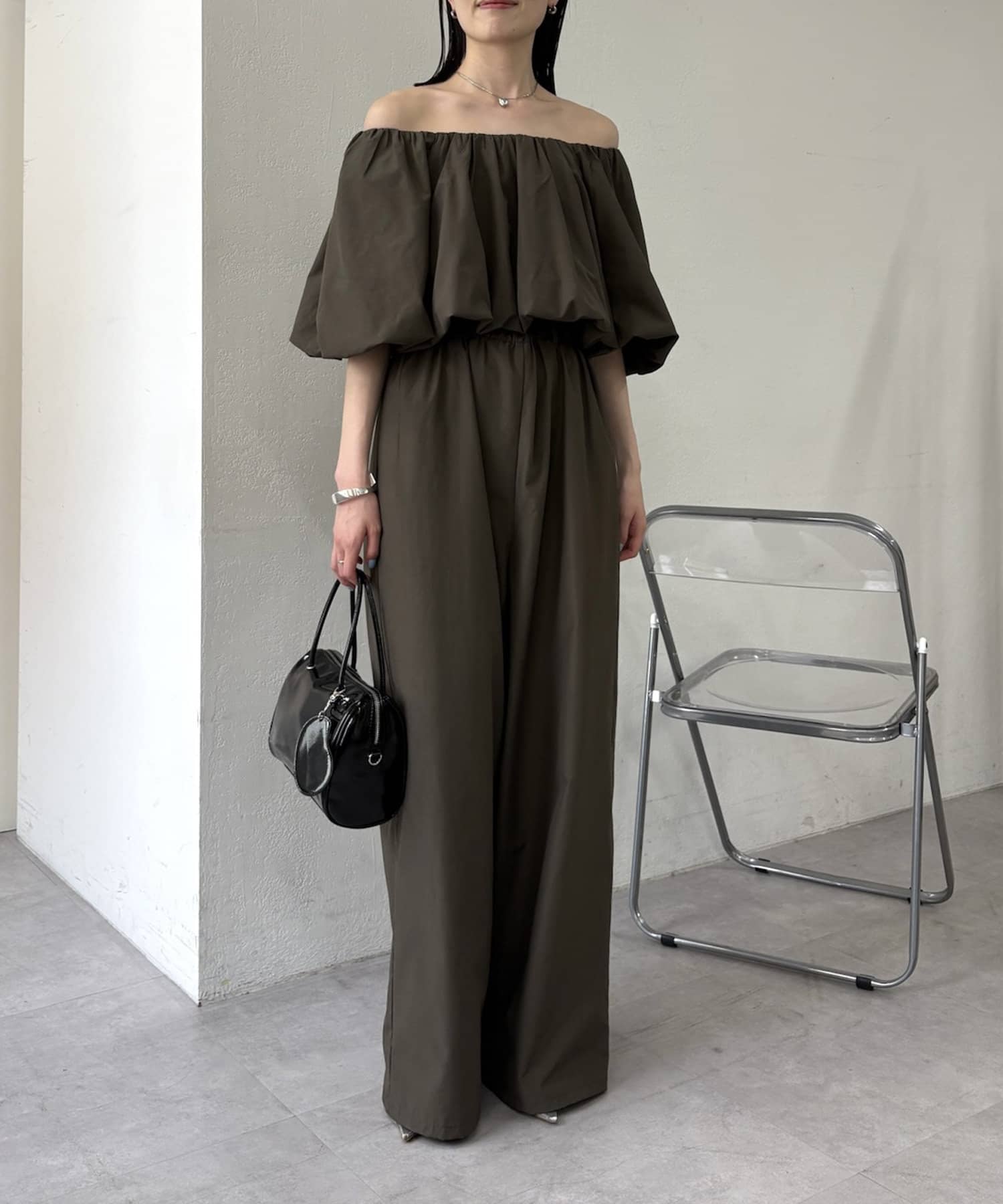 肩を落としたオフショルダーデザインが女性らしい、リラックス感のあるオールインワン。