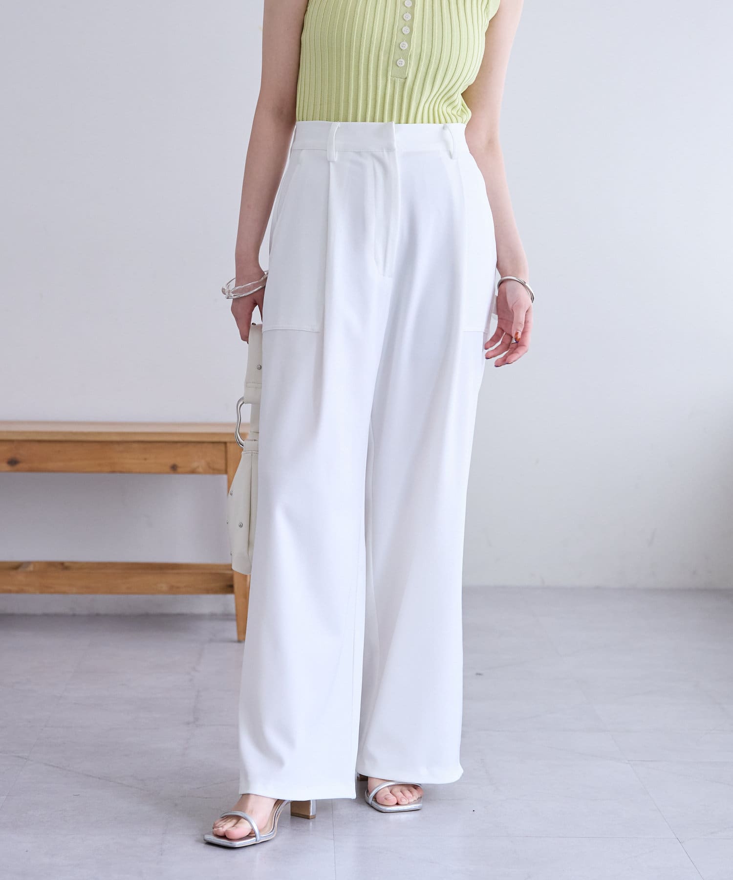センタープレスが入っているので、ワークパンツデザインながらシャープで洗練された印象のスラックス。