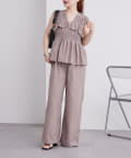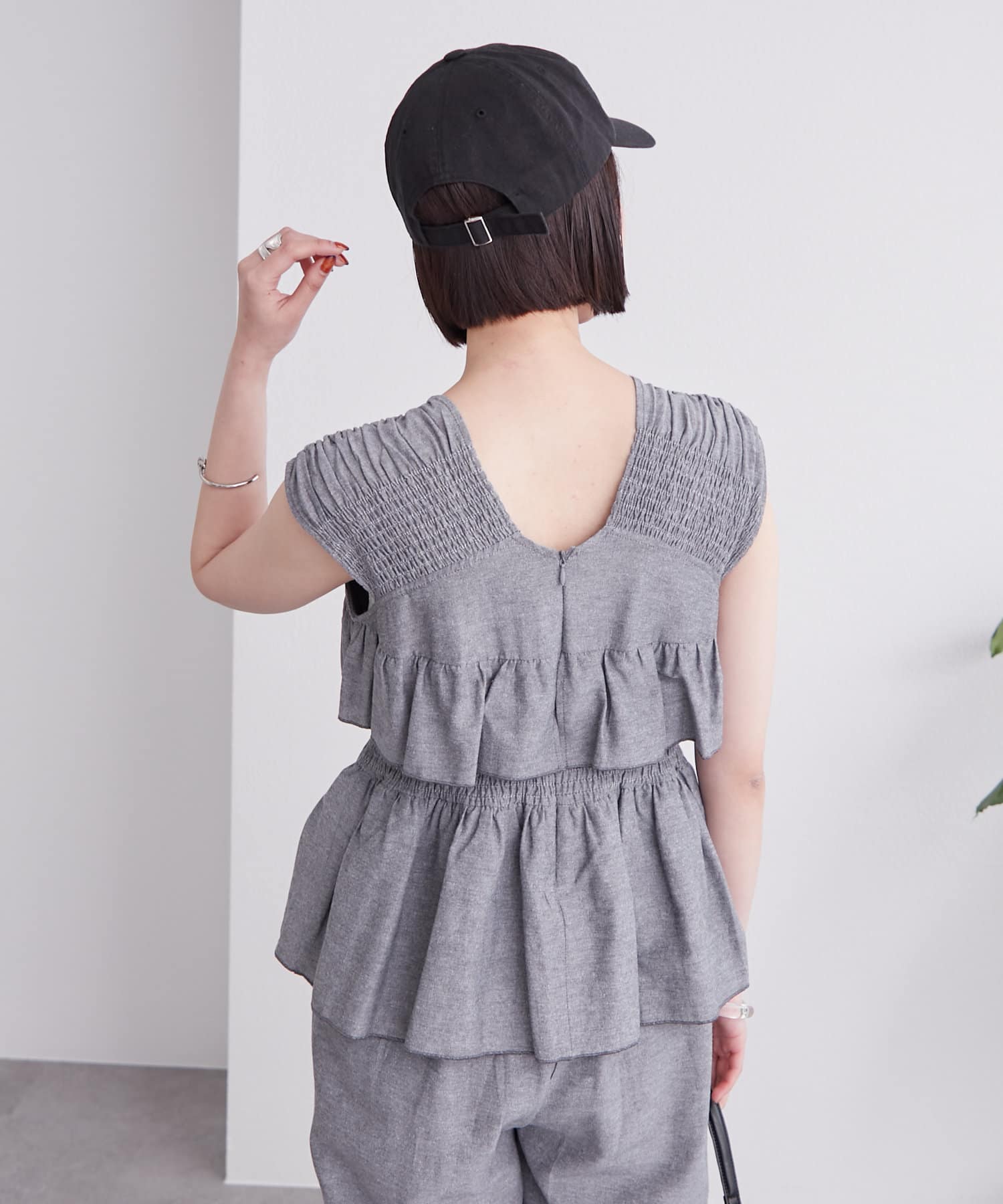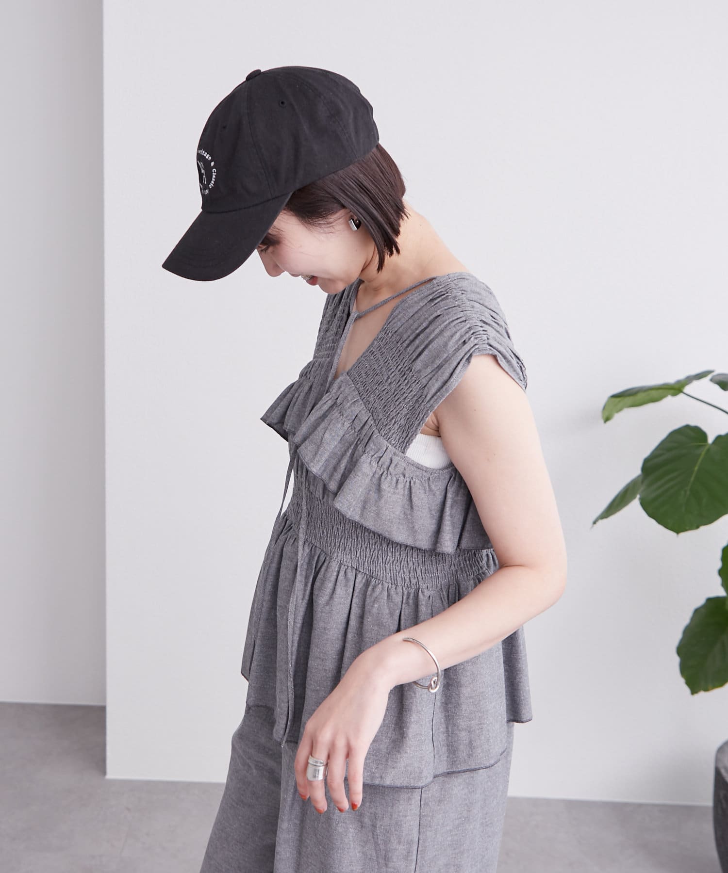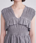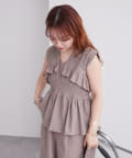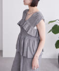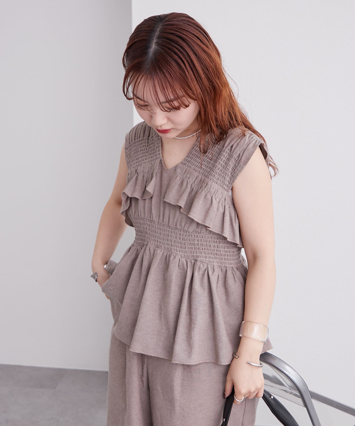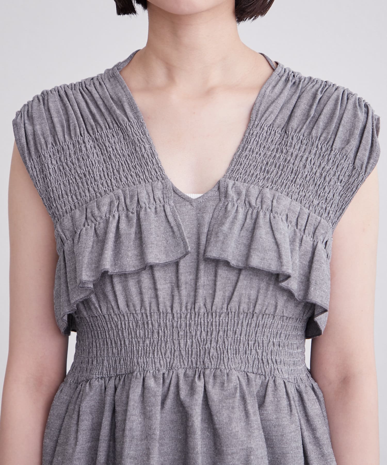 Vネックデザインがデコルテを綺麗に見せ、シャーリングとフリルのデザインが魅力的な1着です。