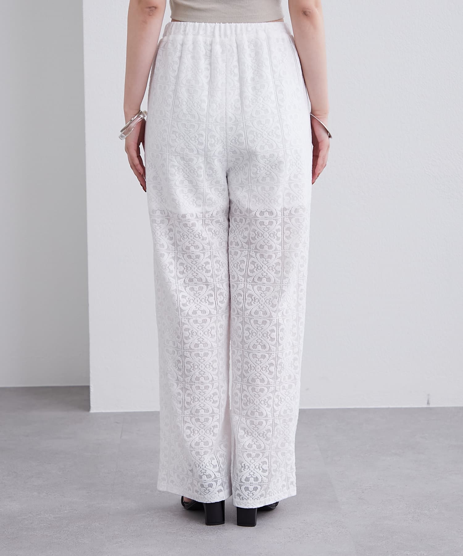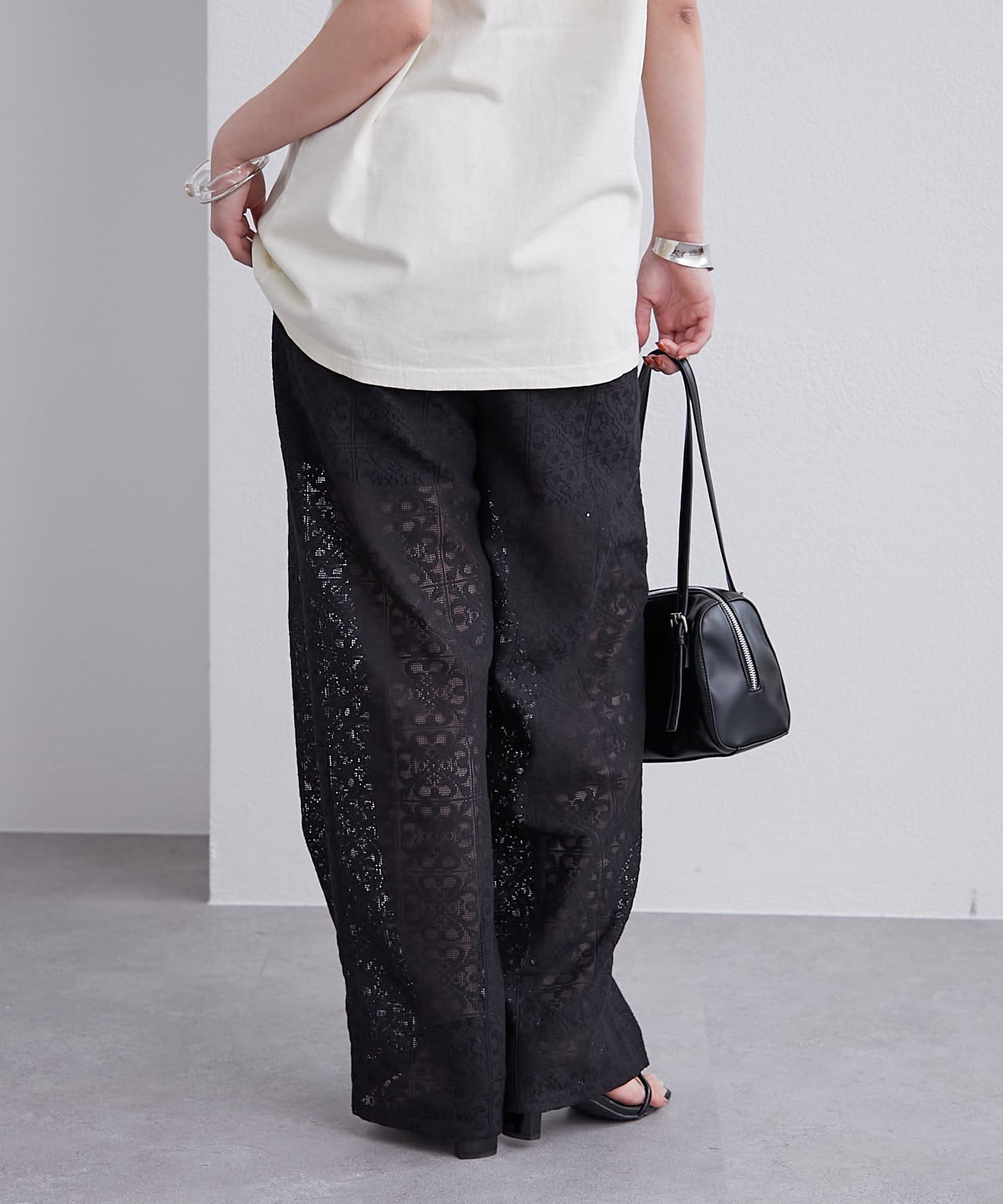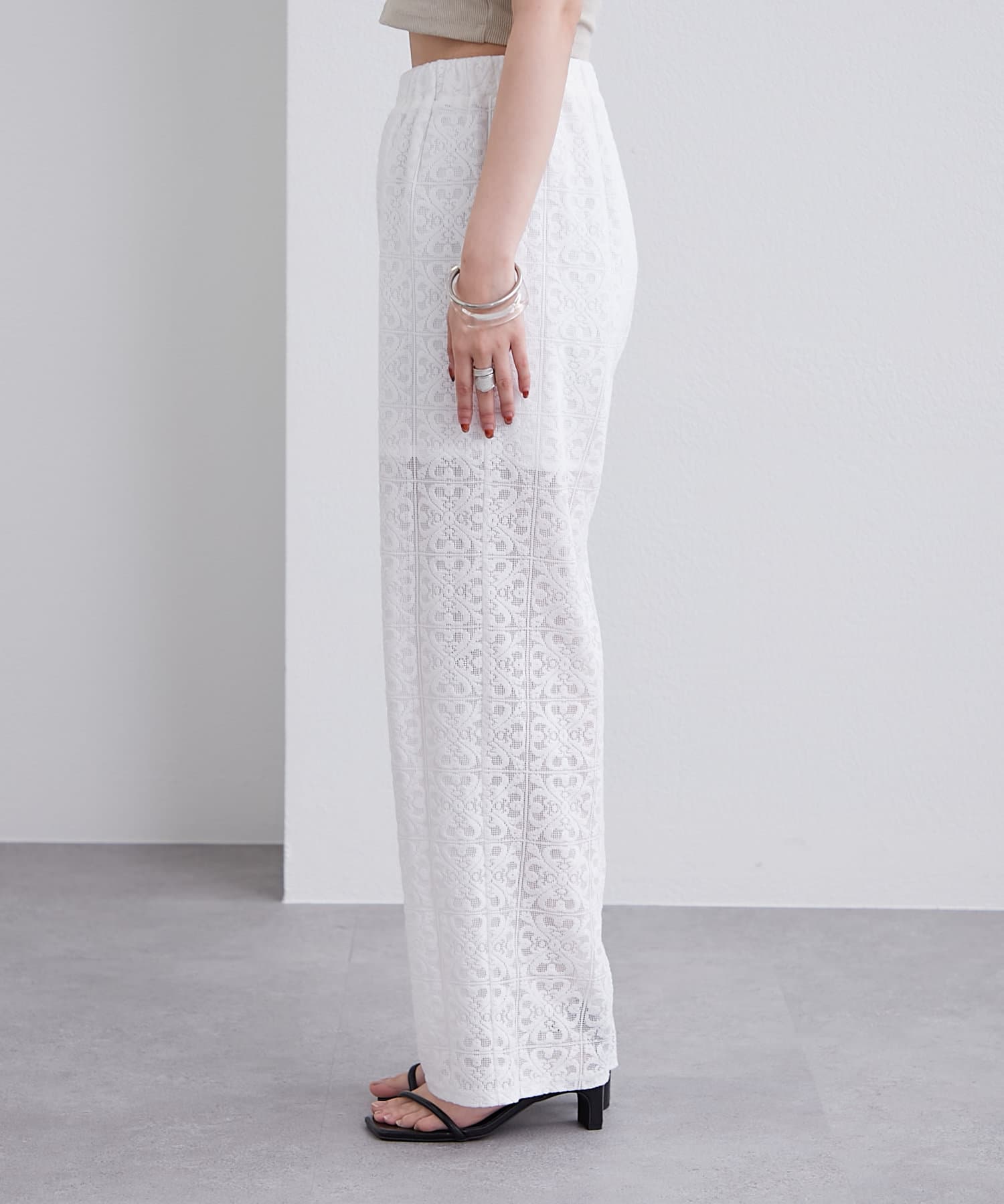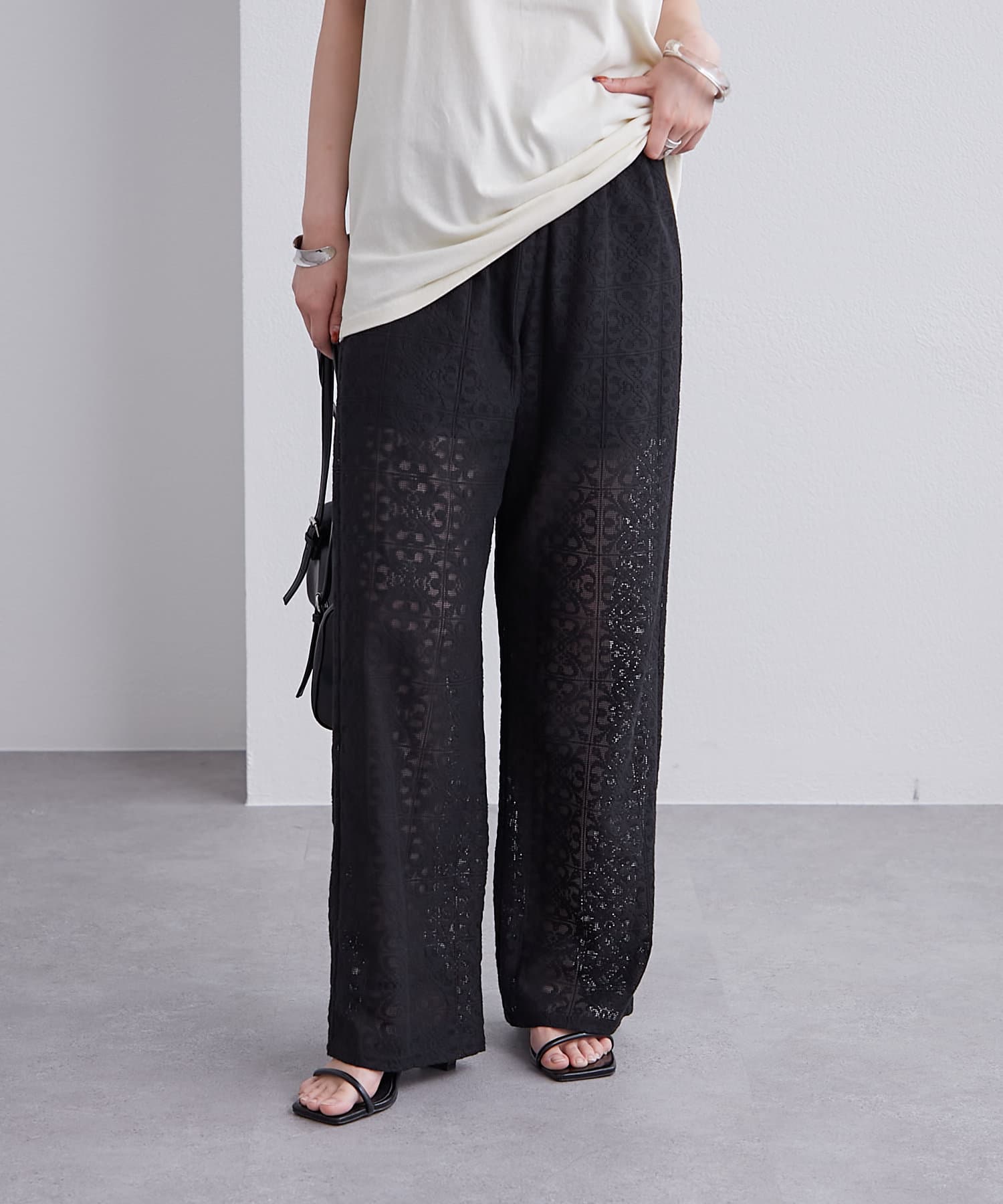 透け感のある素材とストレートシルエットで、すっきりスタイルアップが叶うレースパンツ。
