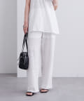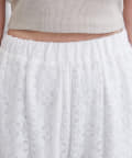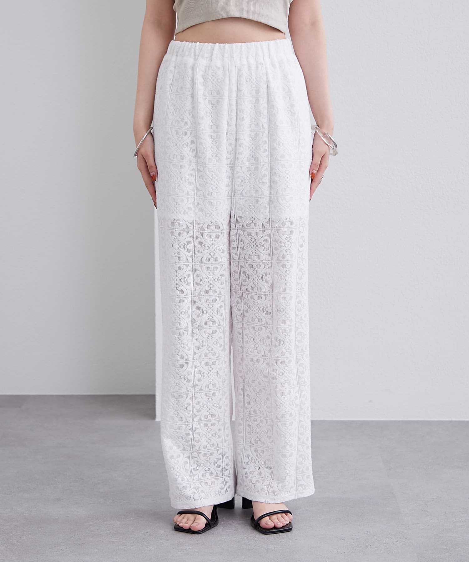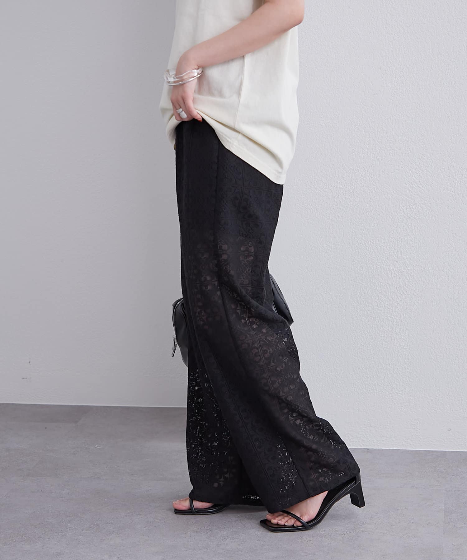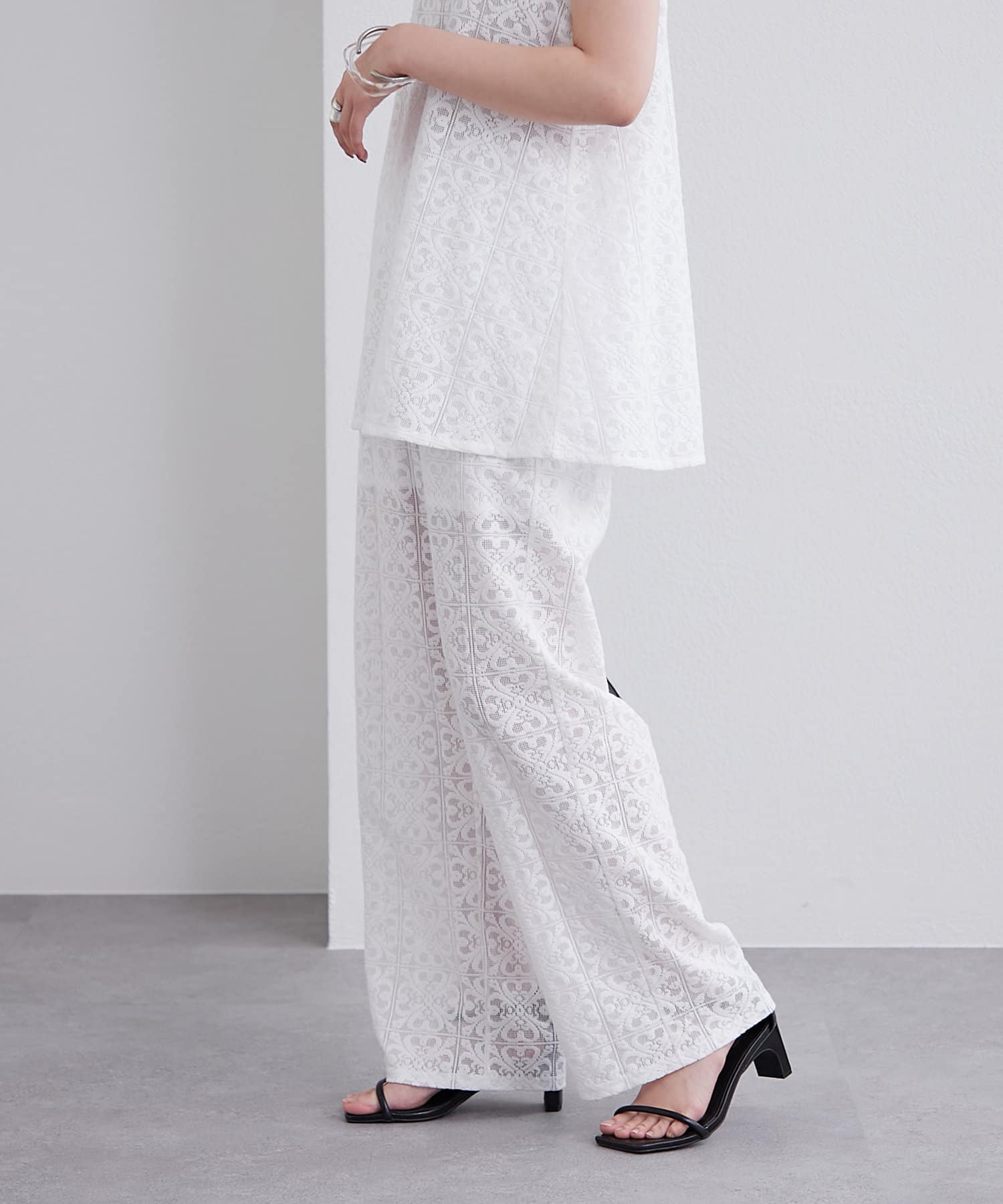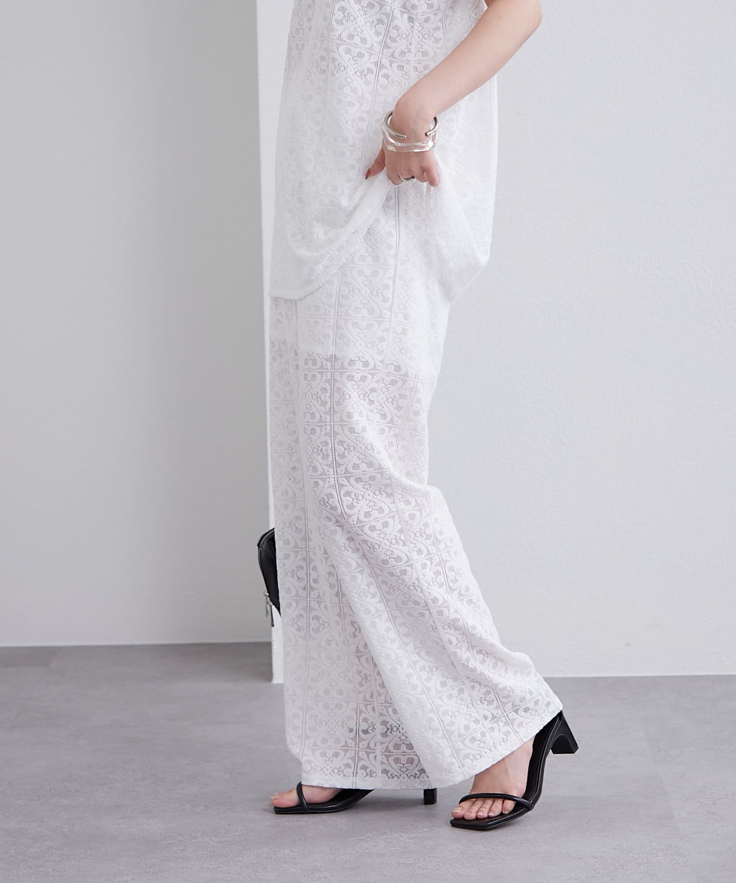 透け感のある素材とストレートシルエットで、すっきりスタイルアップが叶うレースパンツ。