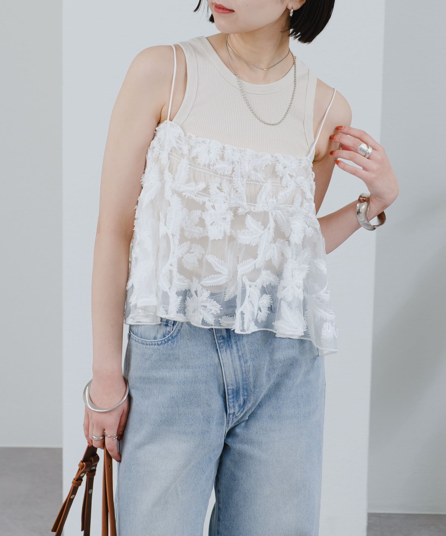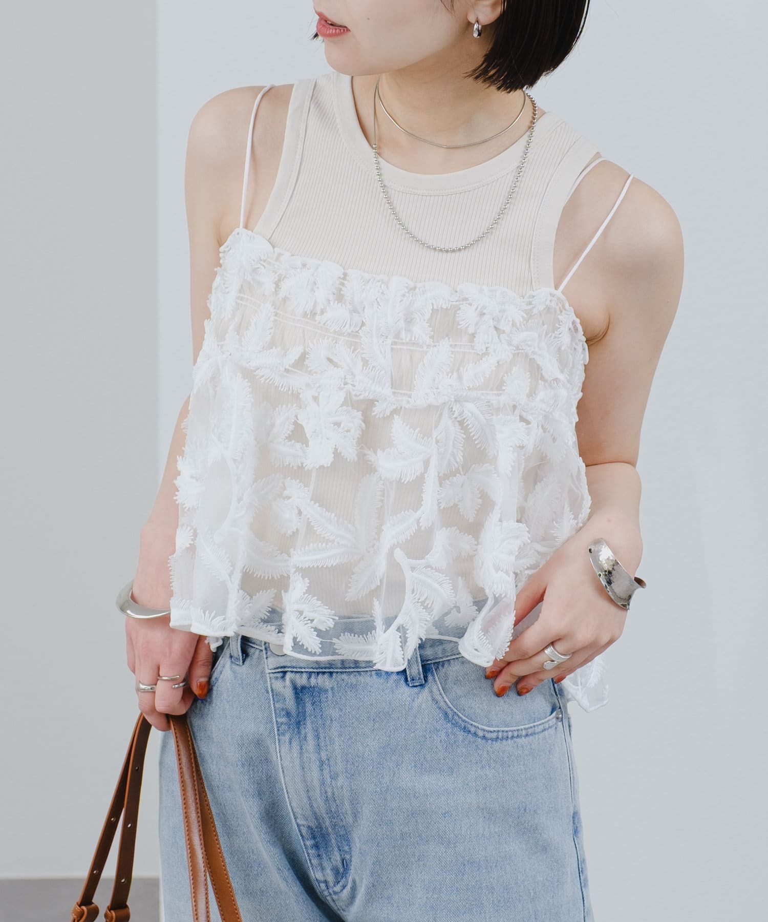 夏はシンプルなTシャツやタンクトップの上に