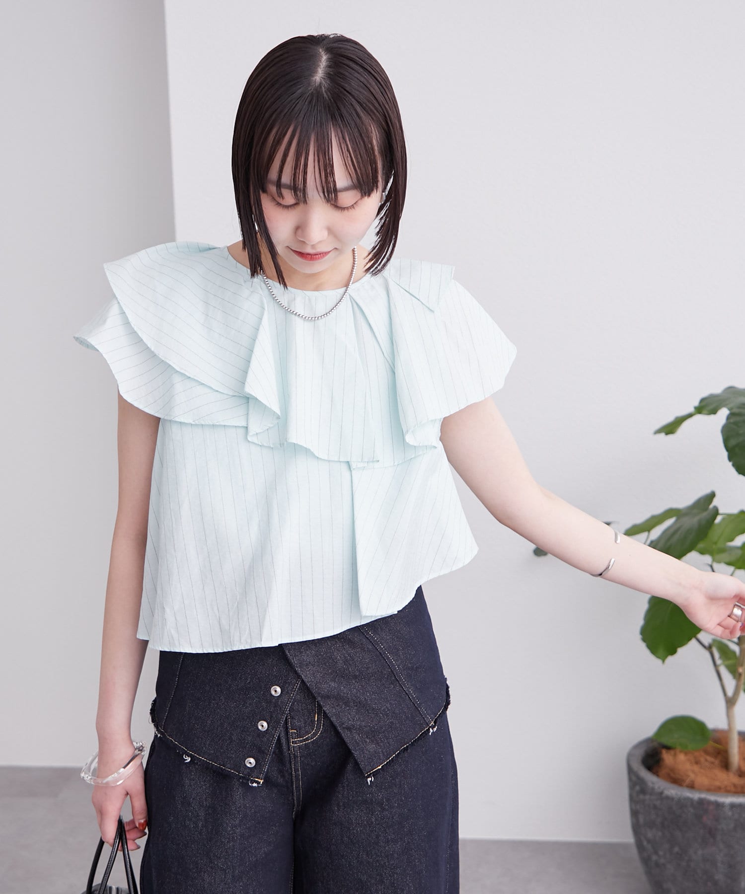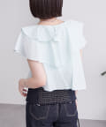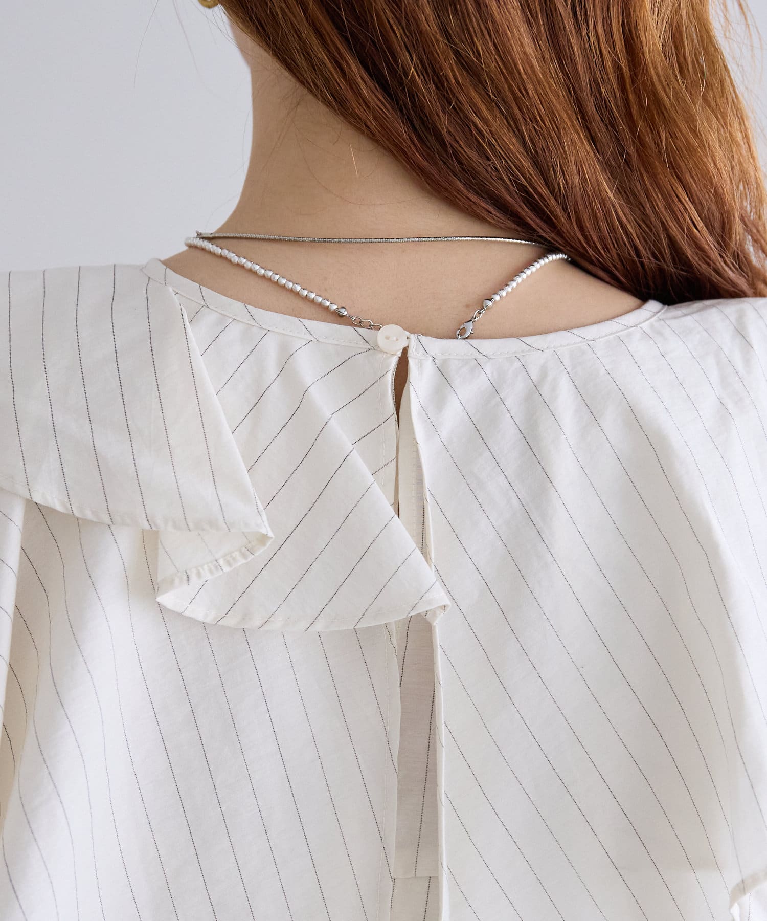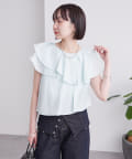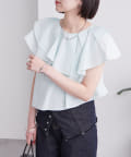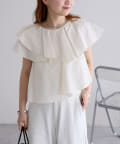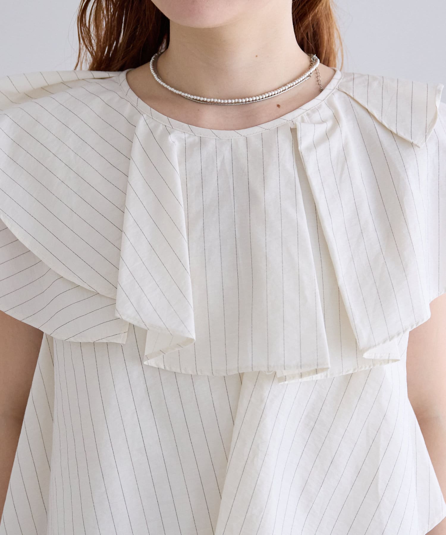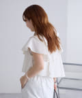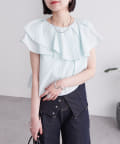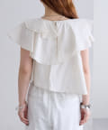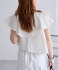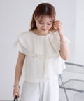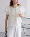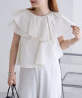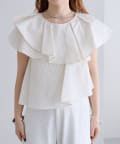 襟元にはたっぷりと生地を使った、レイヤード風になったフリルデザインが施されており、
