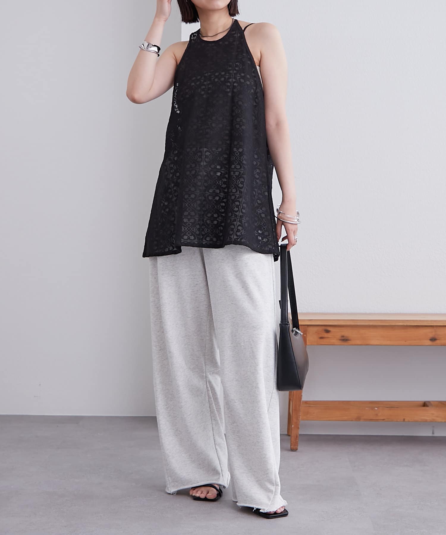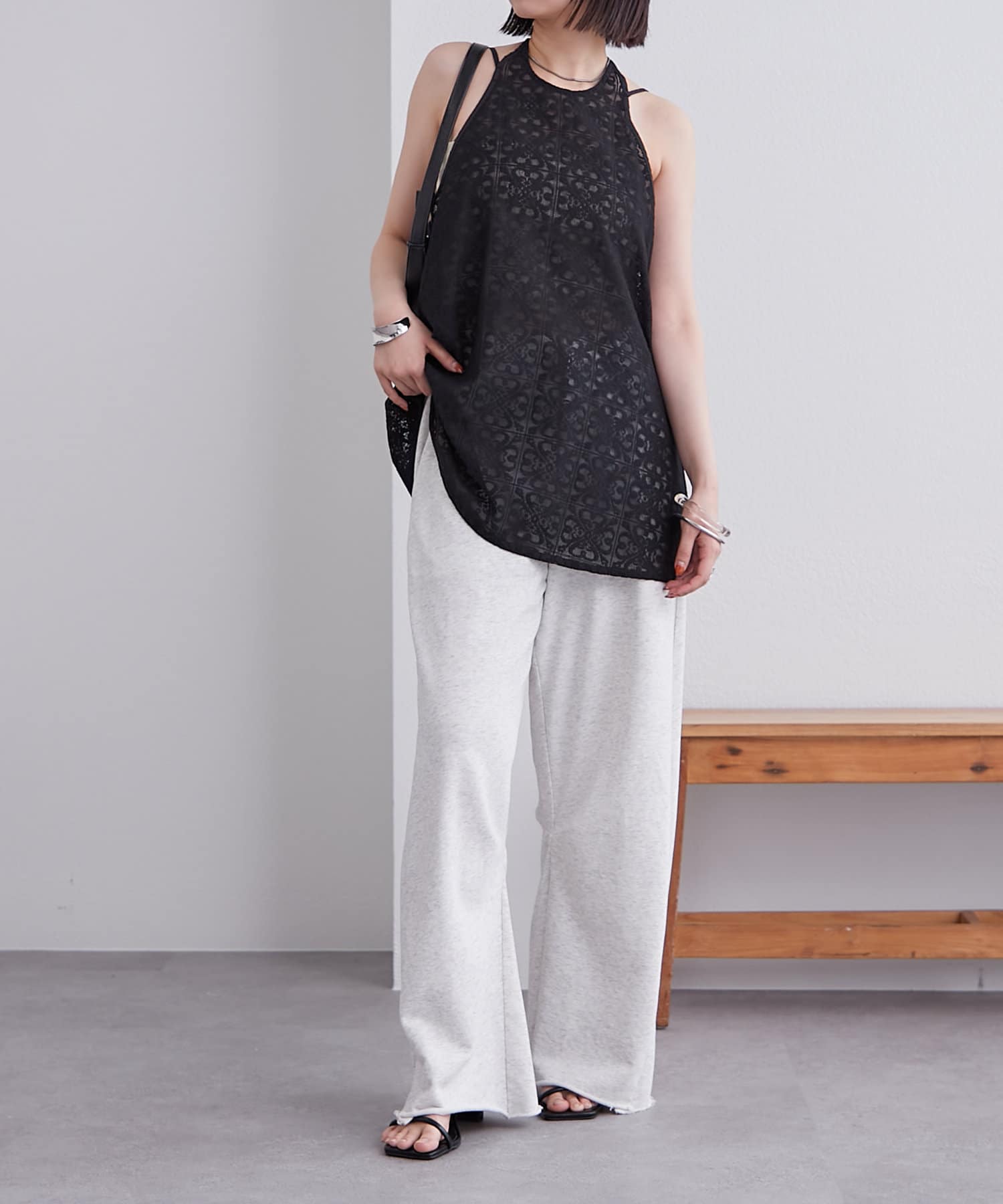 レースイージーパンツとセットアップ風で着ると大人っぽく綺麗めに仕上がります。