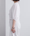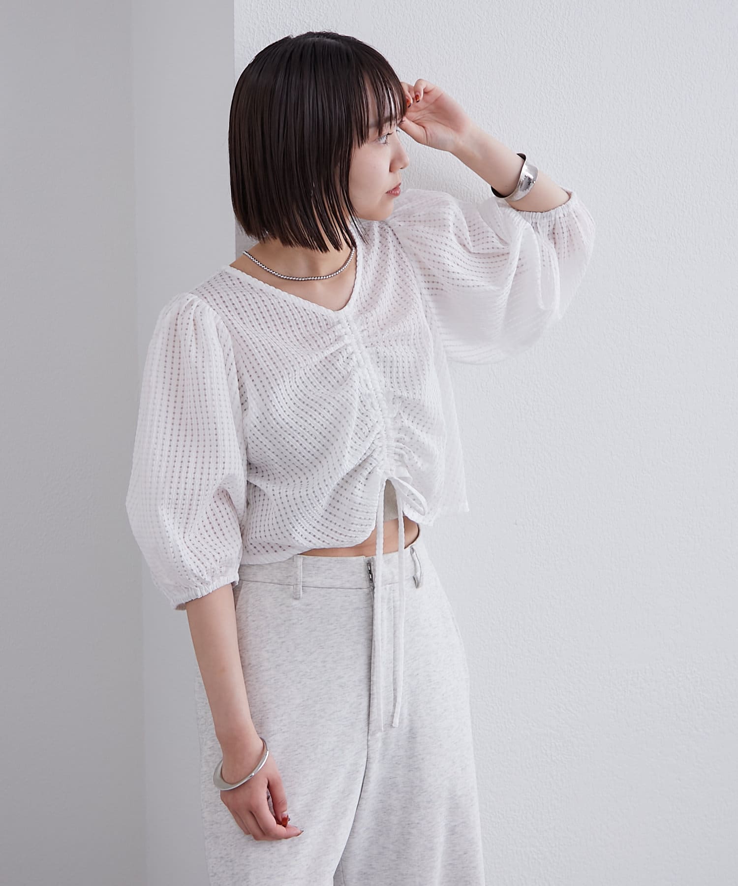 ・さりげないチェック柄のシアー素材でフェミ二ンな印象に。