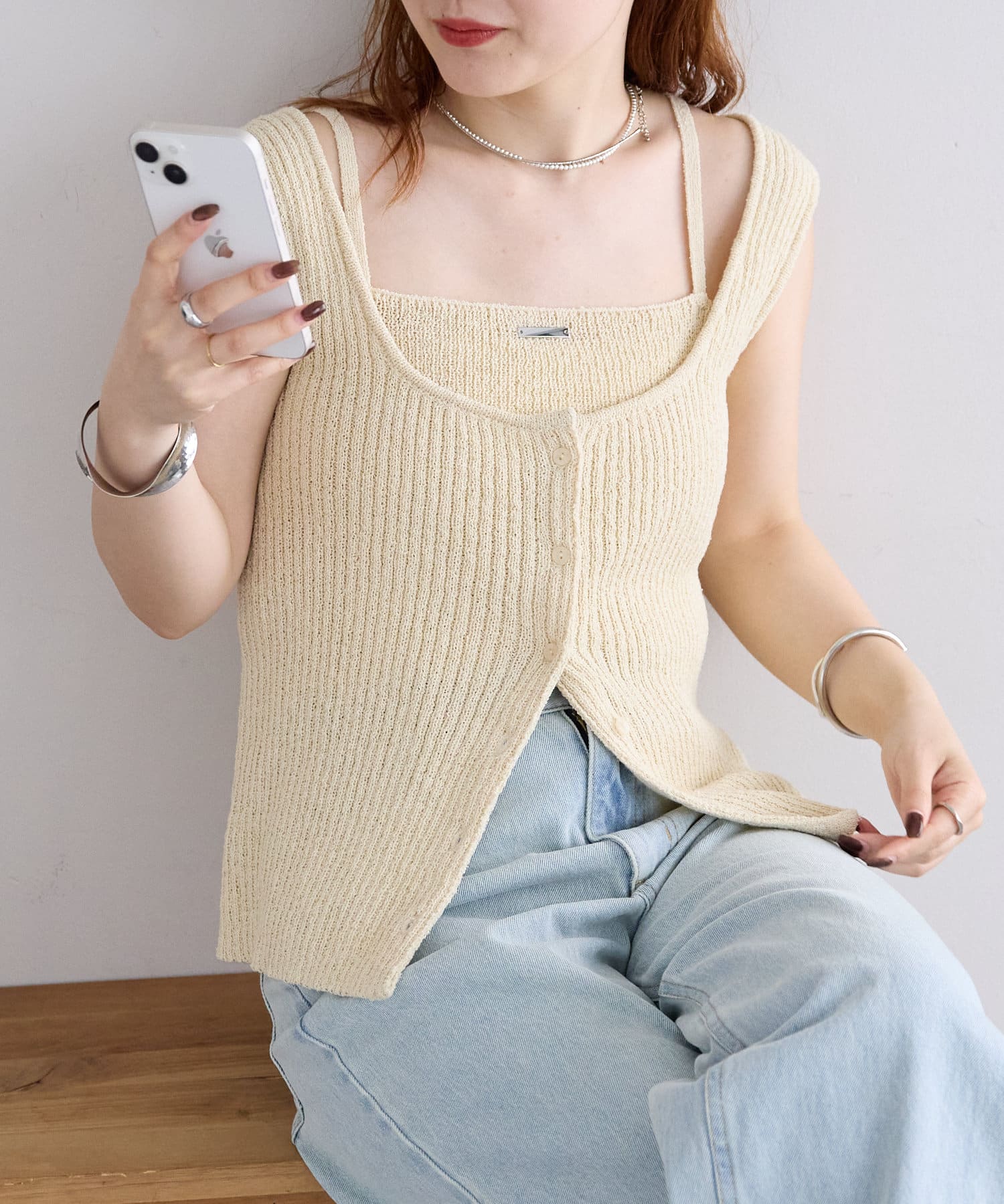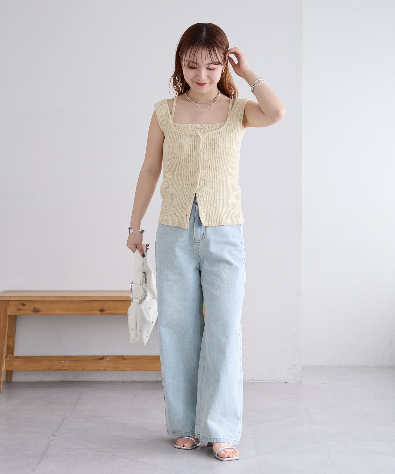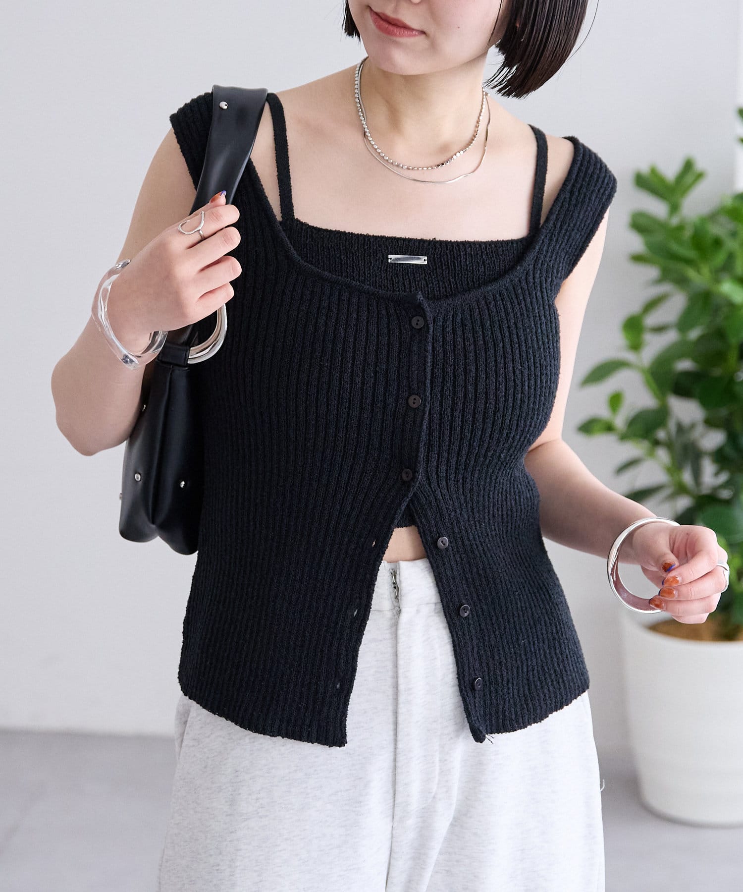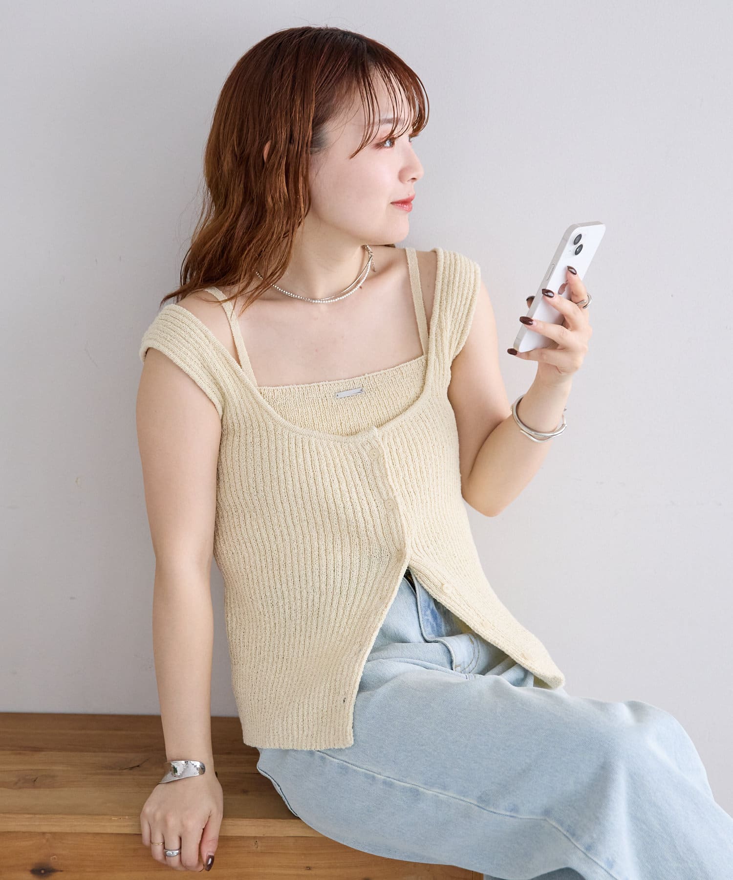 タンクトップはボタンで開け具合を調整でき、キャミソールに重ね着するだけでこなれ感のあるレイヤードスタイルが完成します!