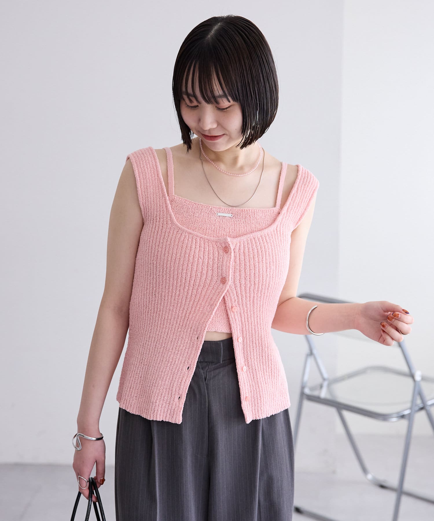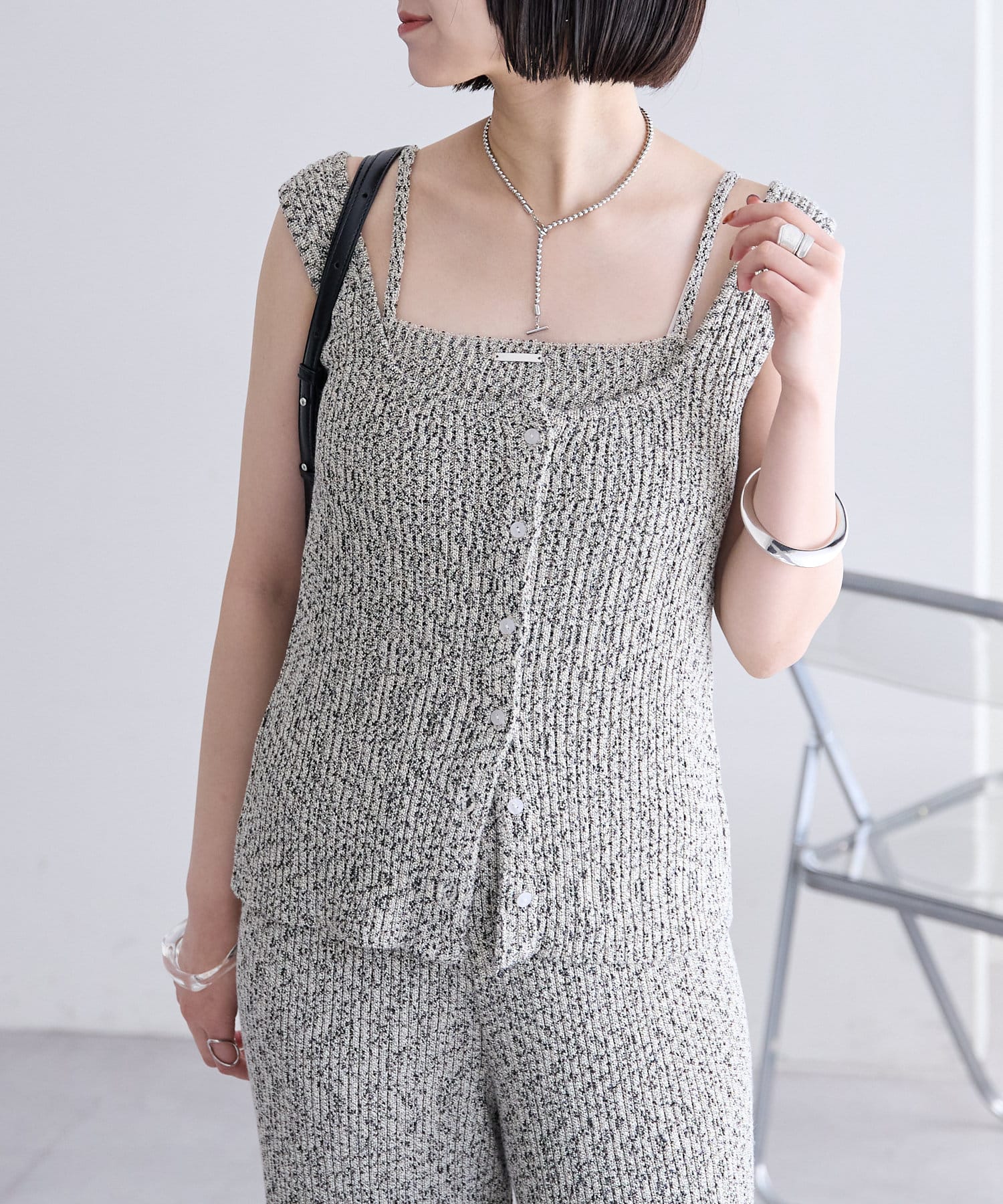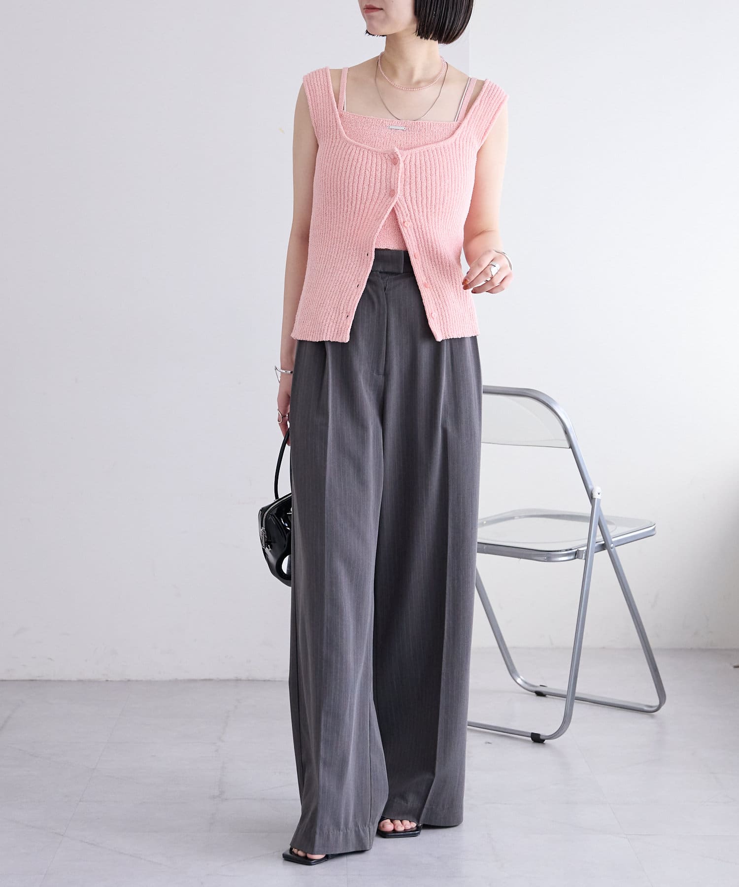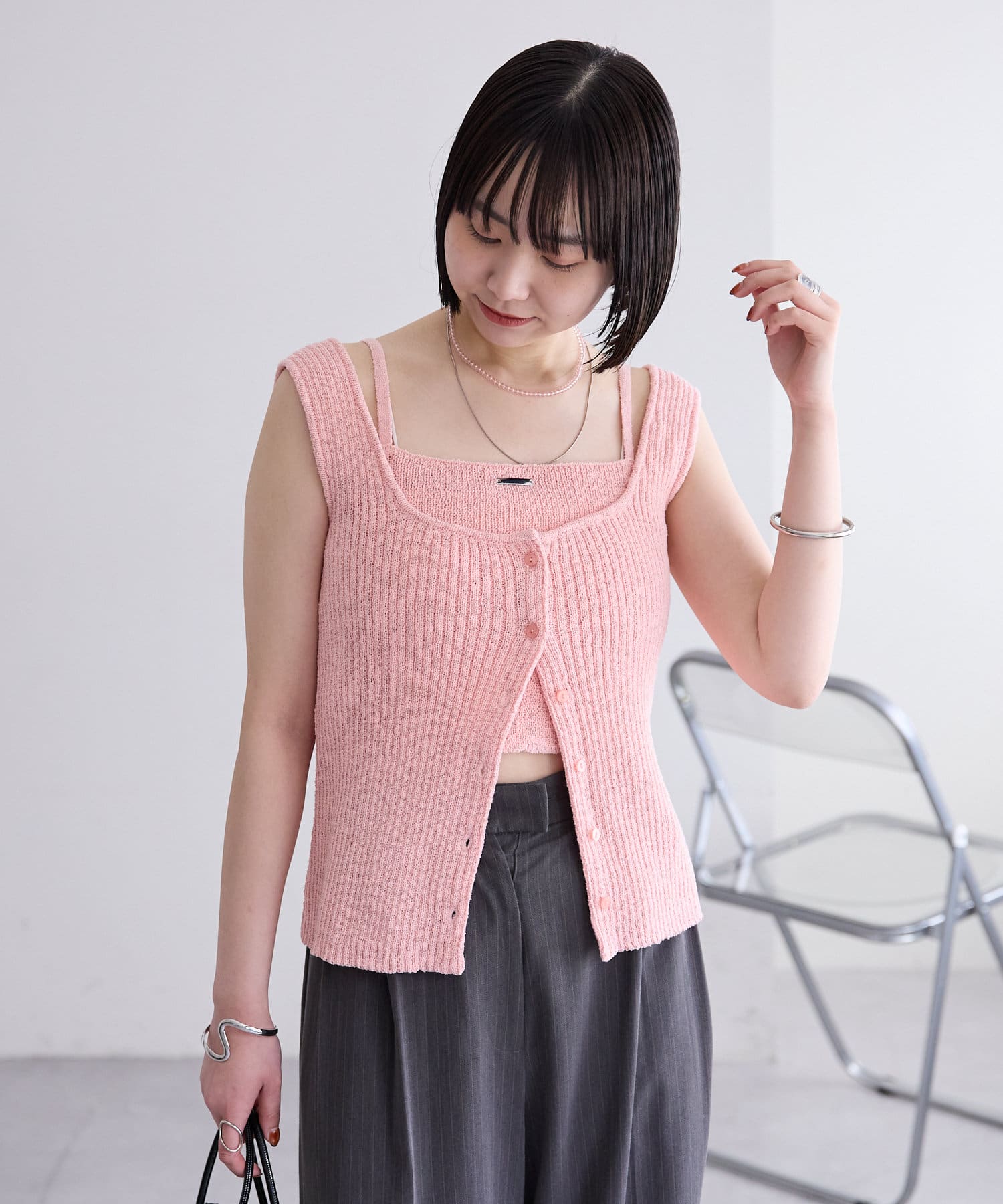 タンクトップはボタンで開け具合を調整でき、キャミソールに重ね着するだけでこなれ感のあるレイヤードスタイルが完成します!