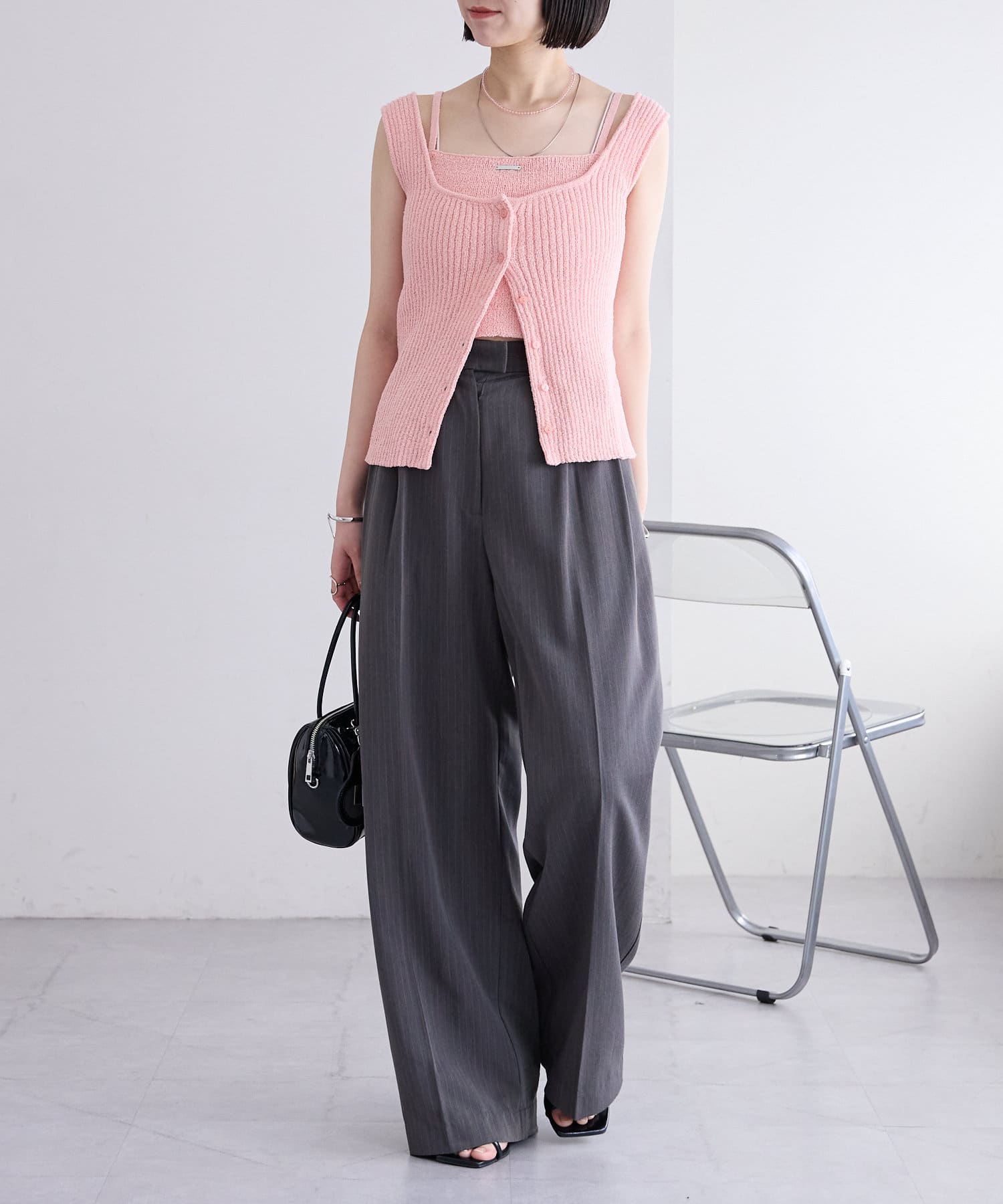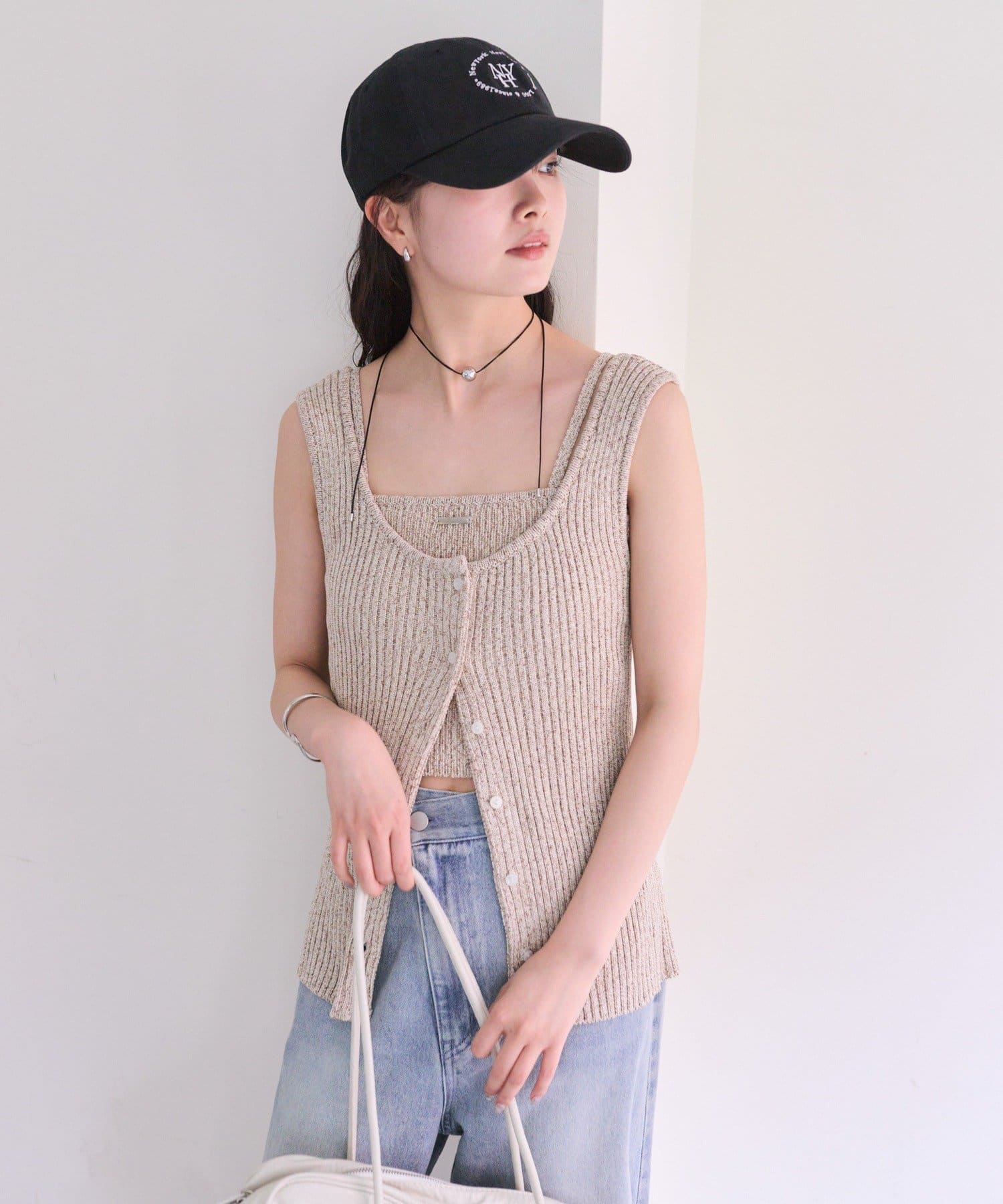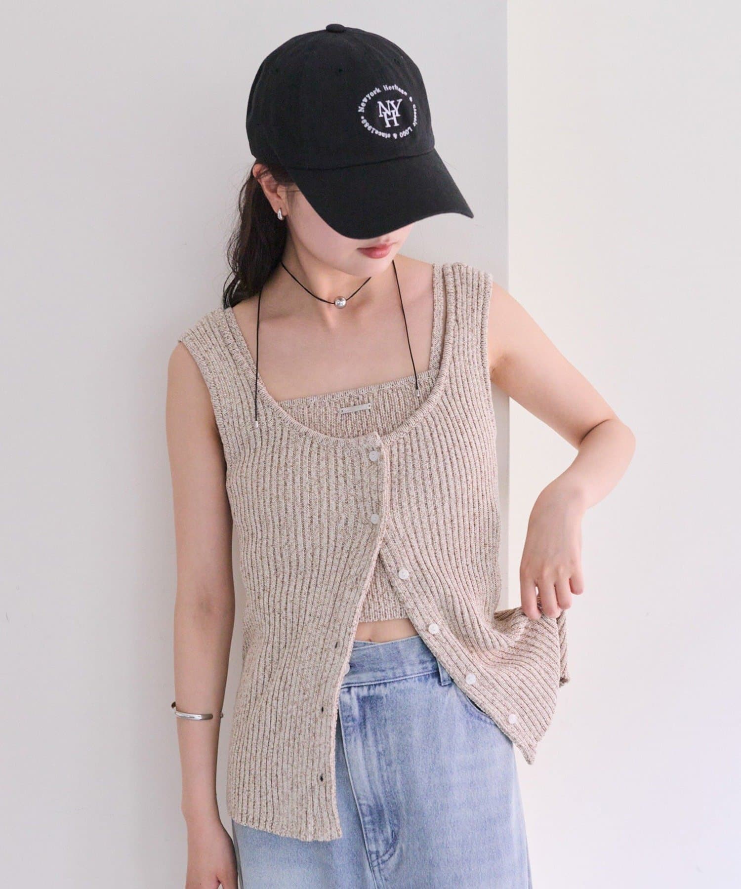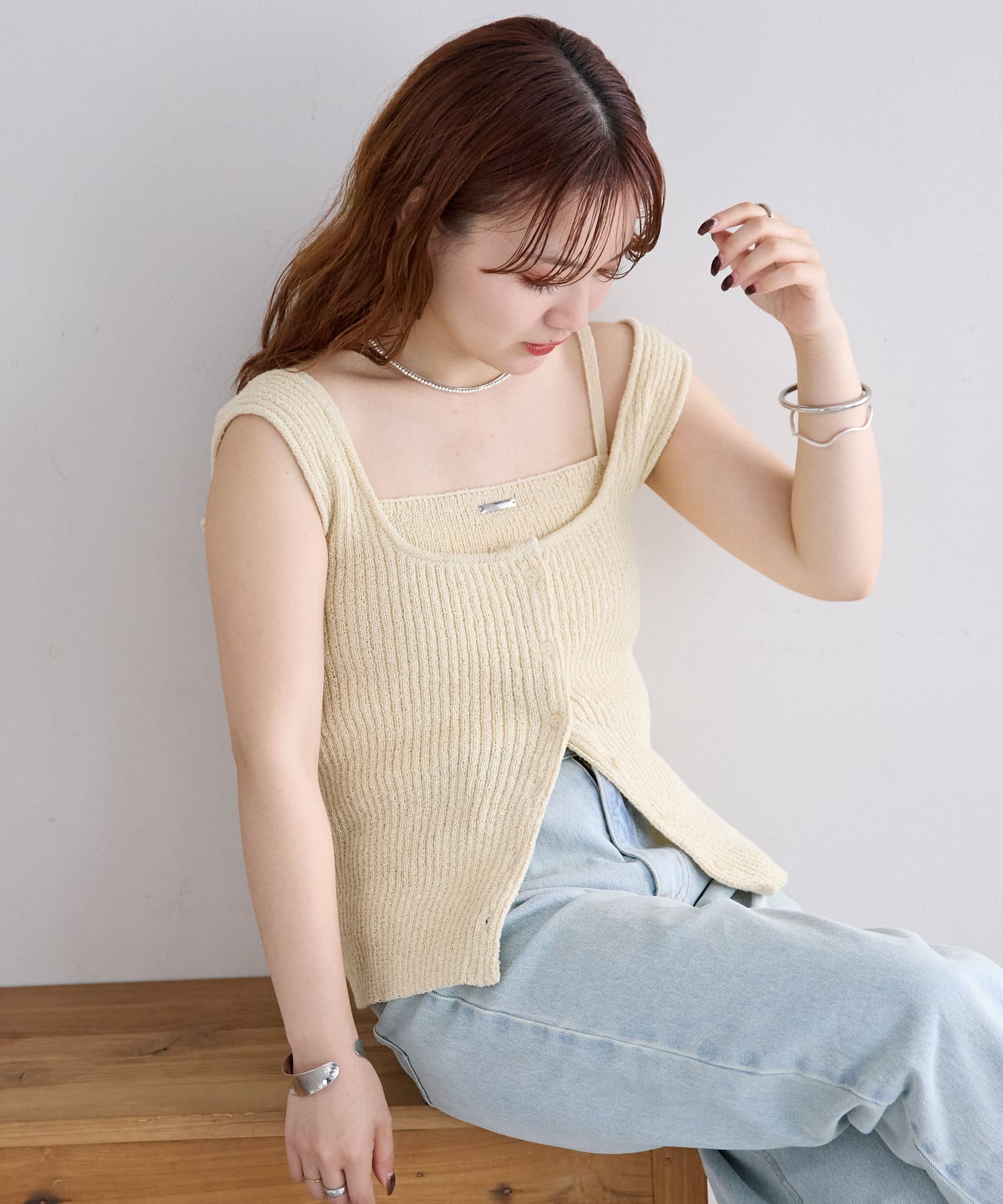 タンクトップはボタンで開け具合を調整でき、キャミソールに重ね着するだけでこなれ感のあるレイヤードスタイルが完成します!