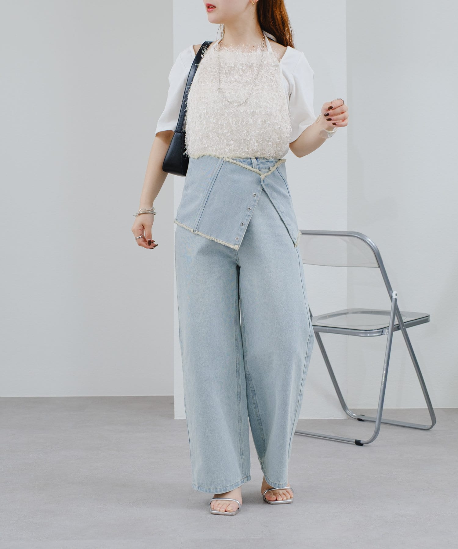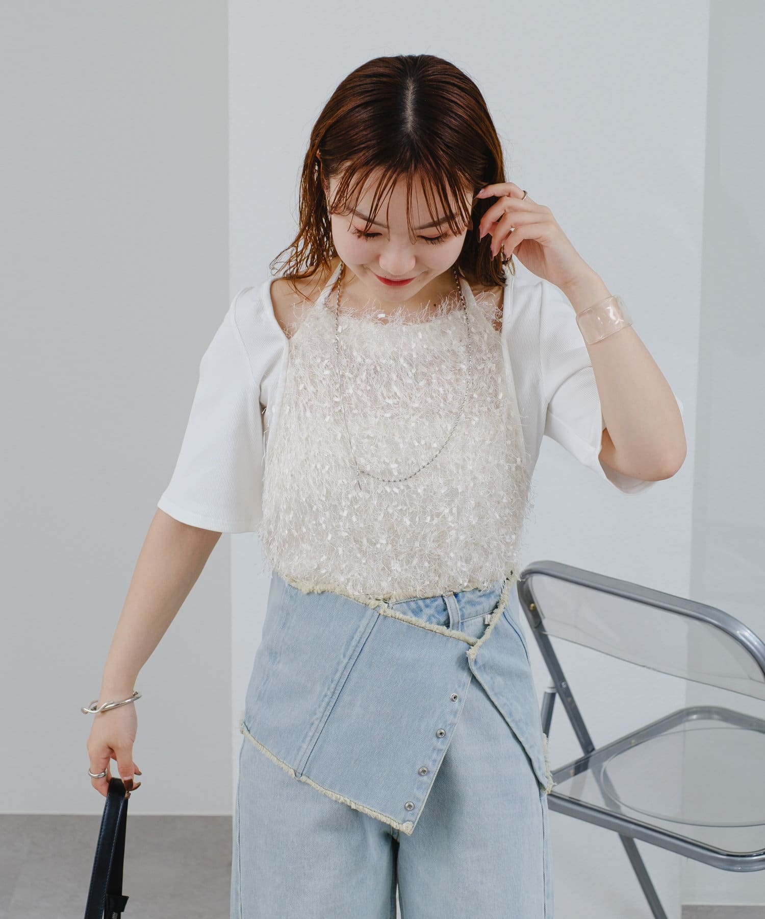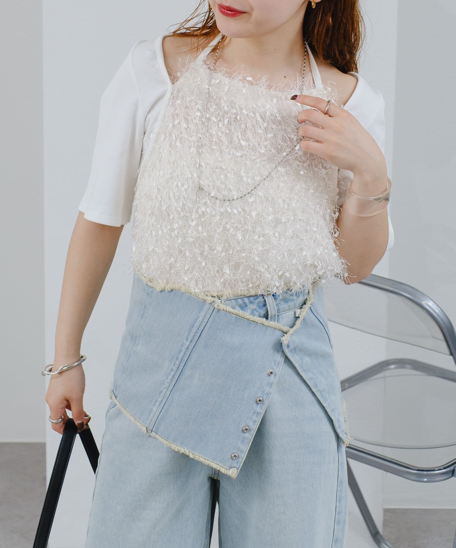 華やかなフリンジデザインはカジュアルなデニムなどカジュアルなスタイリングと相性◎。