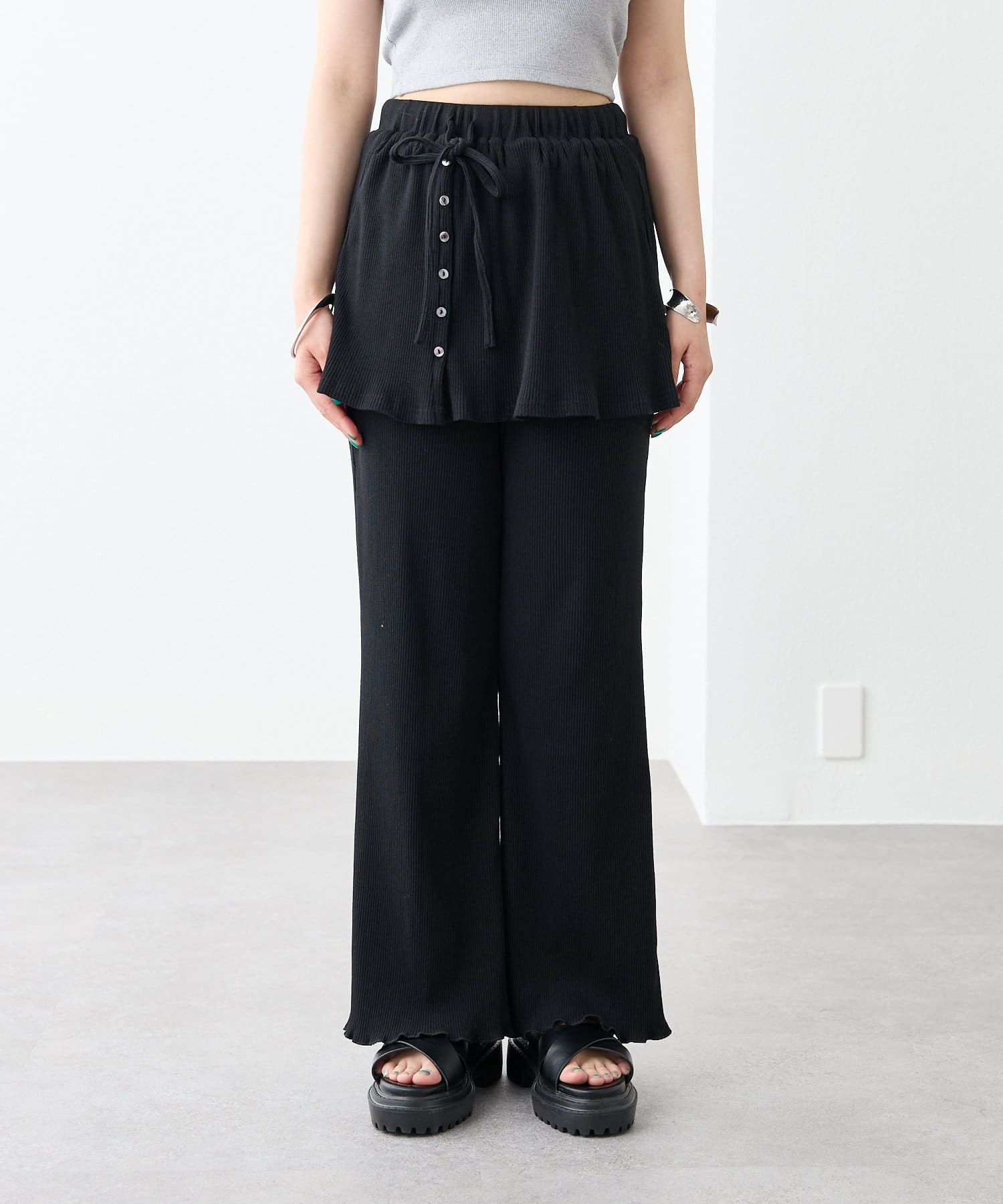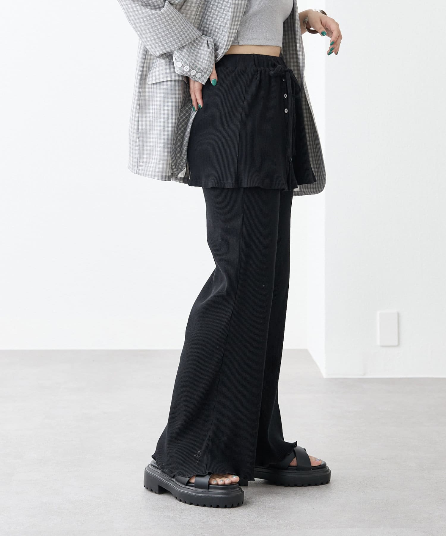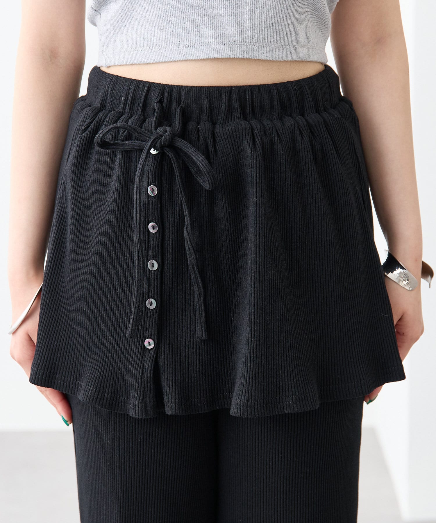 ・スカートとパンツをレイヤードしたようなデザインのパンツ。