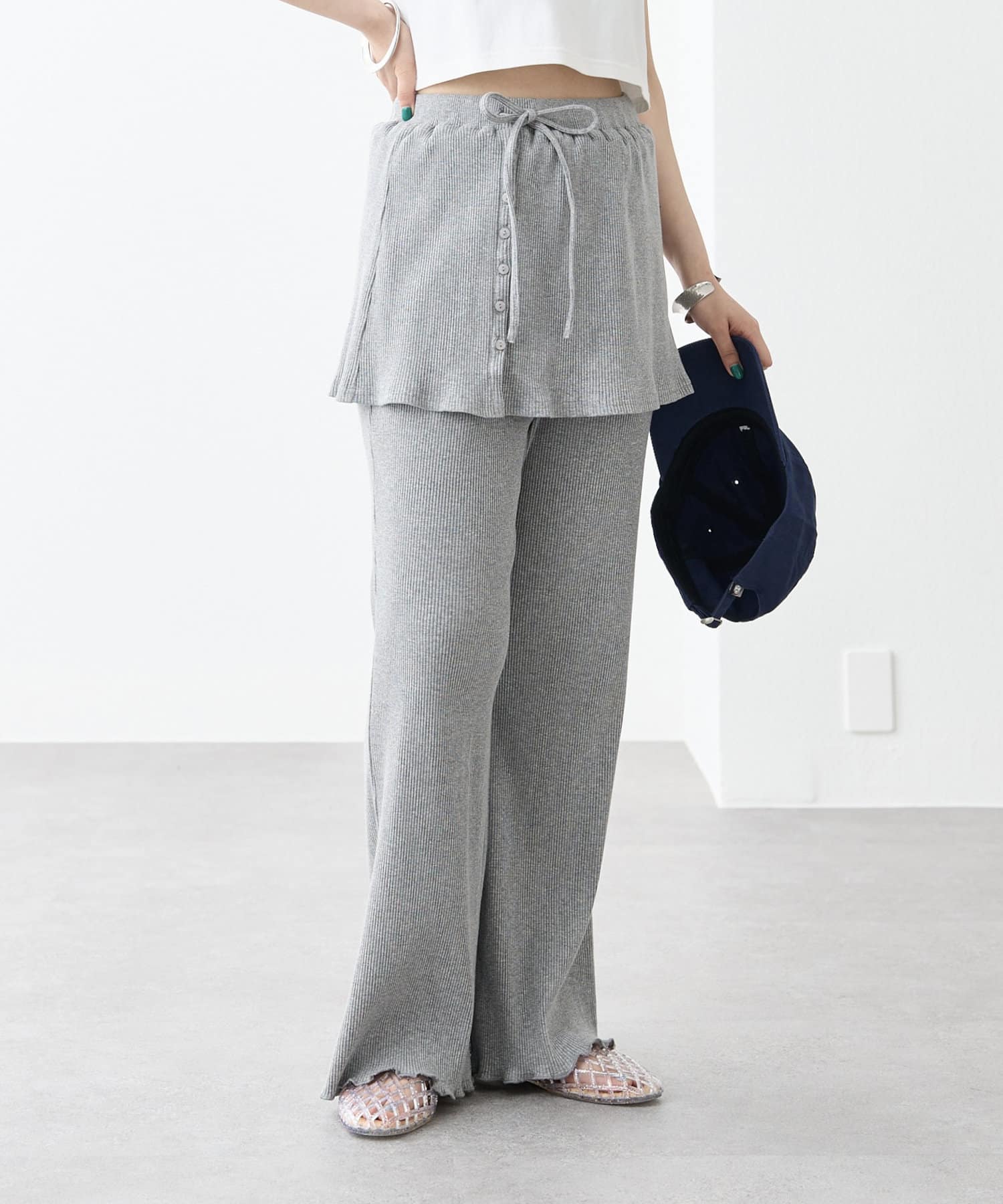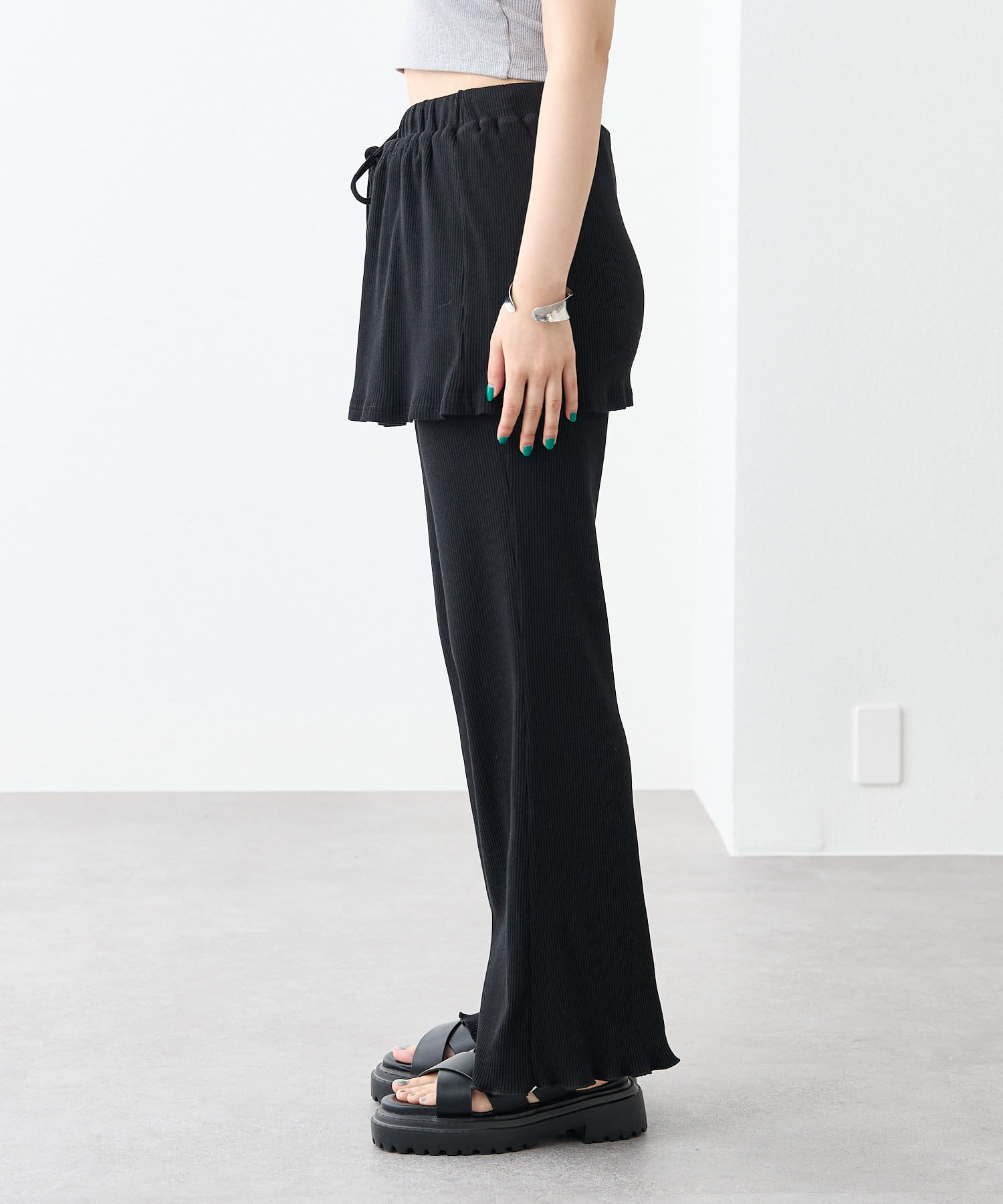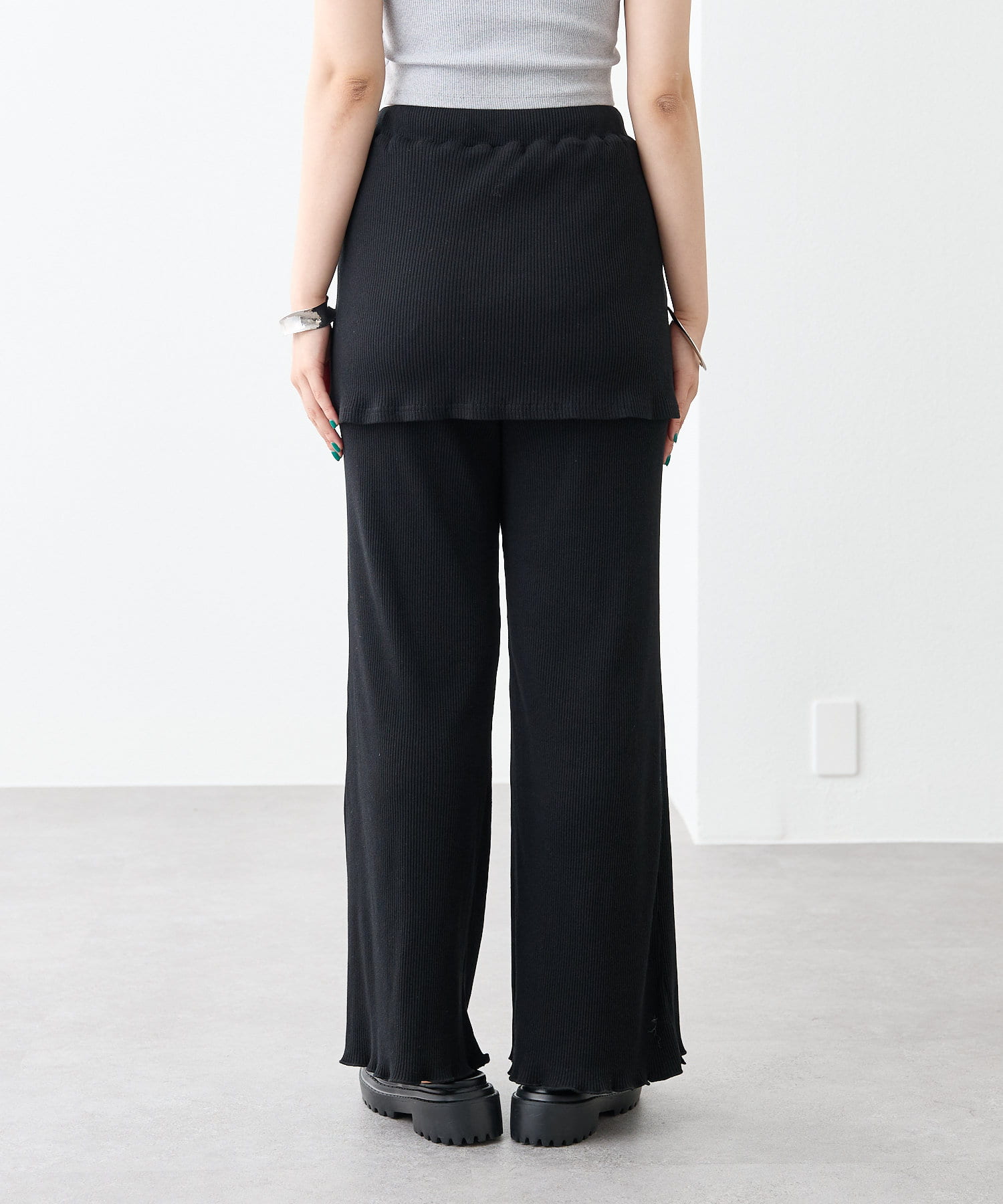 ・スカートとパンツをレイヤードしたようなデザインのパンツ。