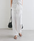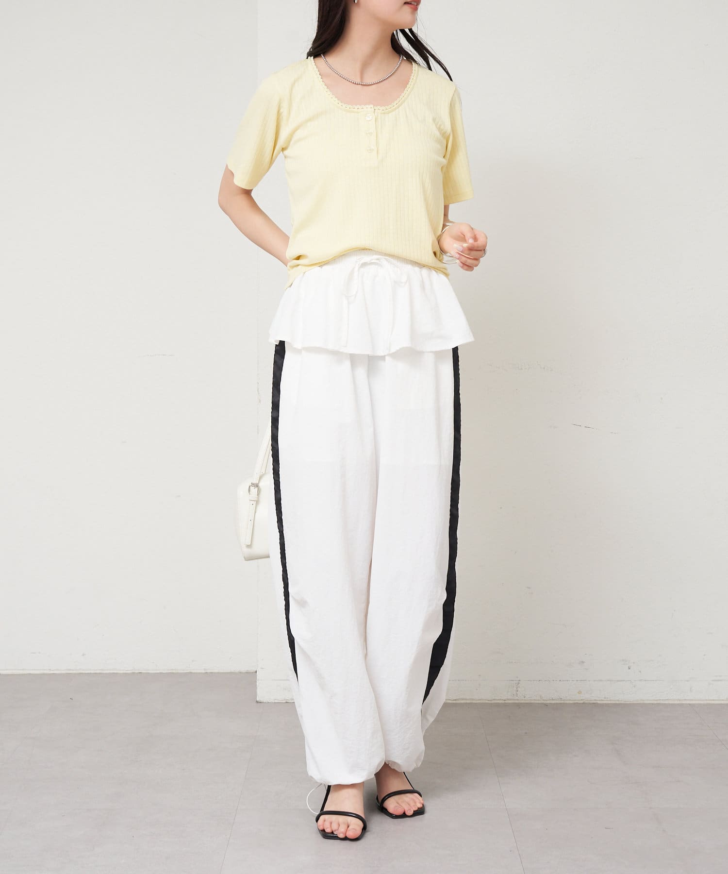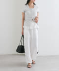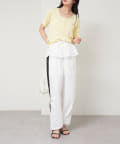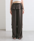 カジュアルなデザインかつウエスト回りのフリルで甘めカジュアルな印象のパンツ。