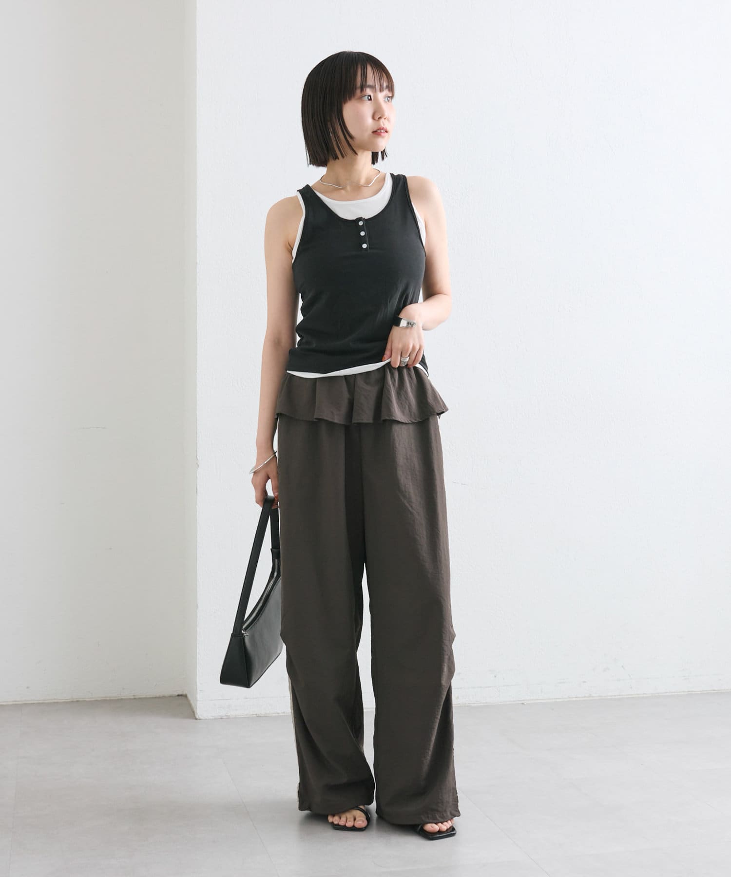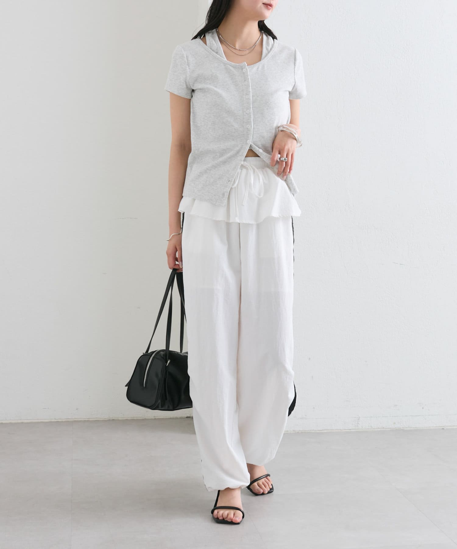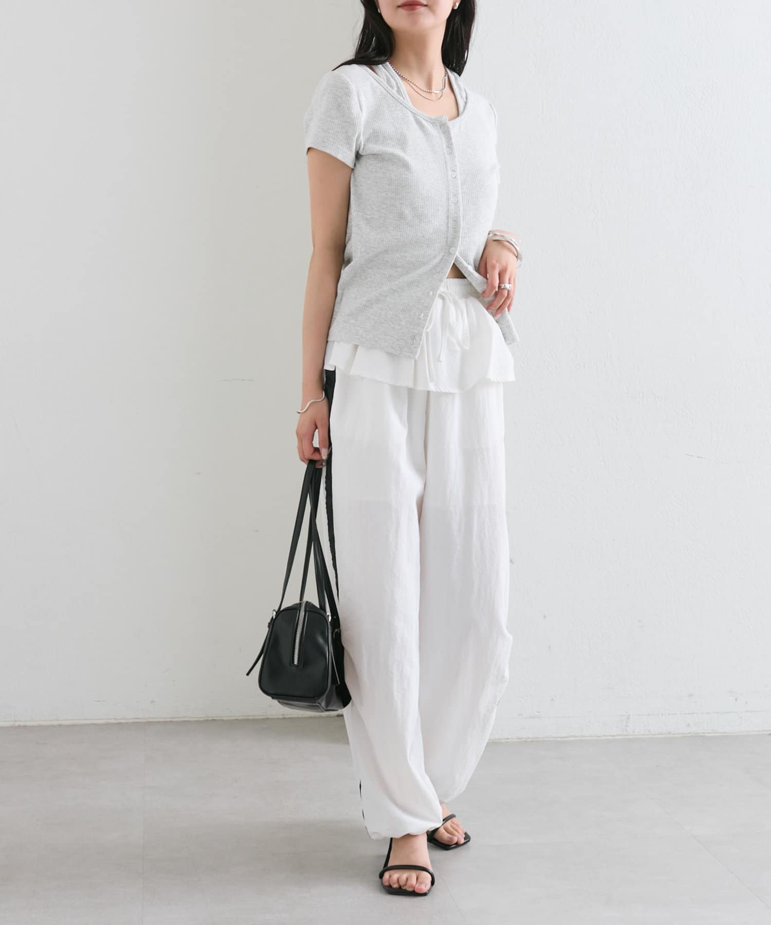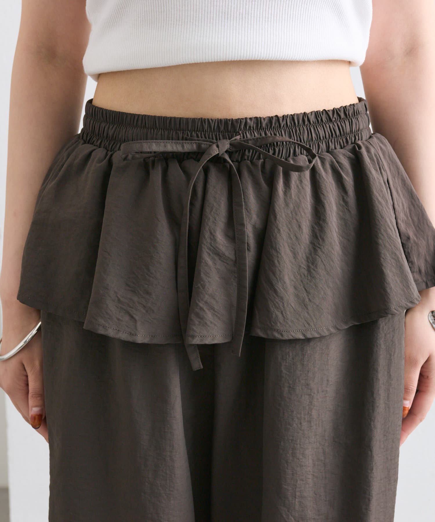 腰回りのフリルがカジュアル過ぎないデザインで甘辛コーデがおすすめです◎
