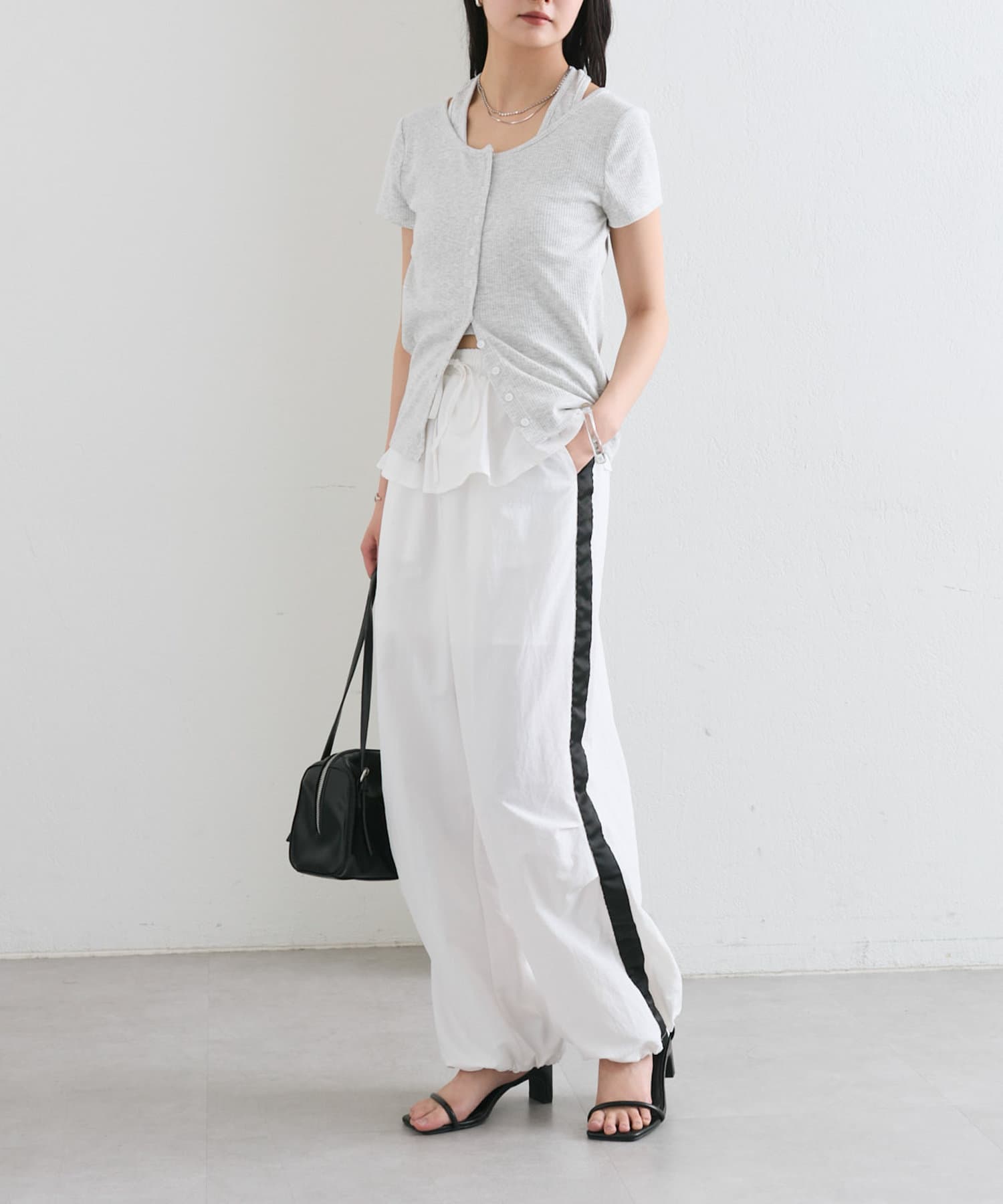 ヒールのあるサンダルと合わせるよカジュアルさを抑え、こなれ感のあるスタイリングに。
