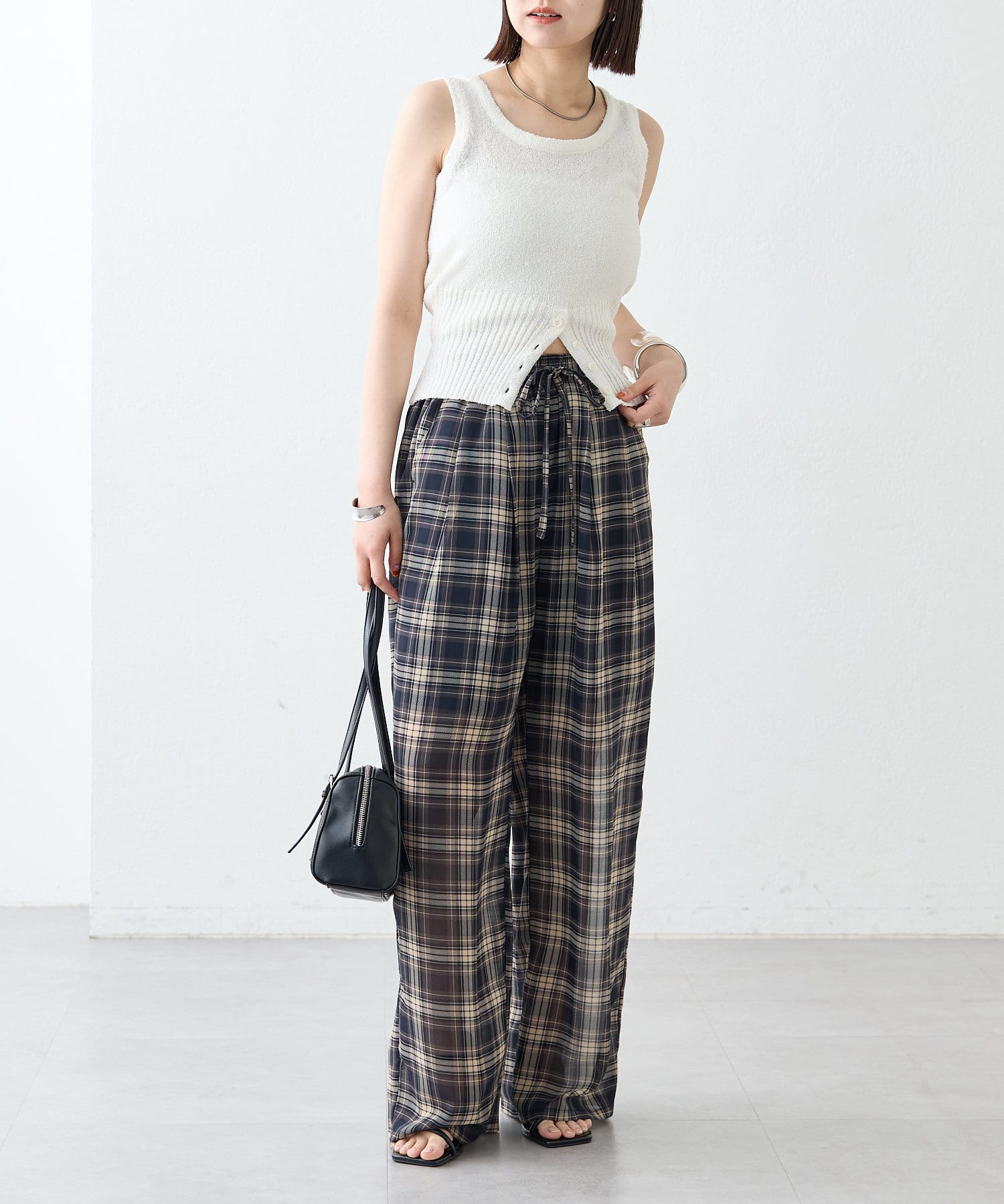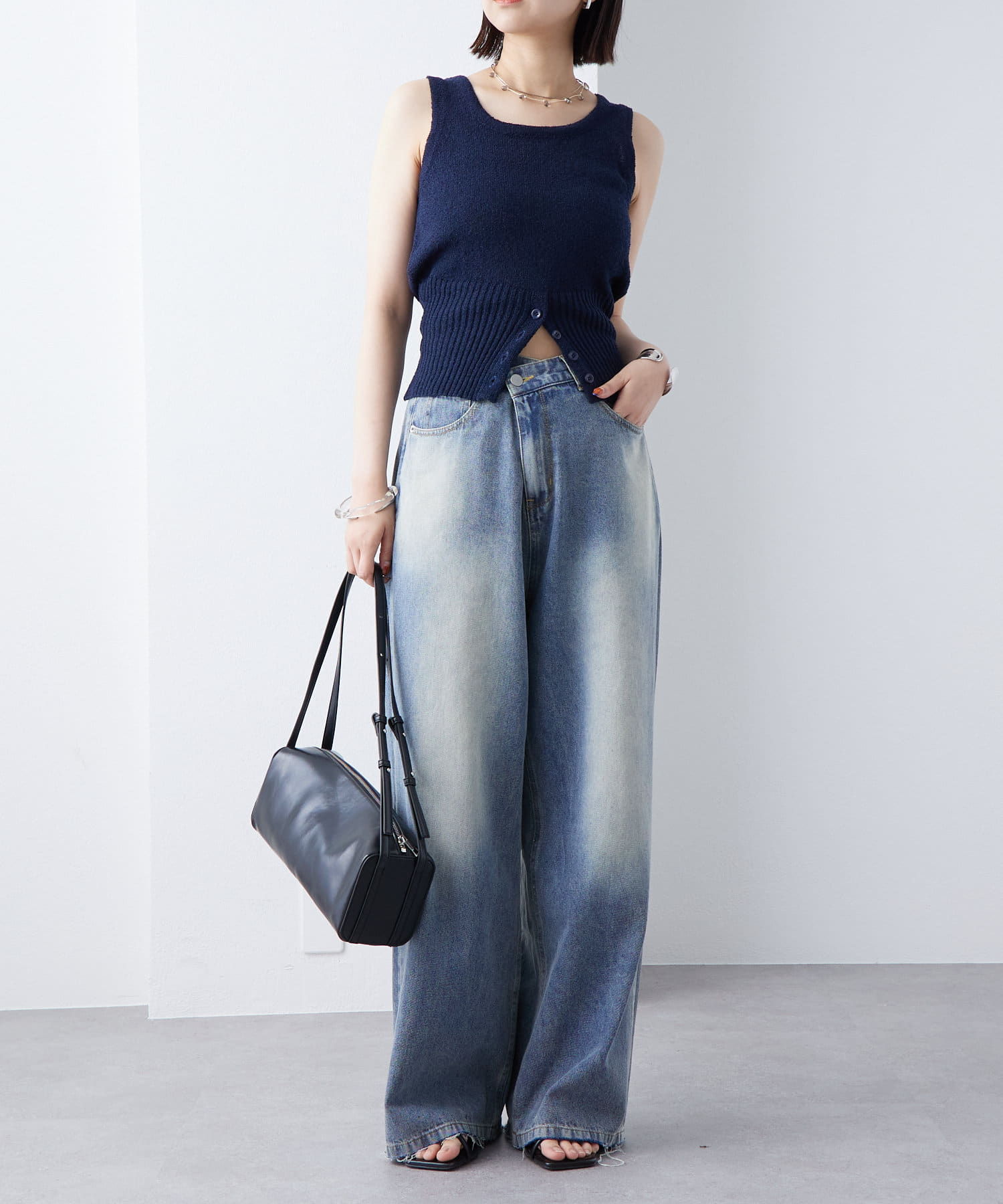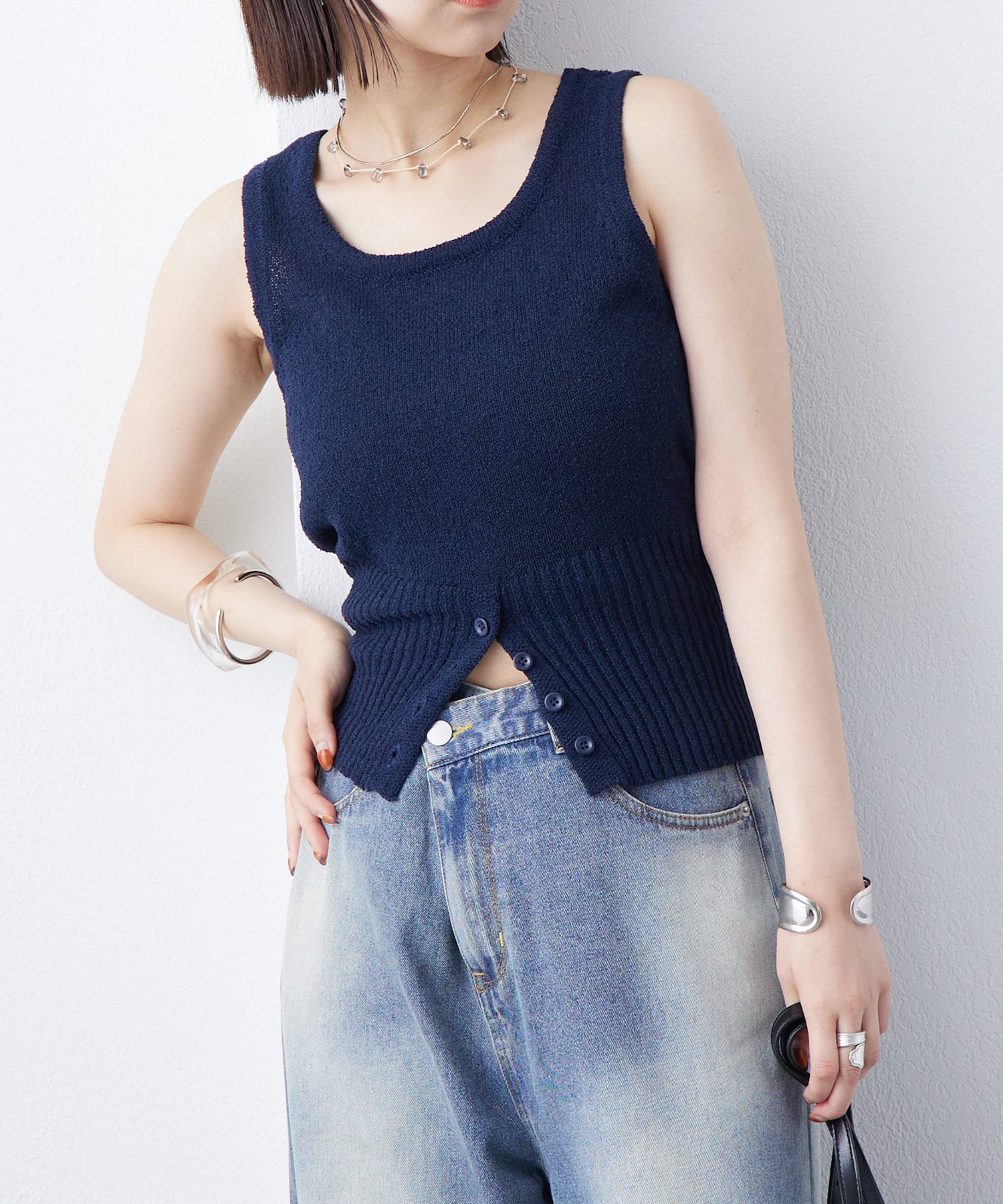 ・フロント下部分にボタンが施されておりオシャレ感がプラス。ボタンを開けて程よい肌見せをすることも◎