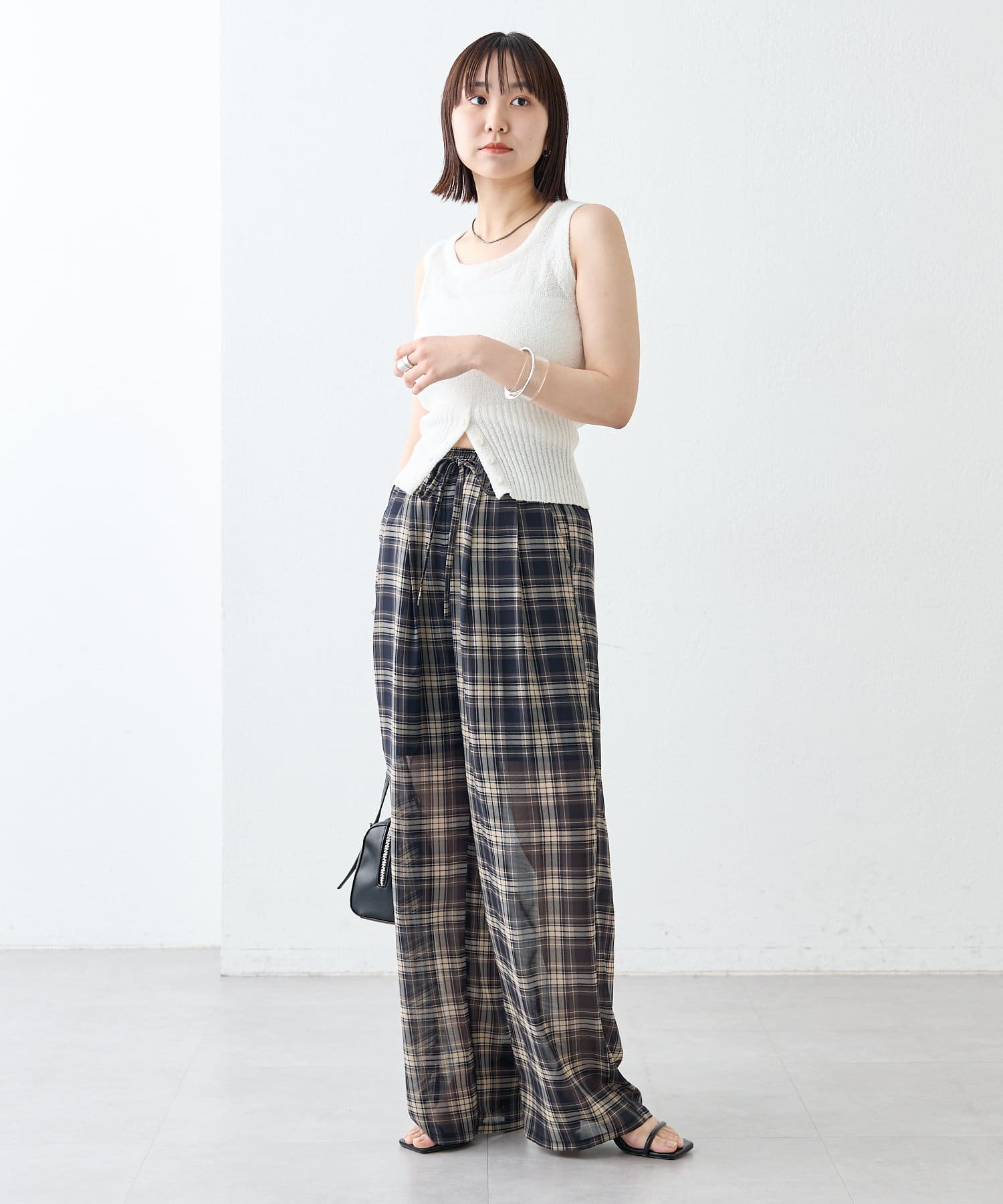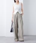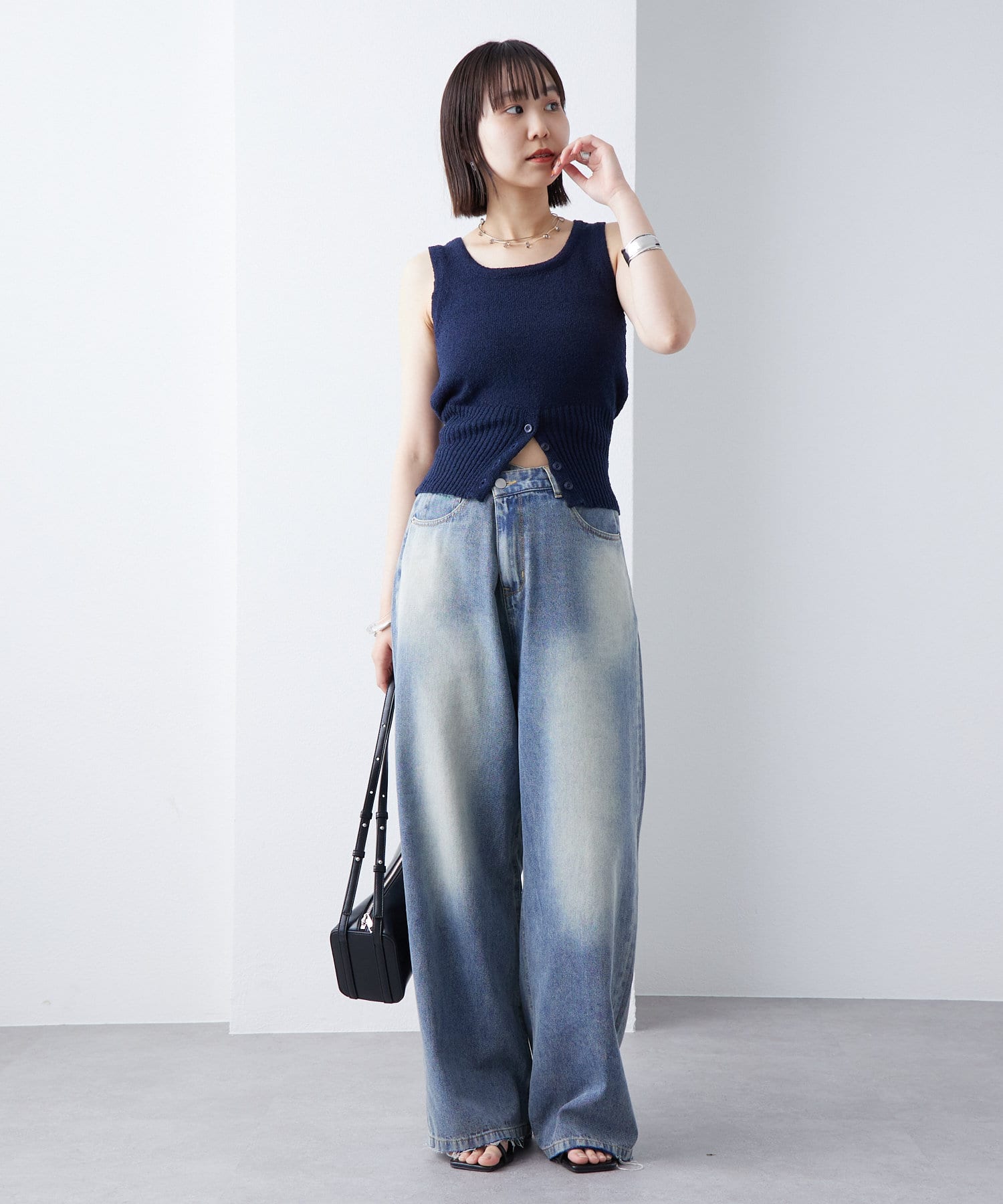 ・フロント下部分にボタンが施されておりオシャレ感がプラス。ボタンを開けて程よい肌見せをすることも◎