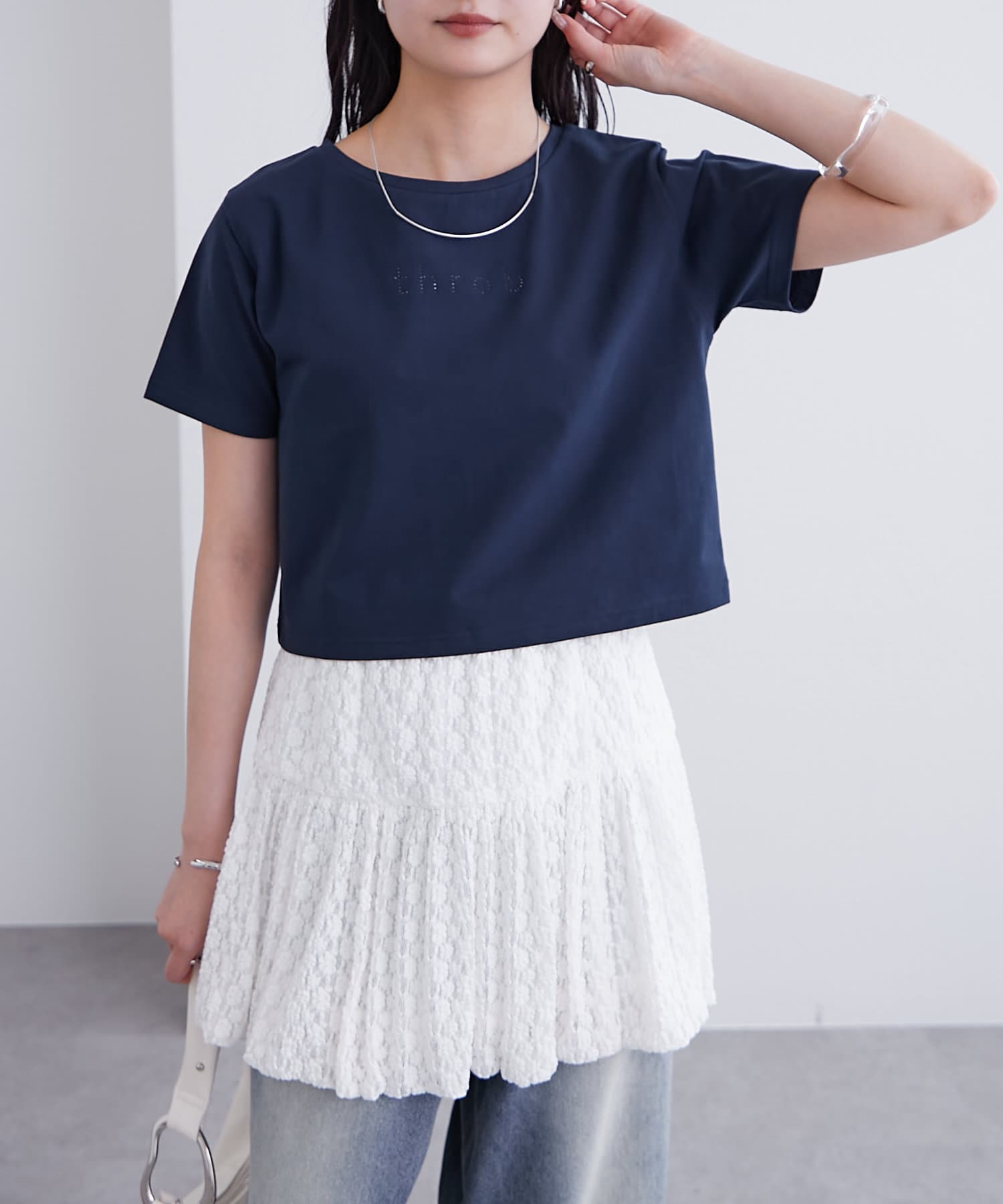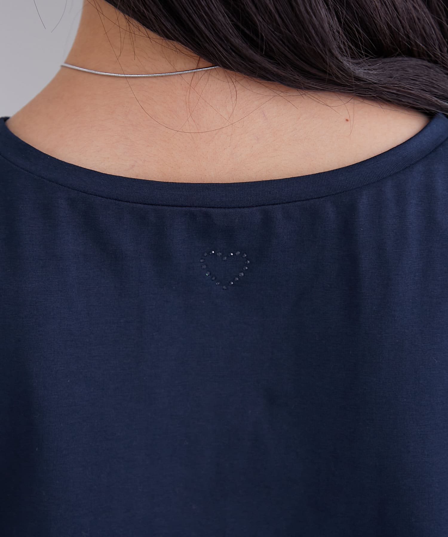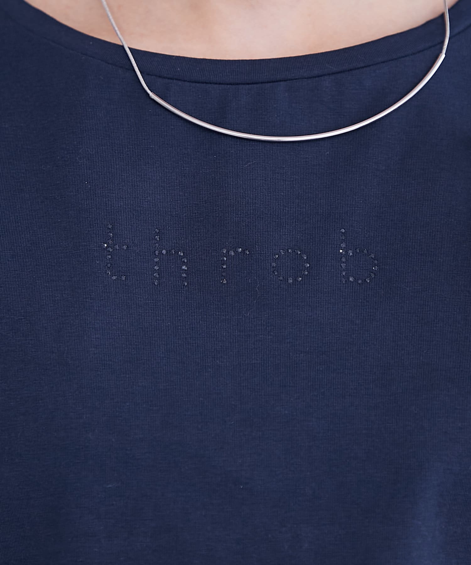 シンプルなデザインにラインストーンのロゴが入っているのがポイントの1枚。シンプルながらも着映えするアイテムです。