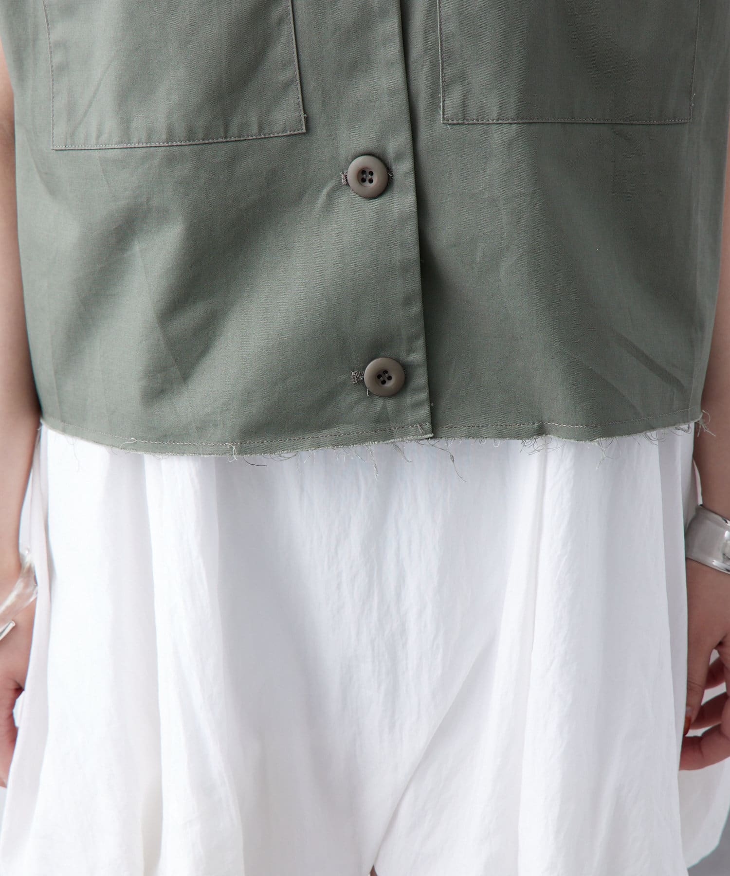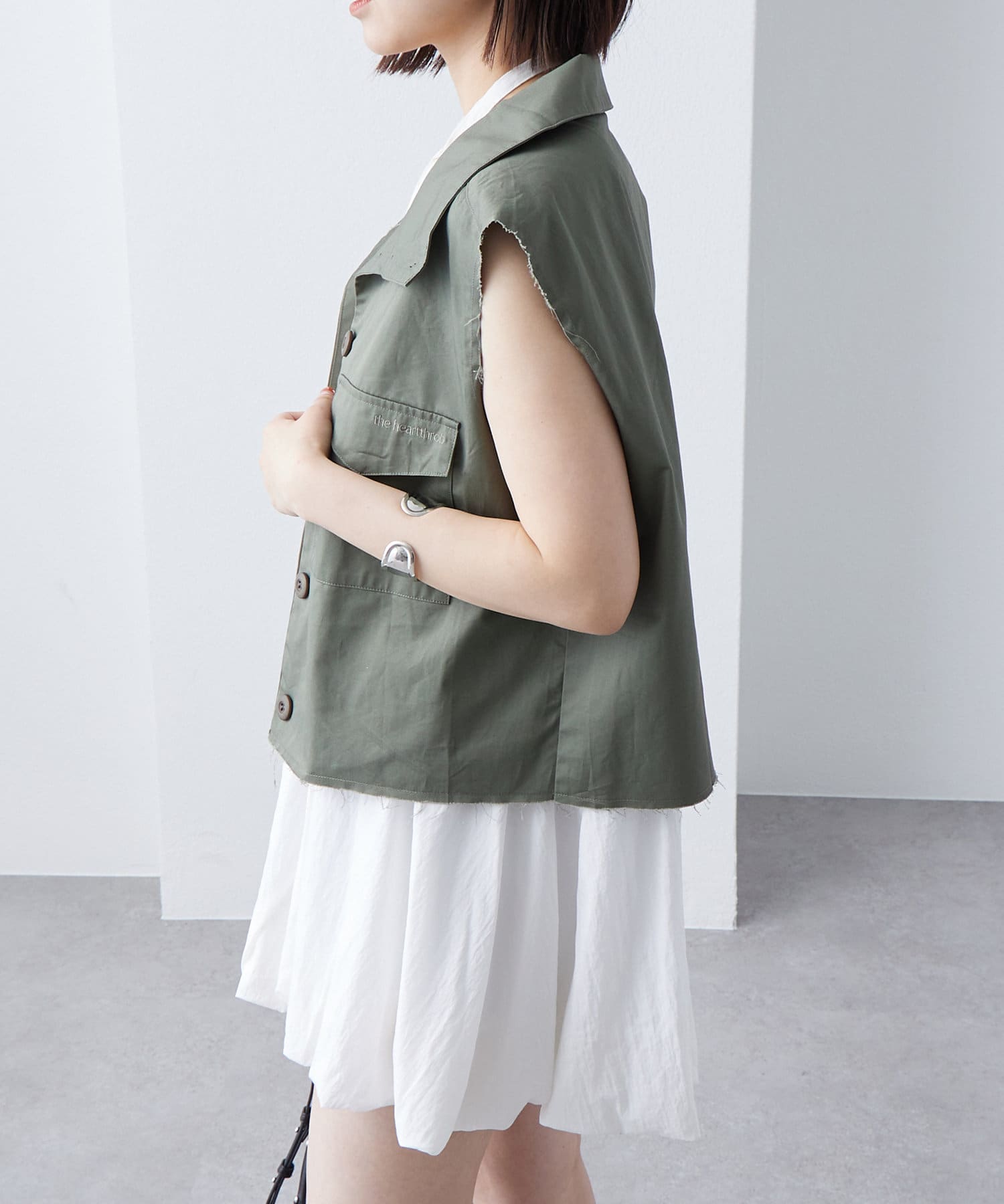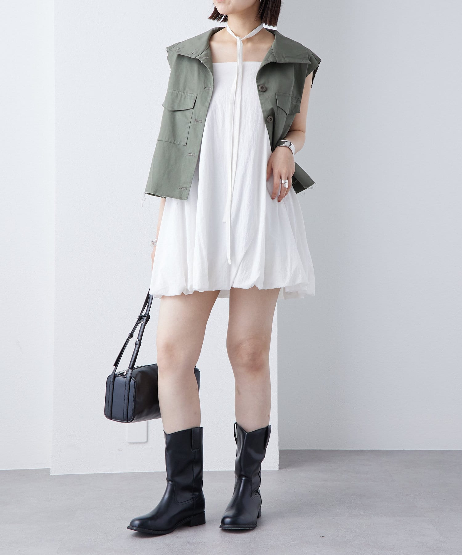 ・ミリタリーベストでも落ち着いたデザインのため、シンプルなワンピースと合わせるのも甘辛ミックスで相性抜群です◎