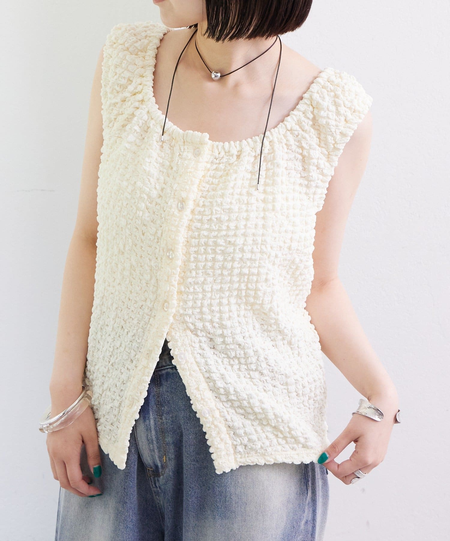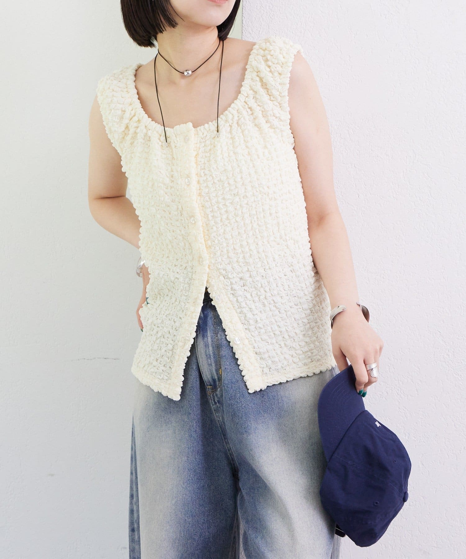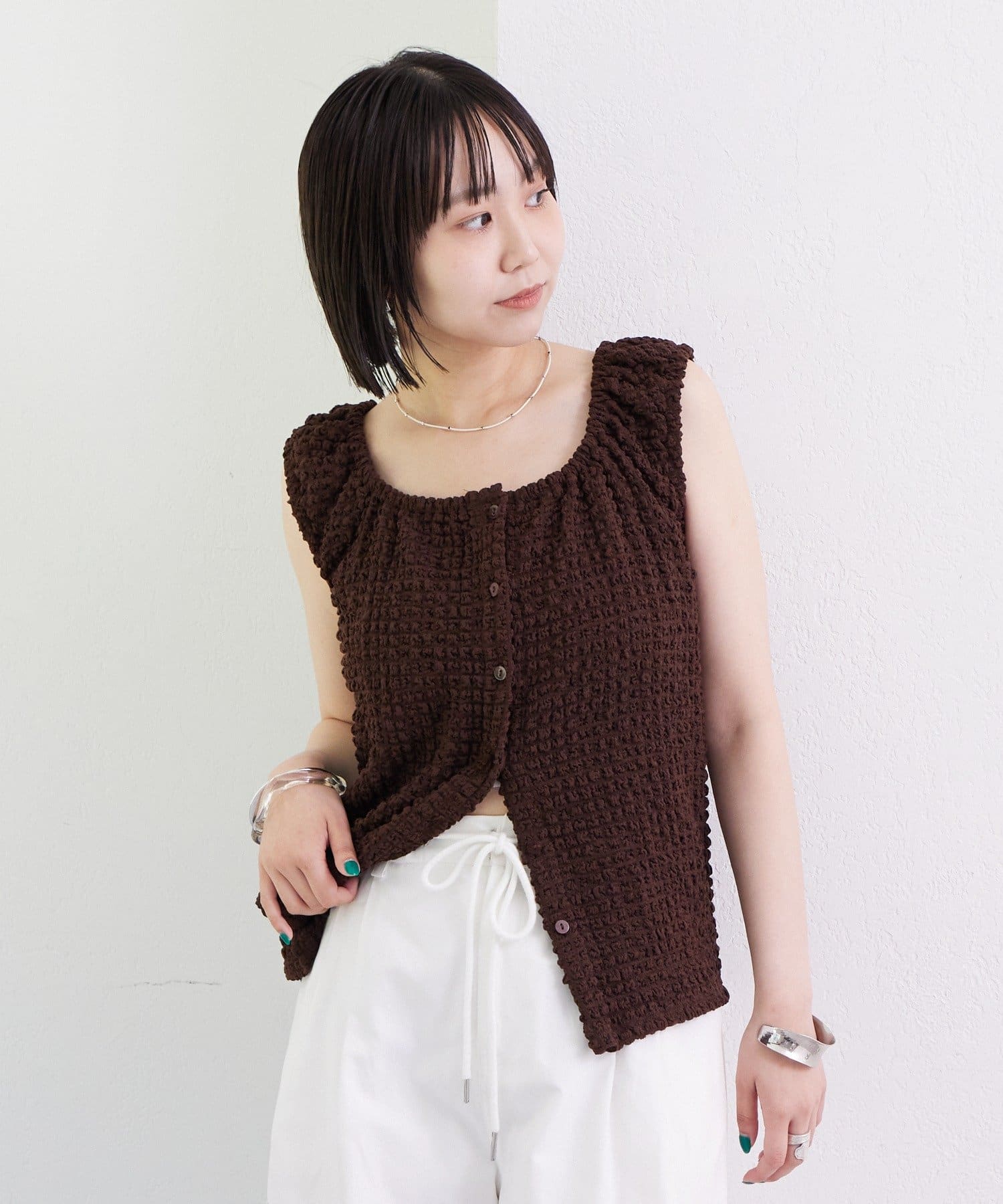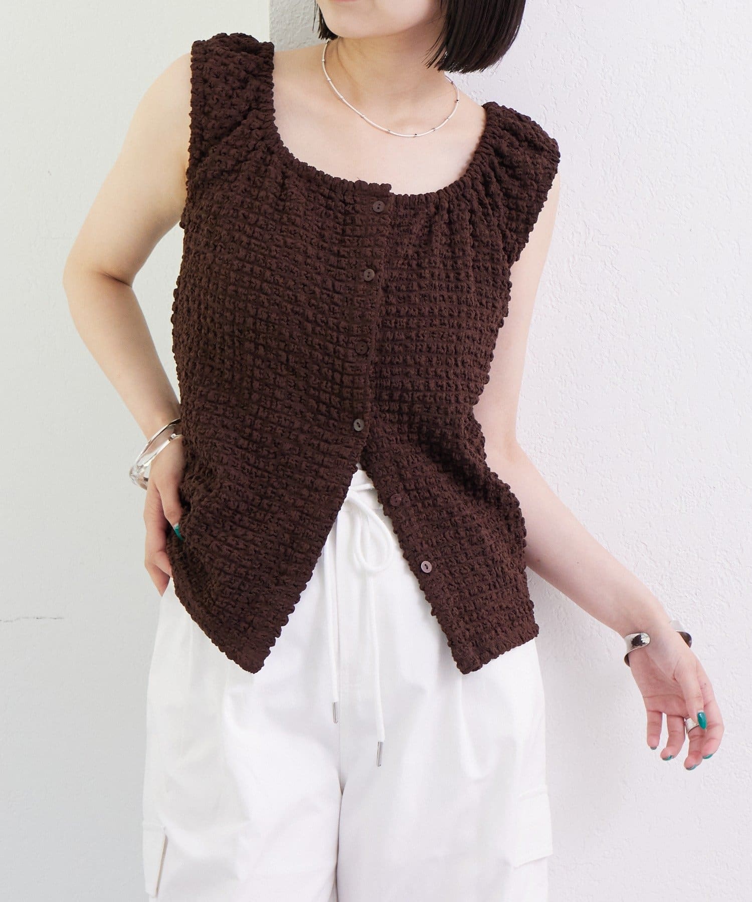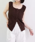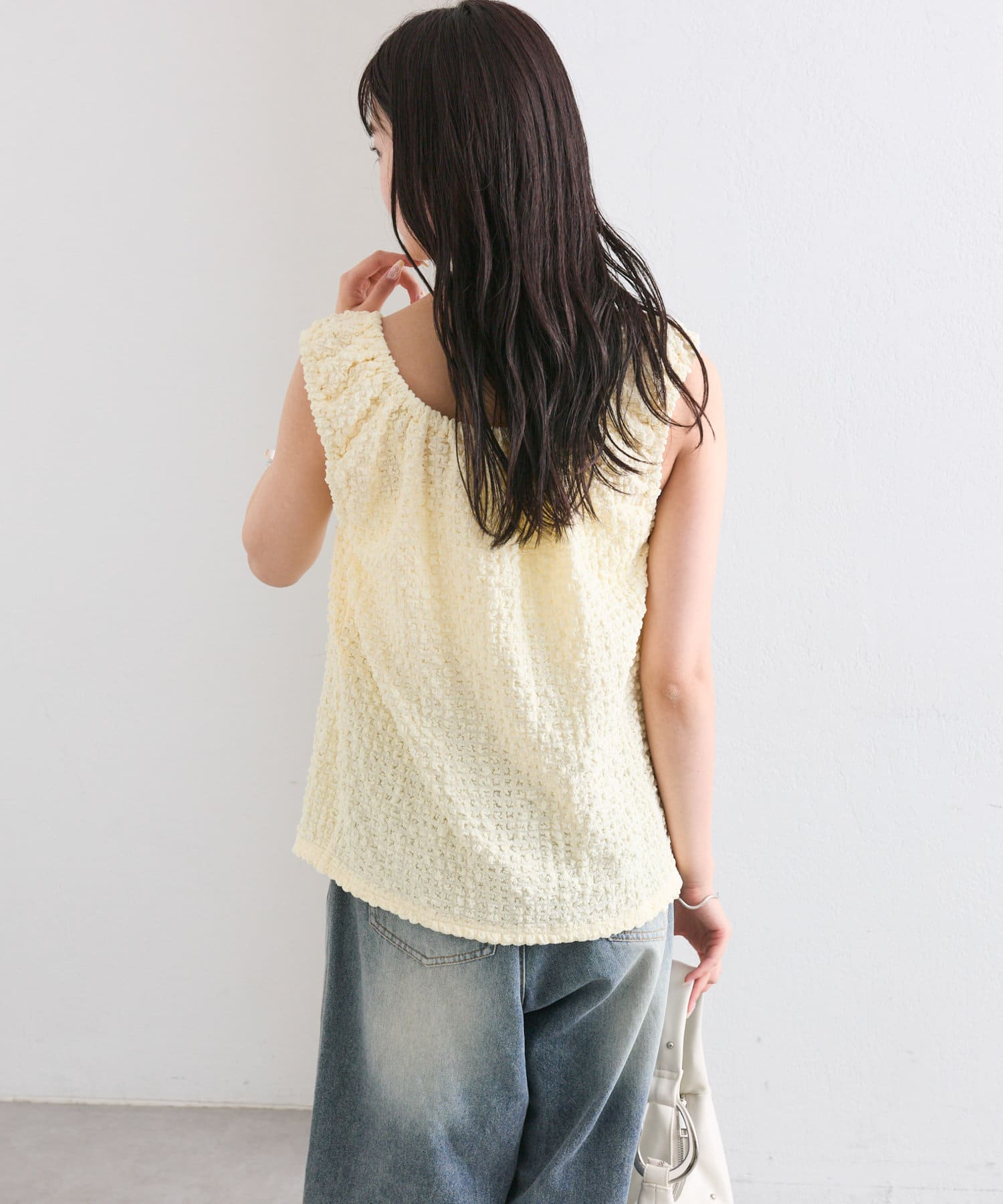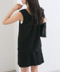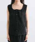 シャーリング素材の表面感のある生地のタンクトップ。