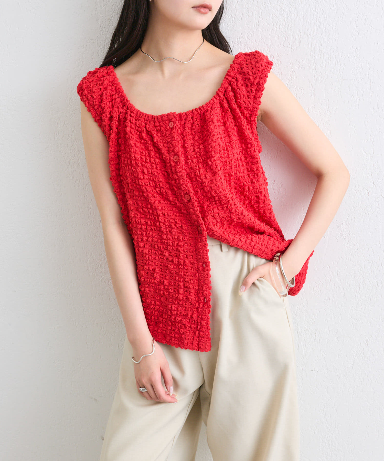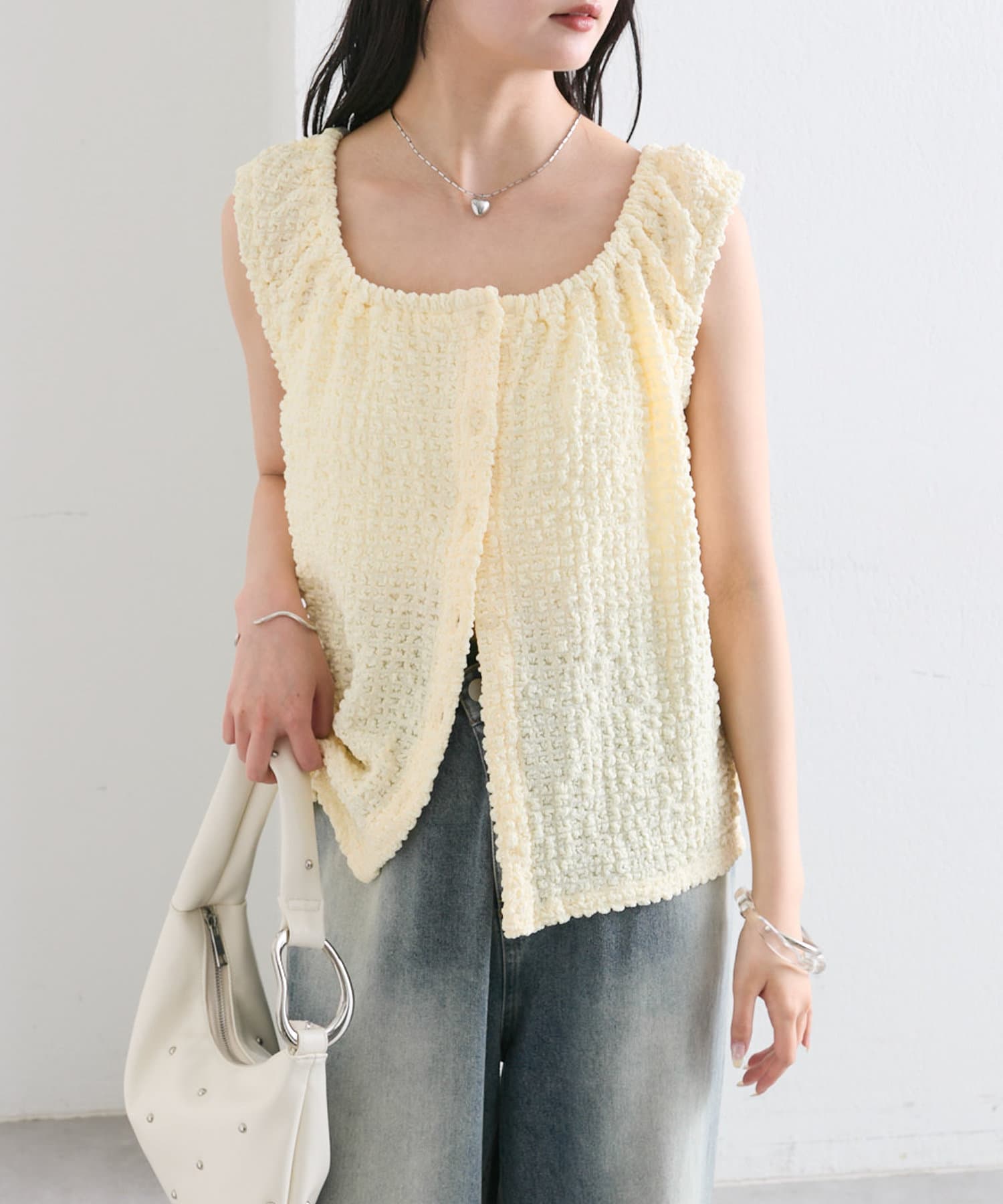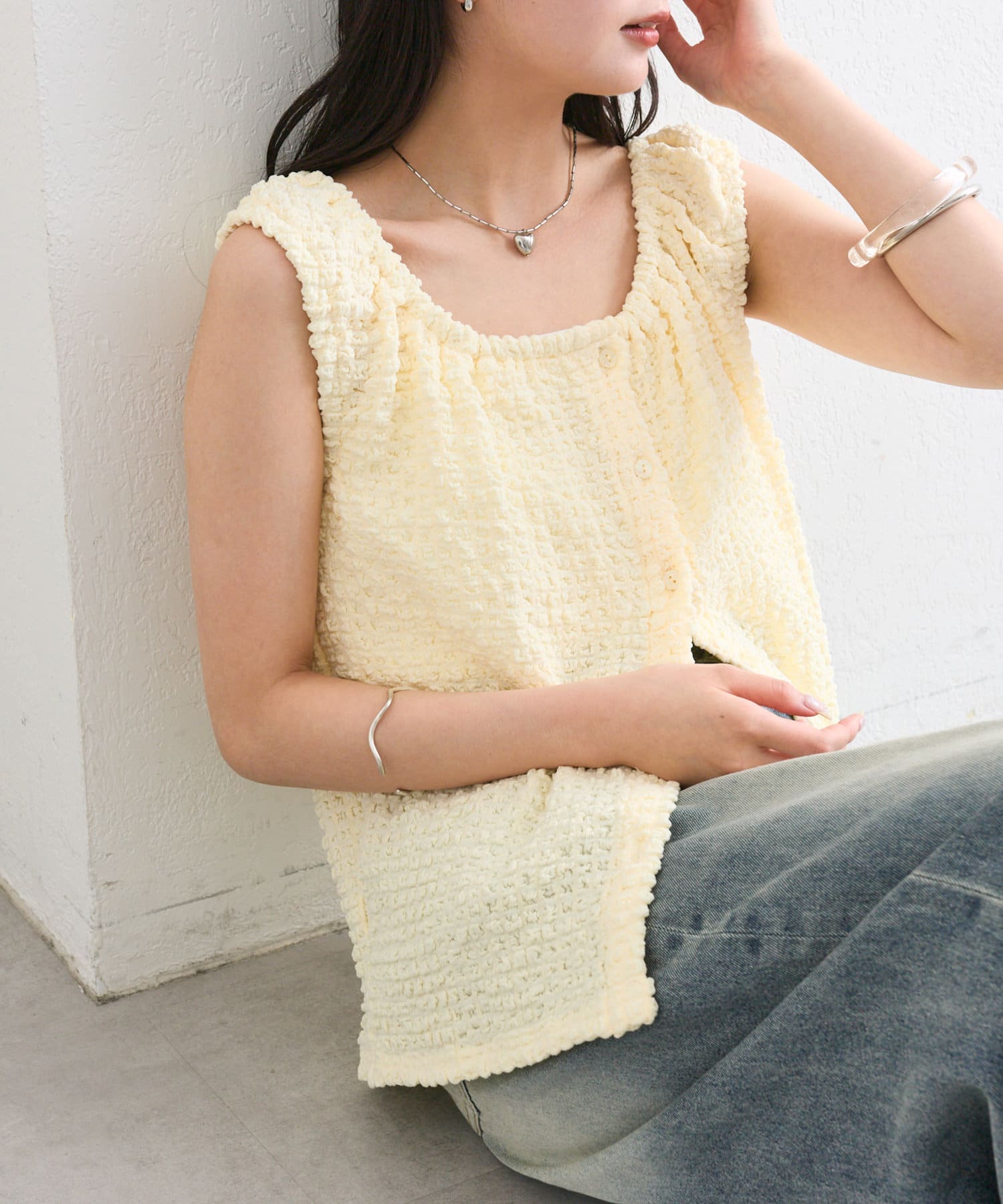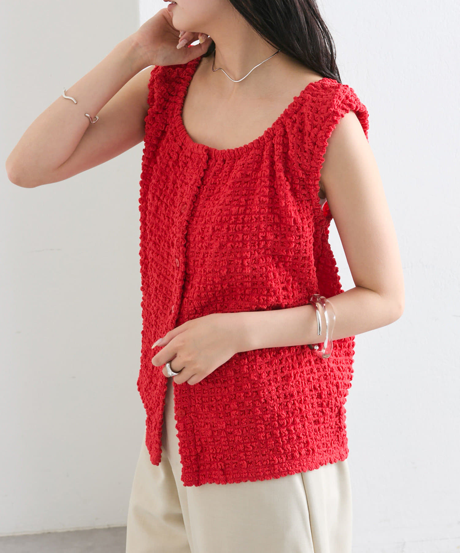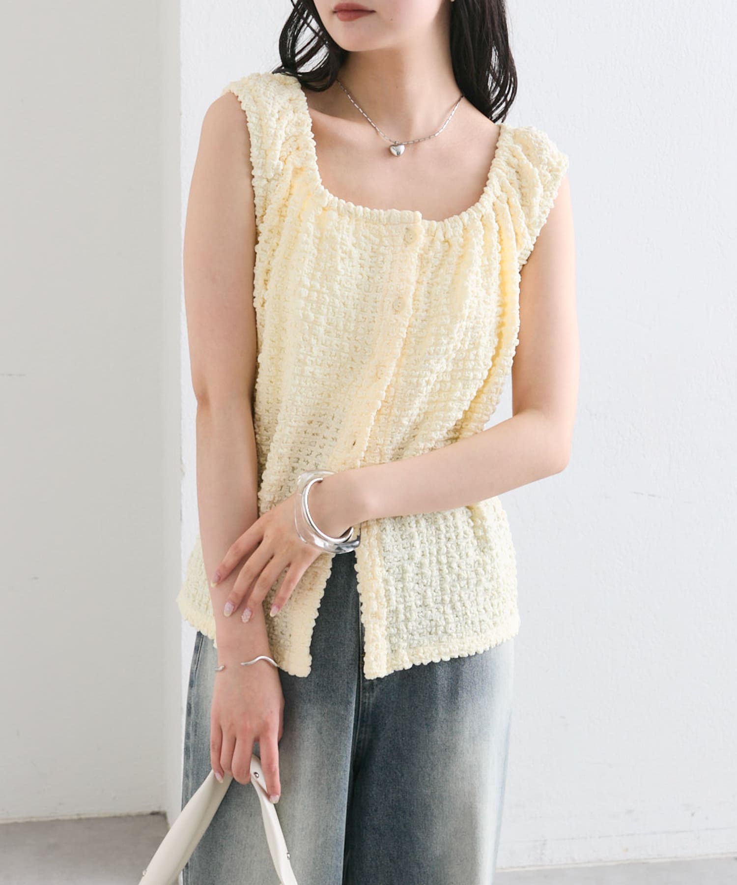 シャーリング素材の表面感のある生地のタンクトップ。