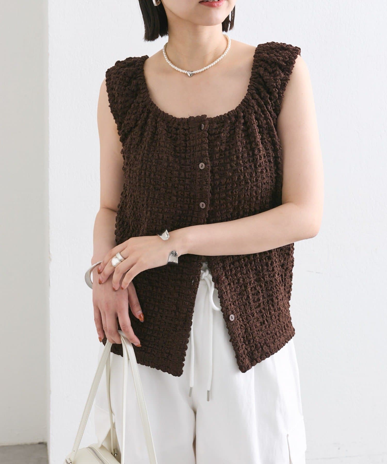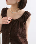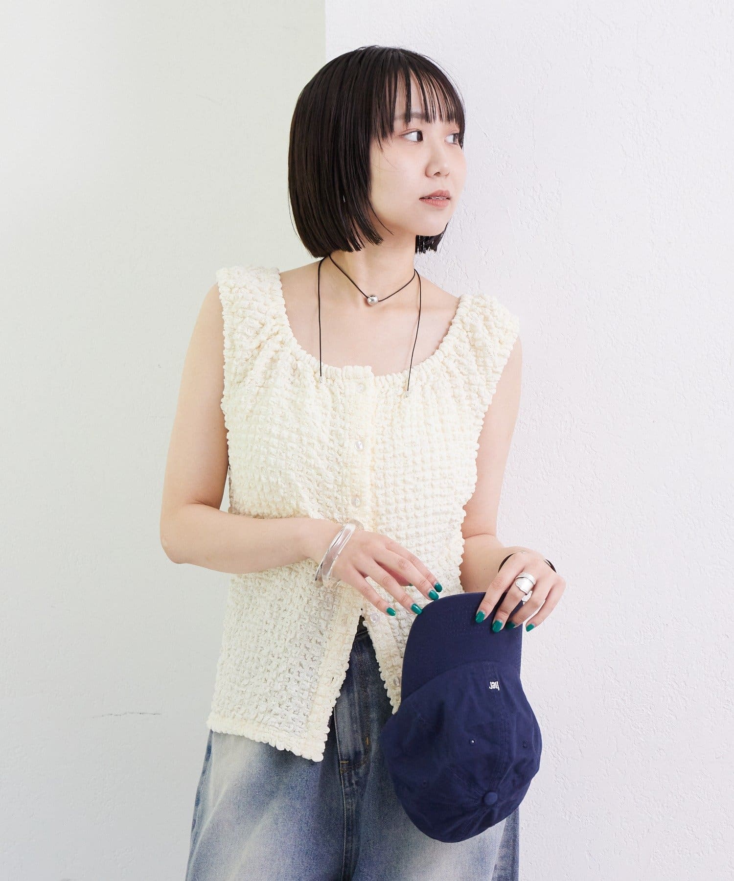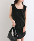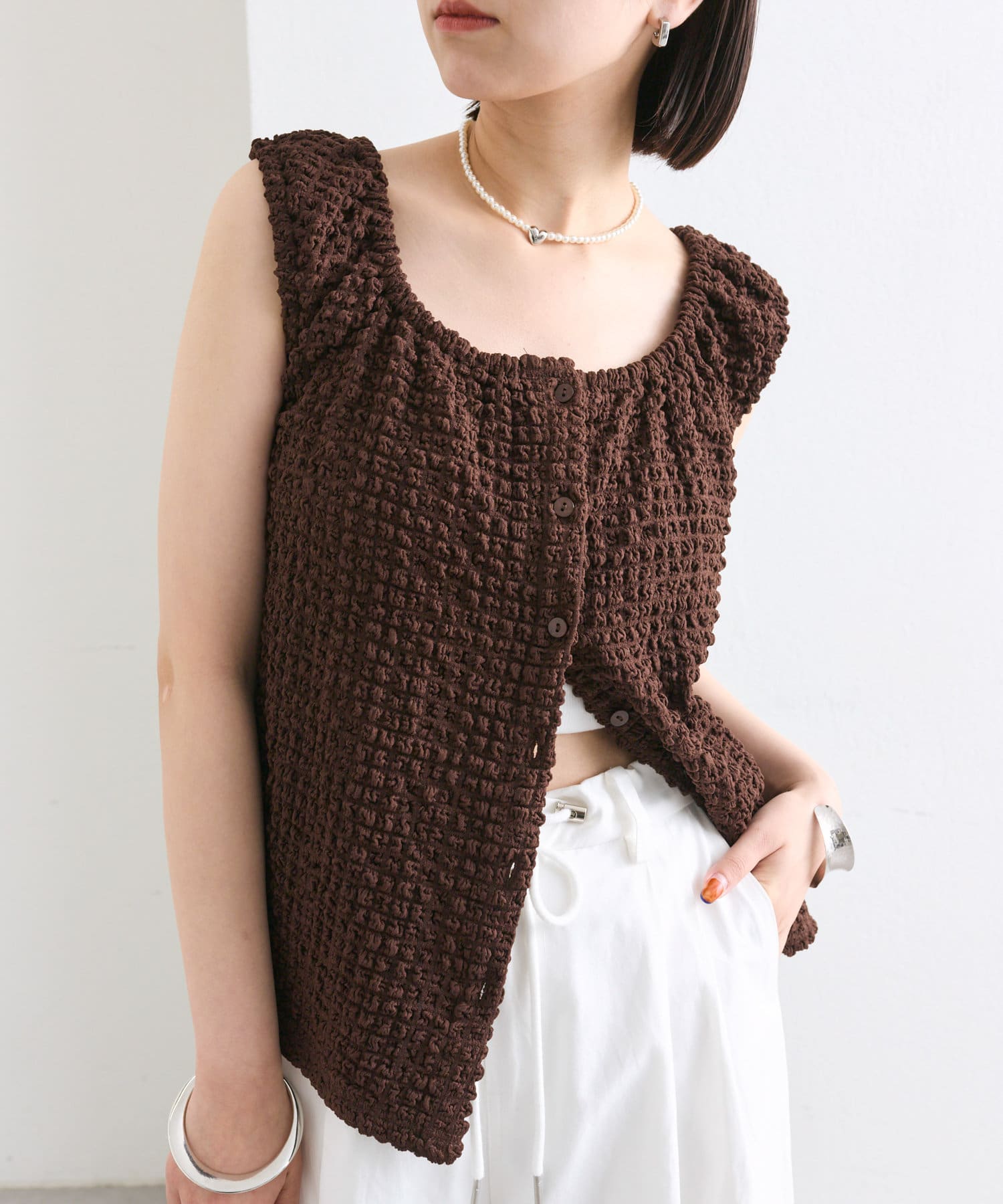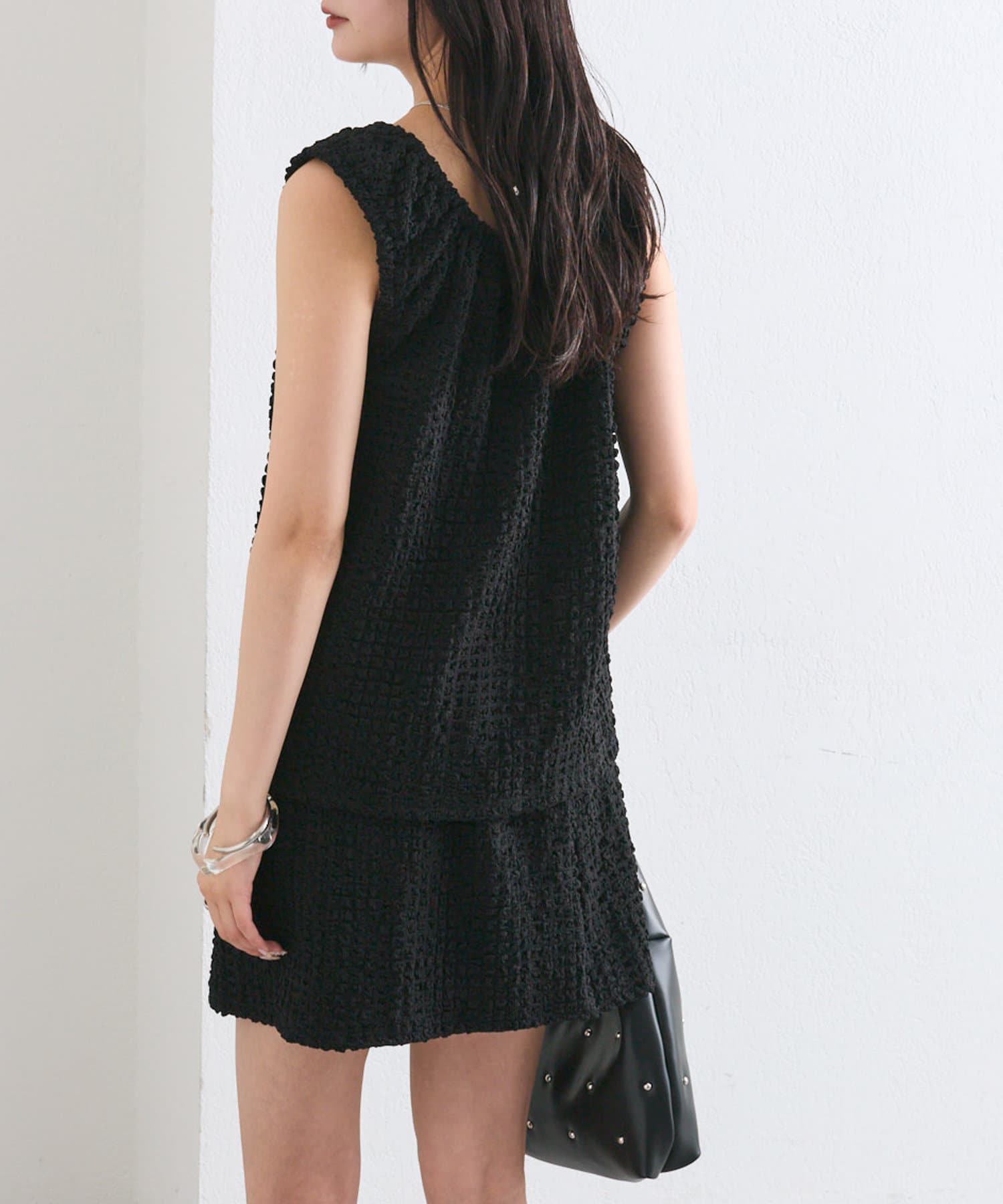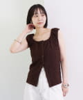 シャーリング素材の表面感のある生地のタンクトップ。