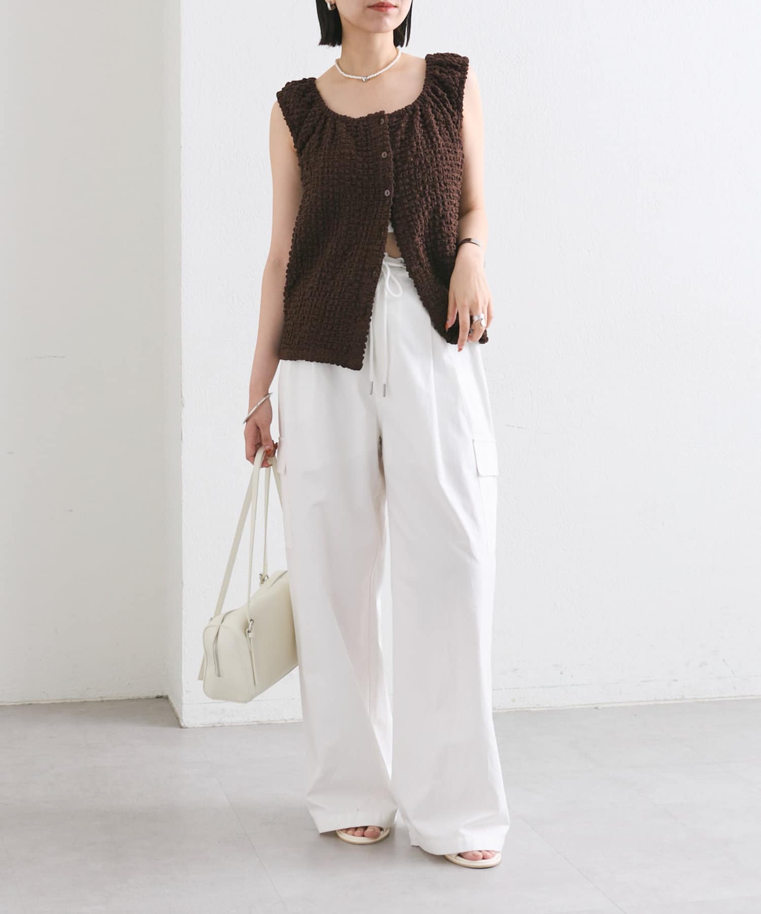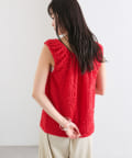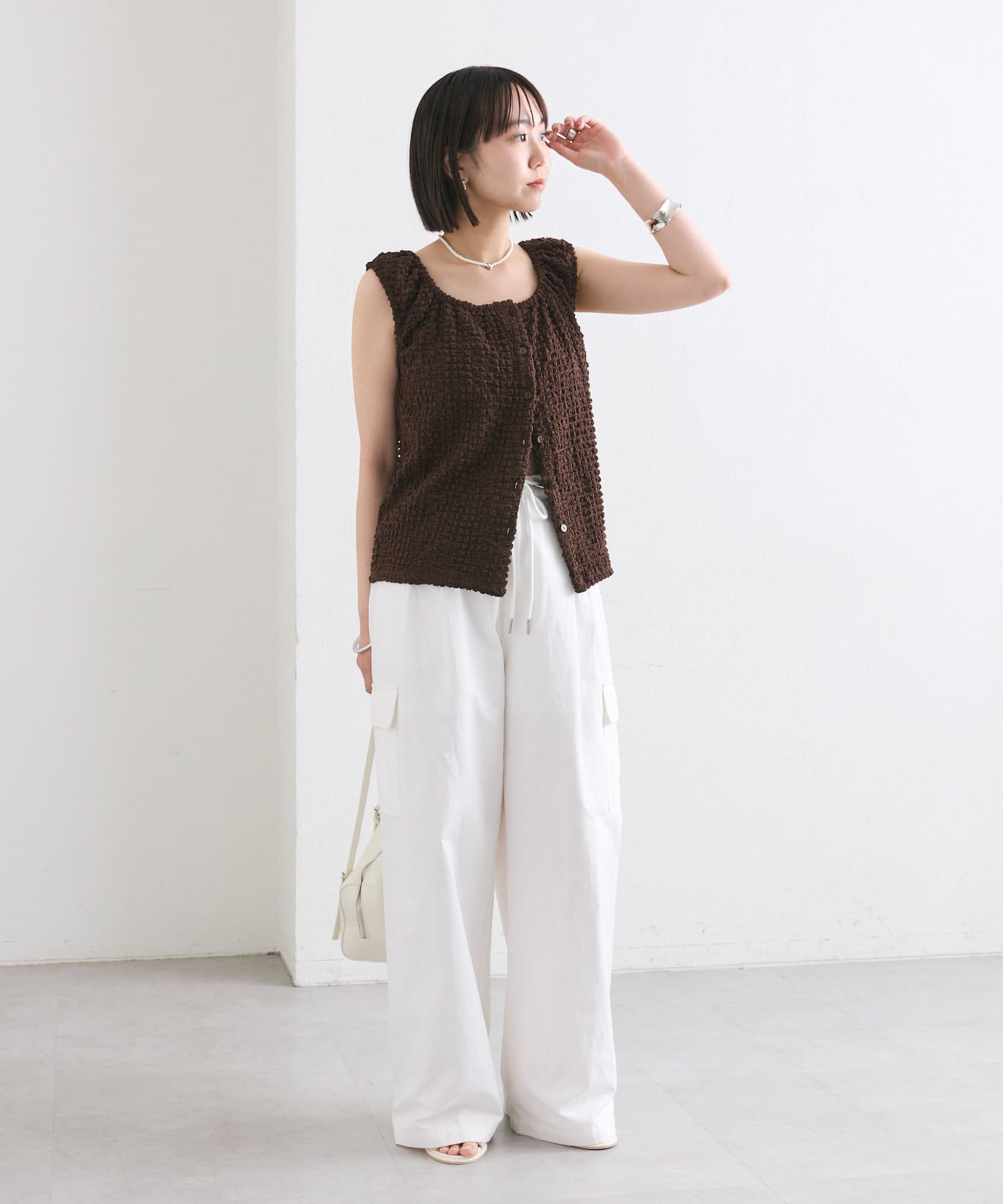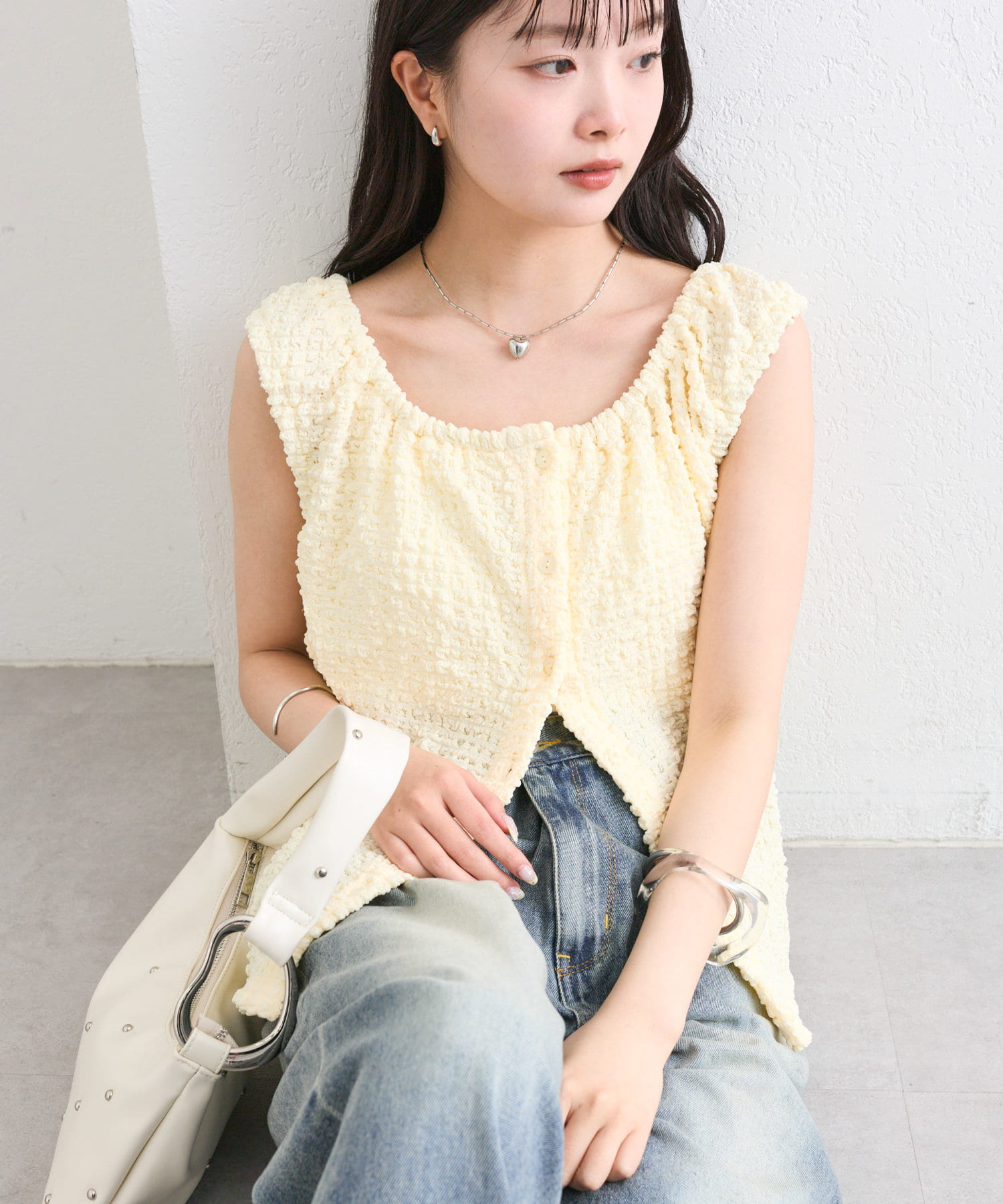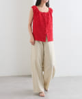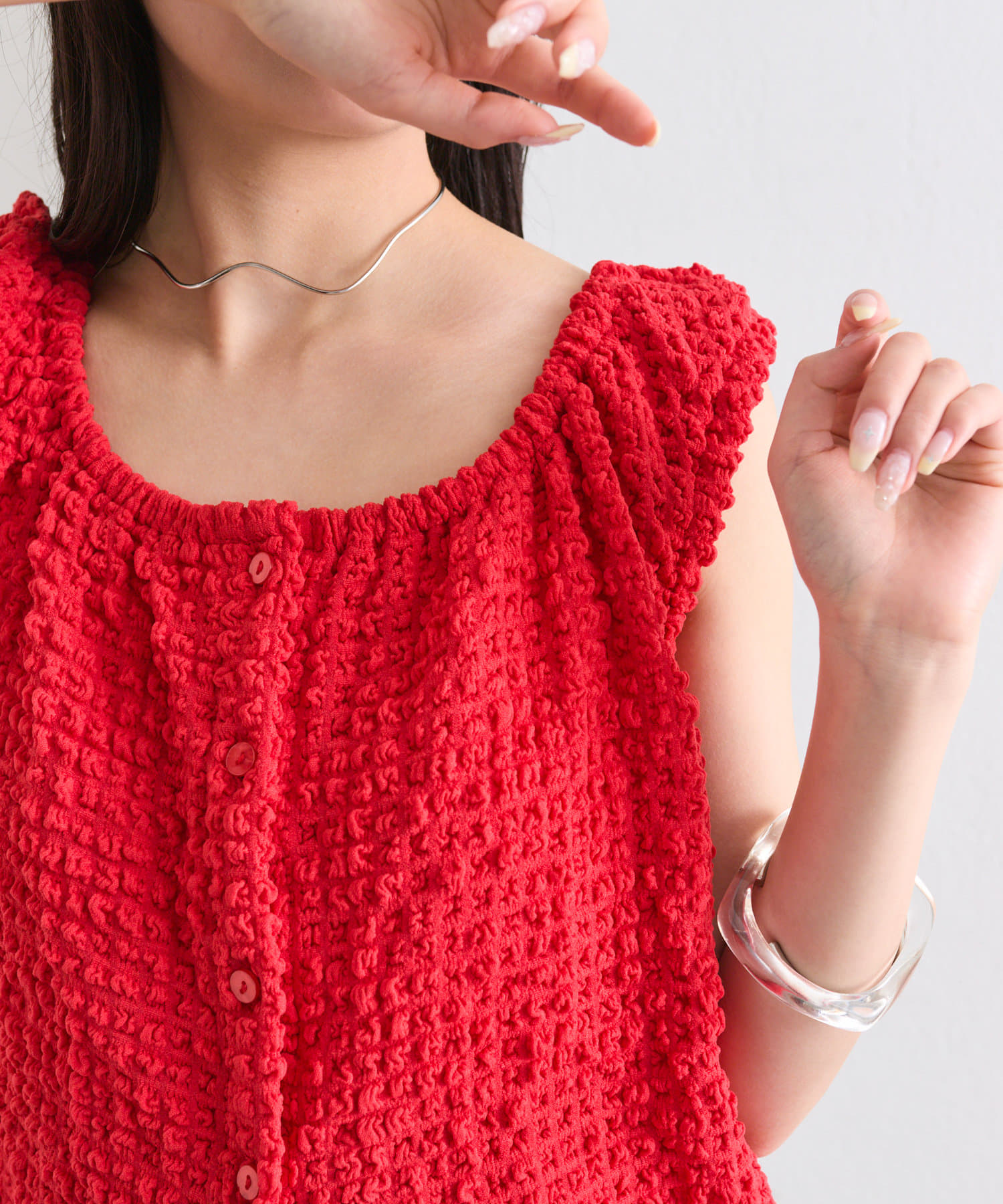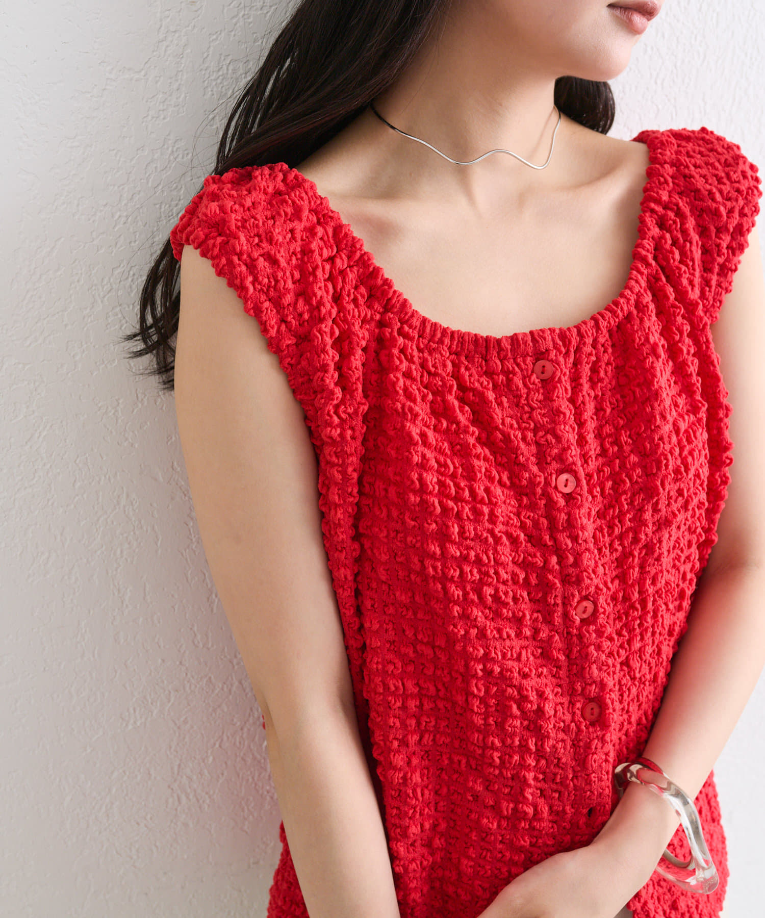 シャーリング素材の表面感のある生地のタンクトップ。