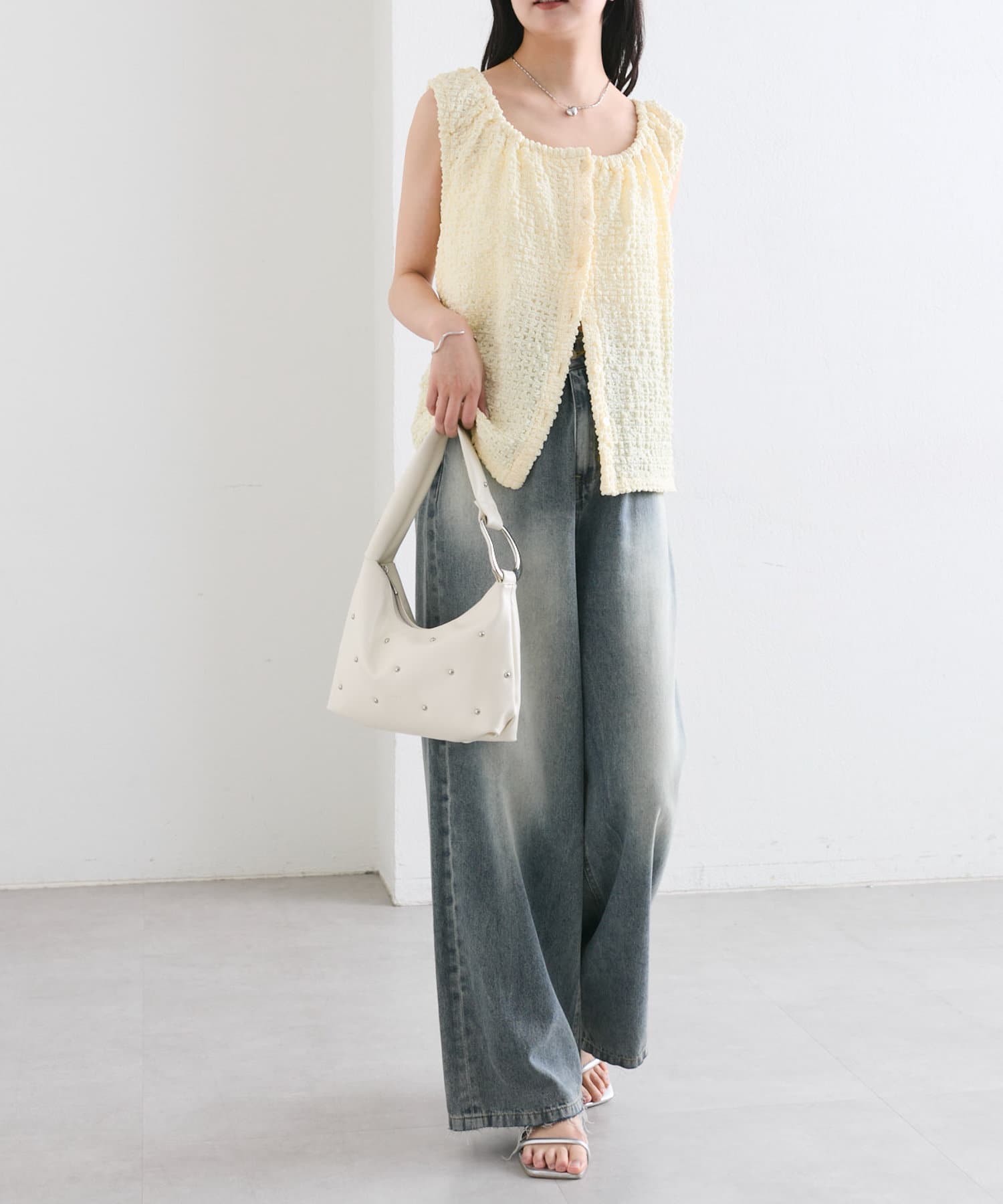 ワイドシルエットのデニムやスウェットパンツとの合わせでバランスよく◎