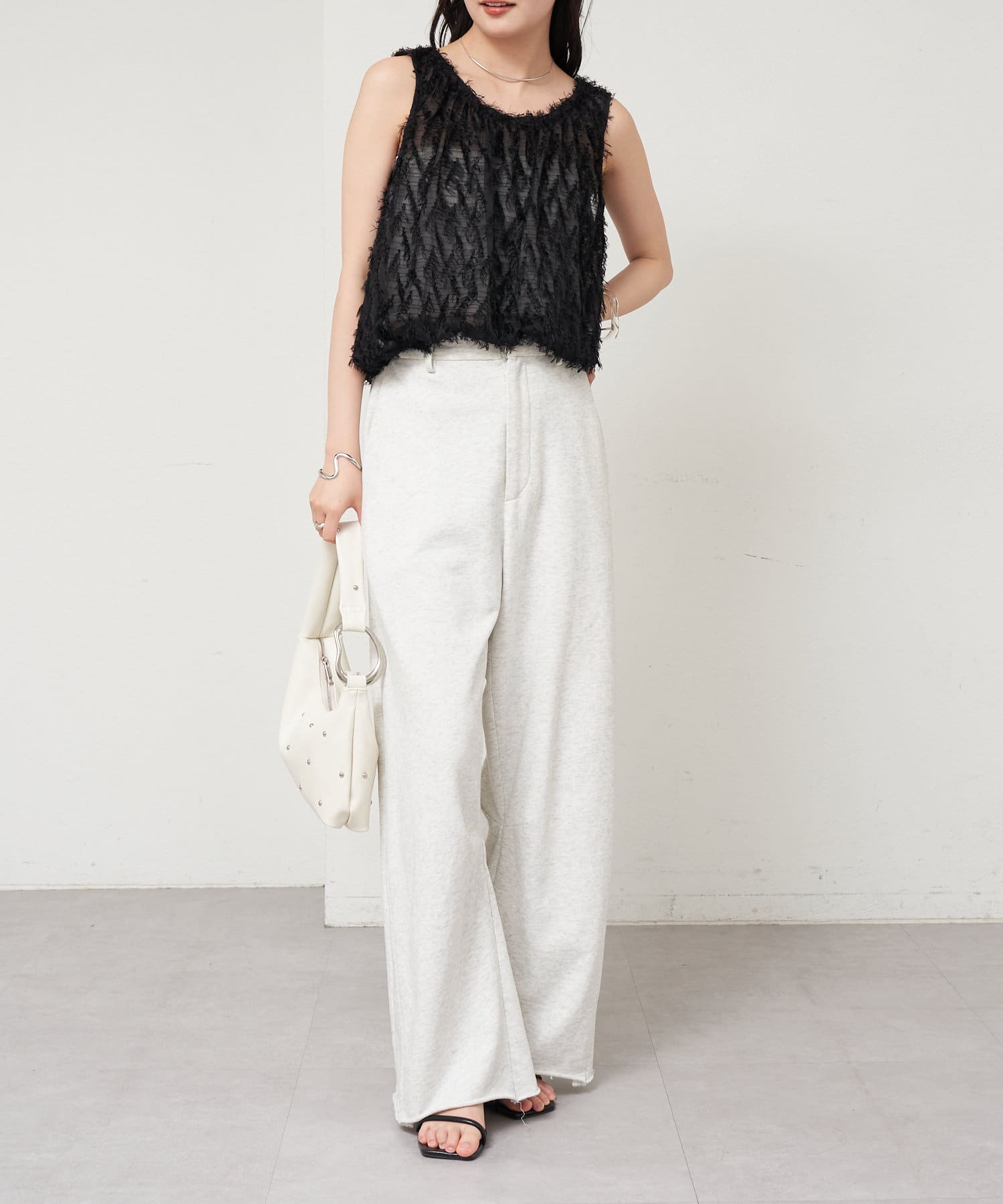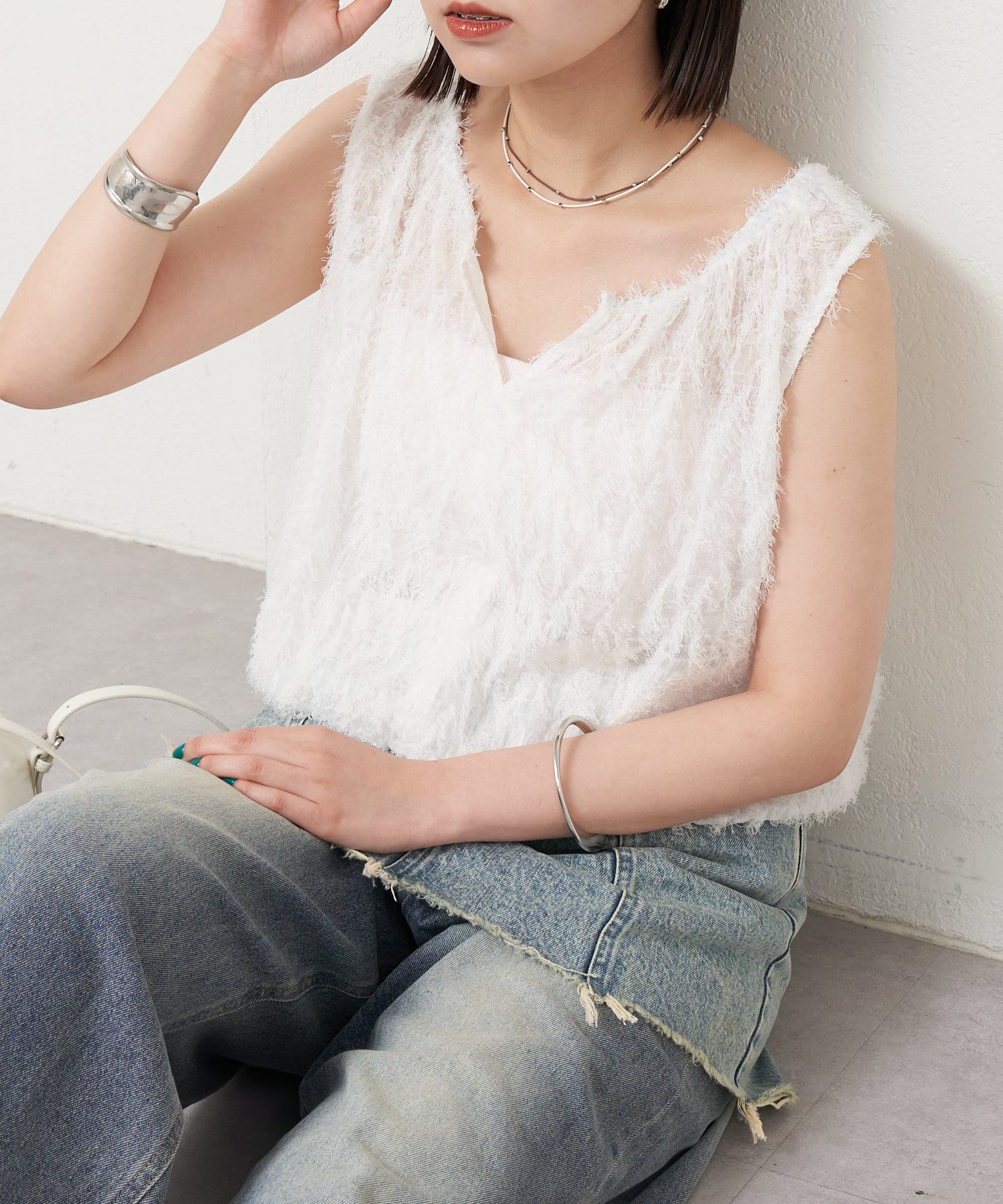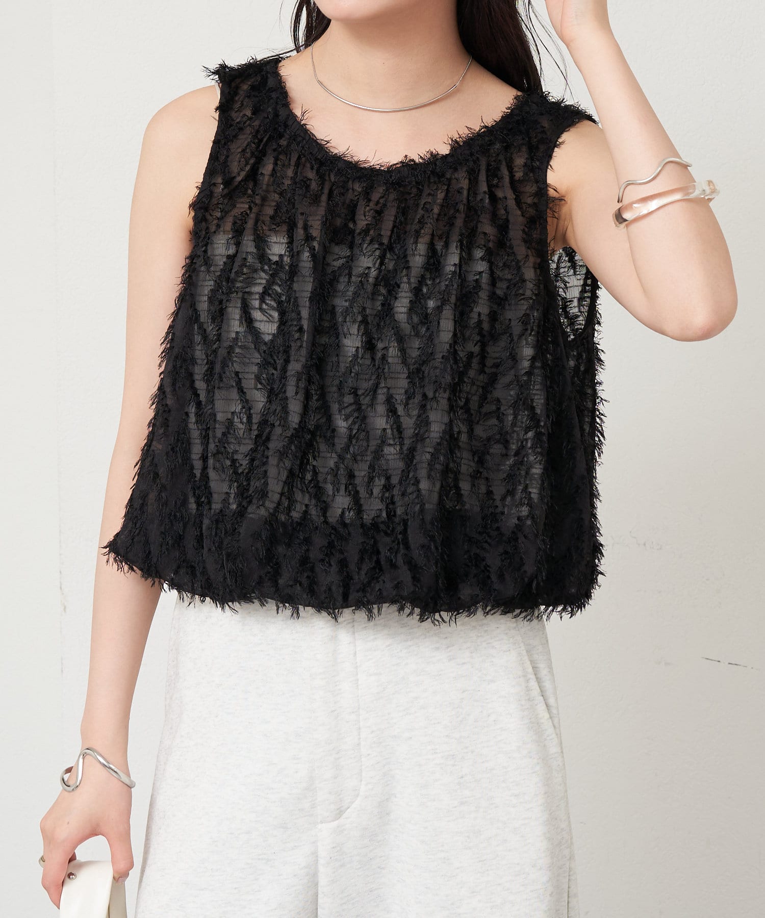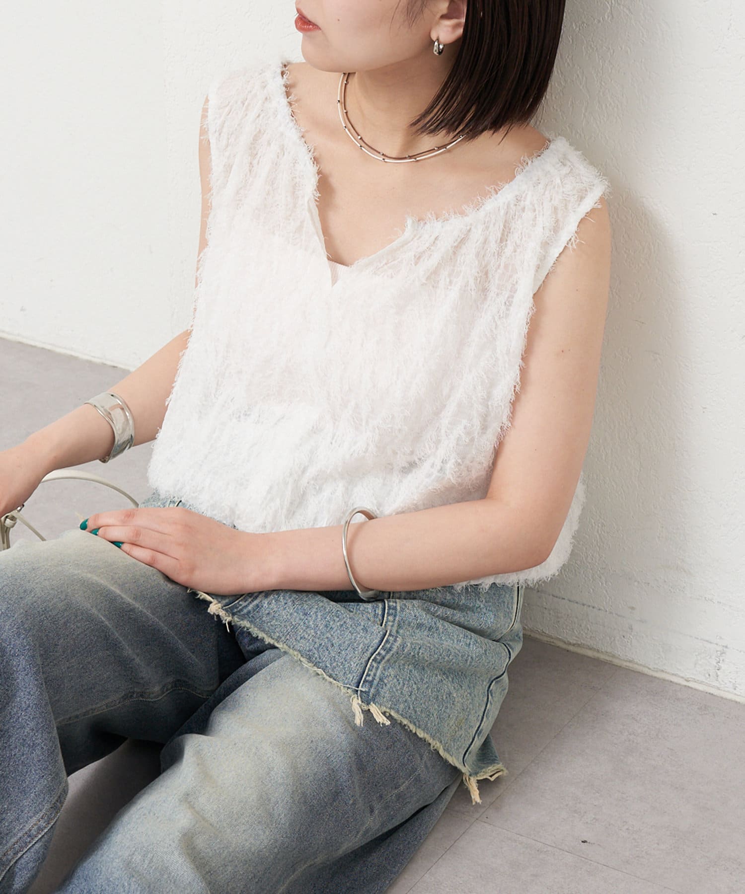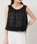 全体にフリンジをあしらい、透け感のあるシアー素材を重ねることで、軽やかさとトレンド感をプラス。