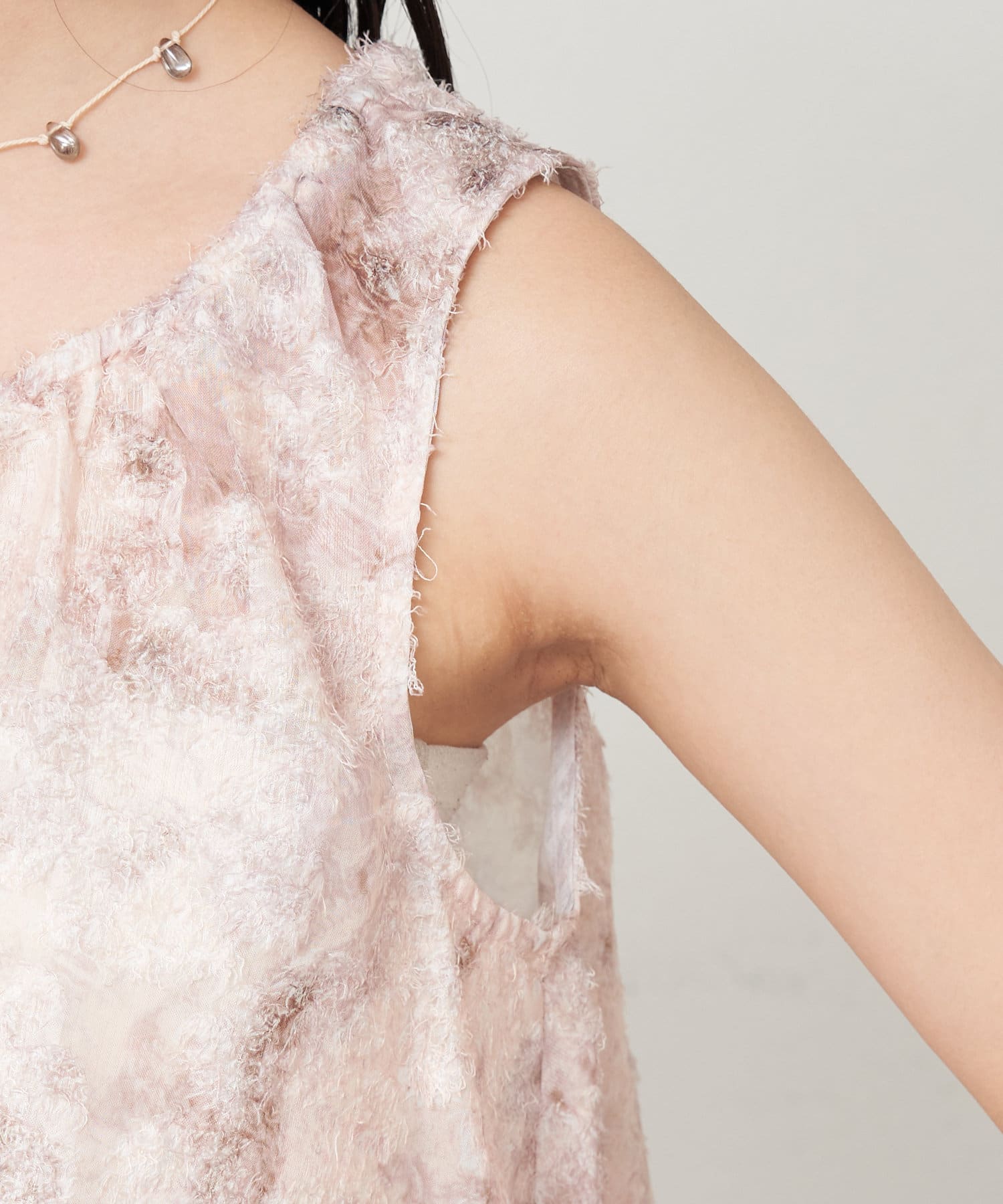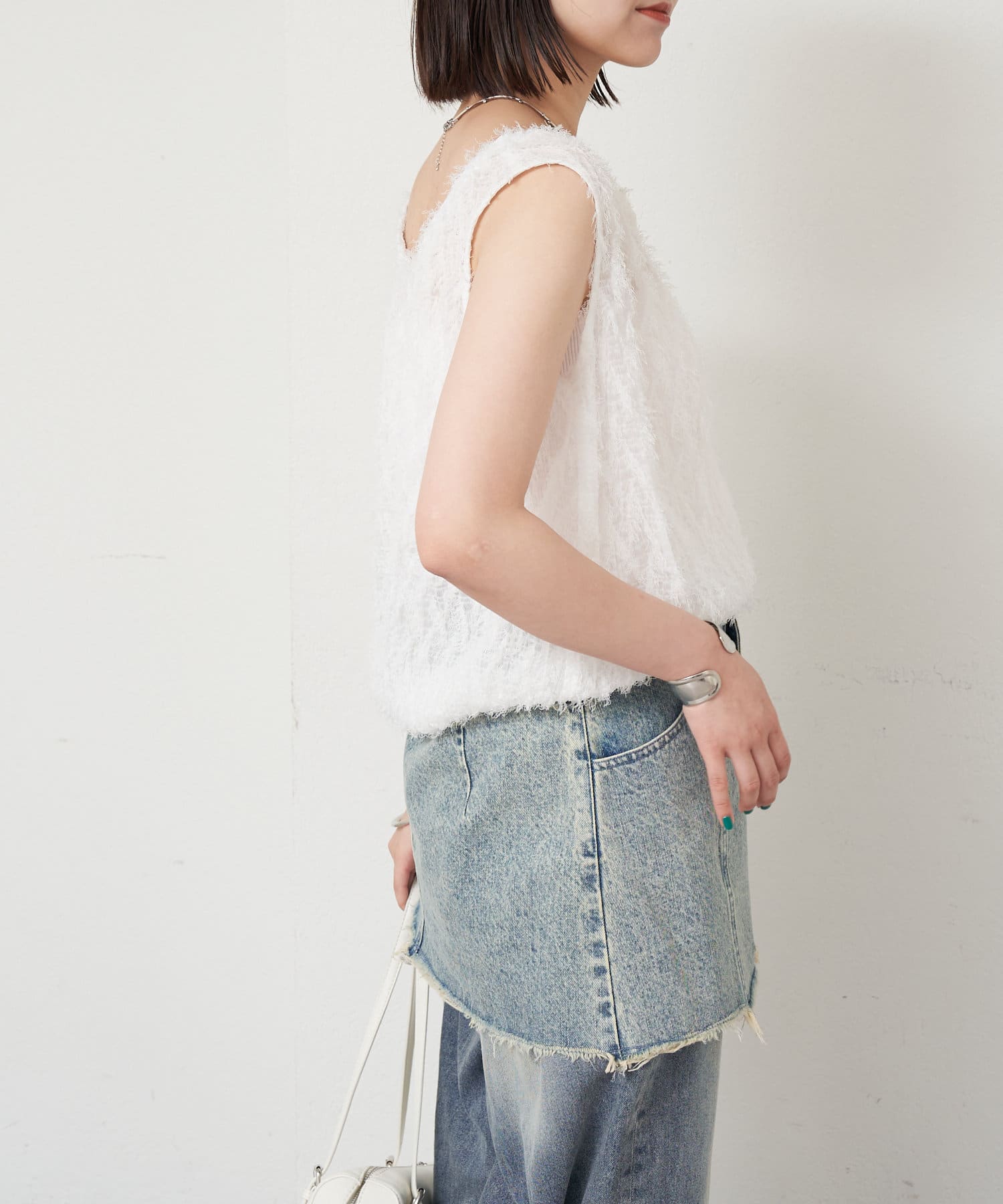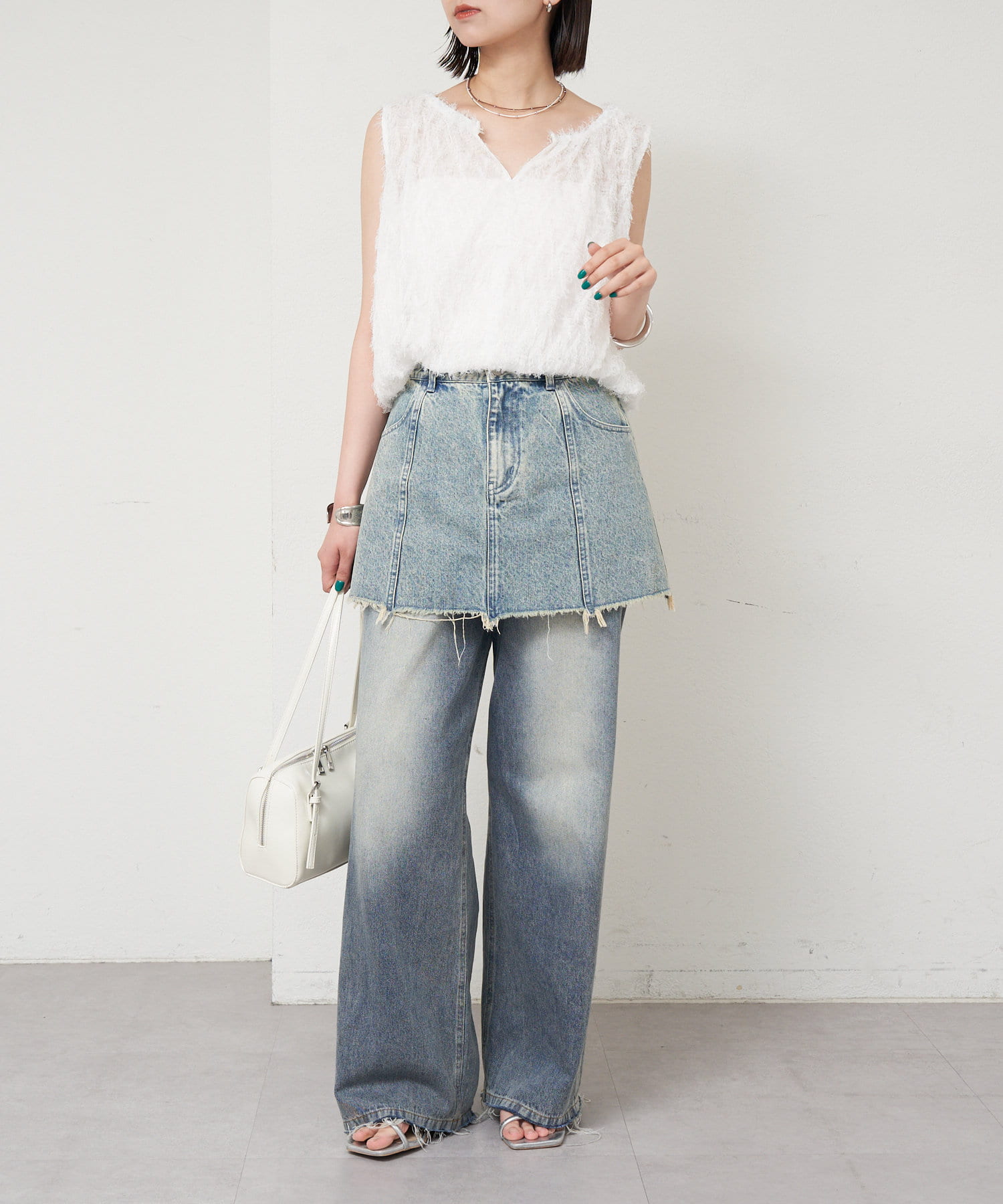 全体にフリンジをあしらい、透け感のあるシアー素材を重ねることで、軽やかさとトレンド感をプラス。