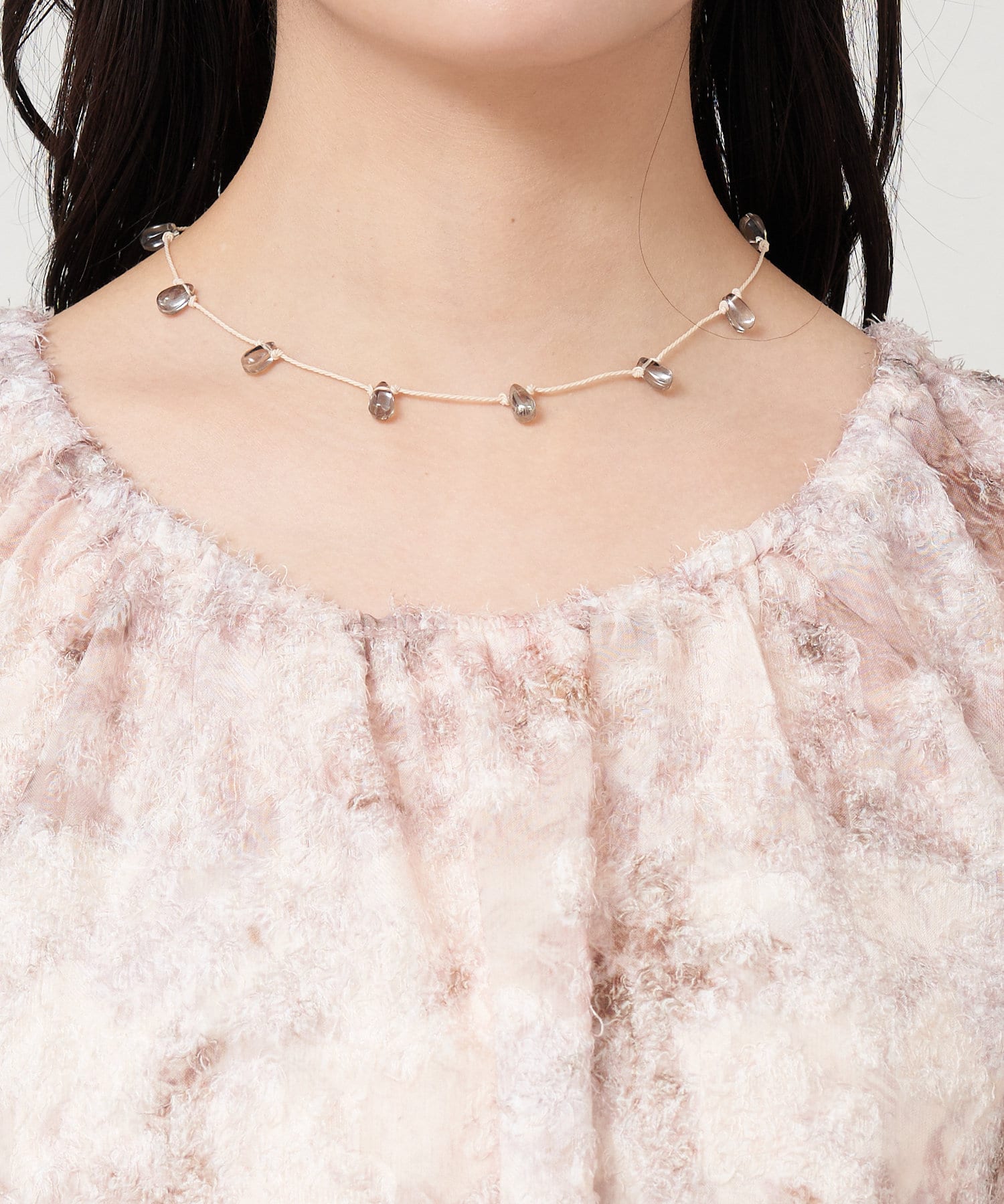 首元が空いているので、ネックレス等のアクセサリーをつけるとワンポイントに。