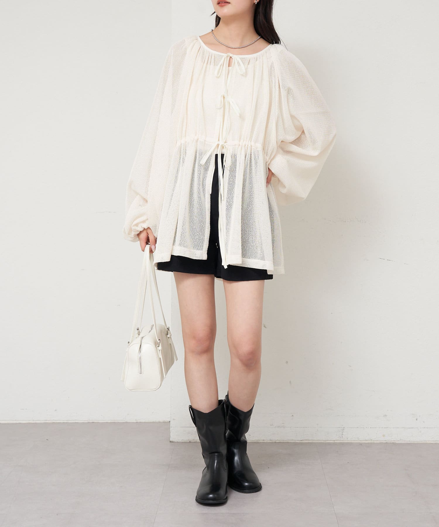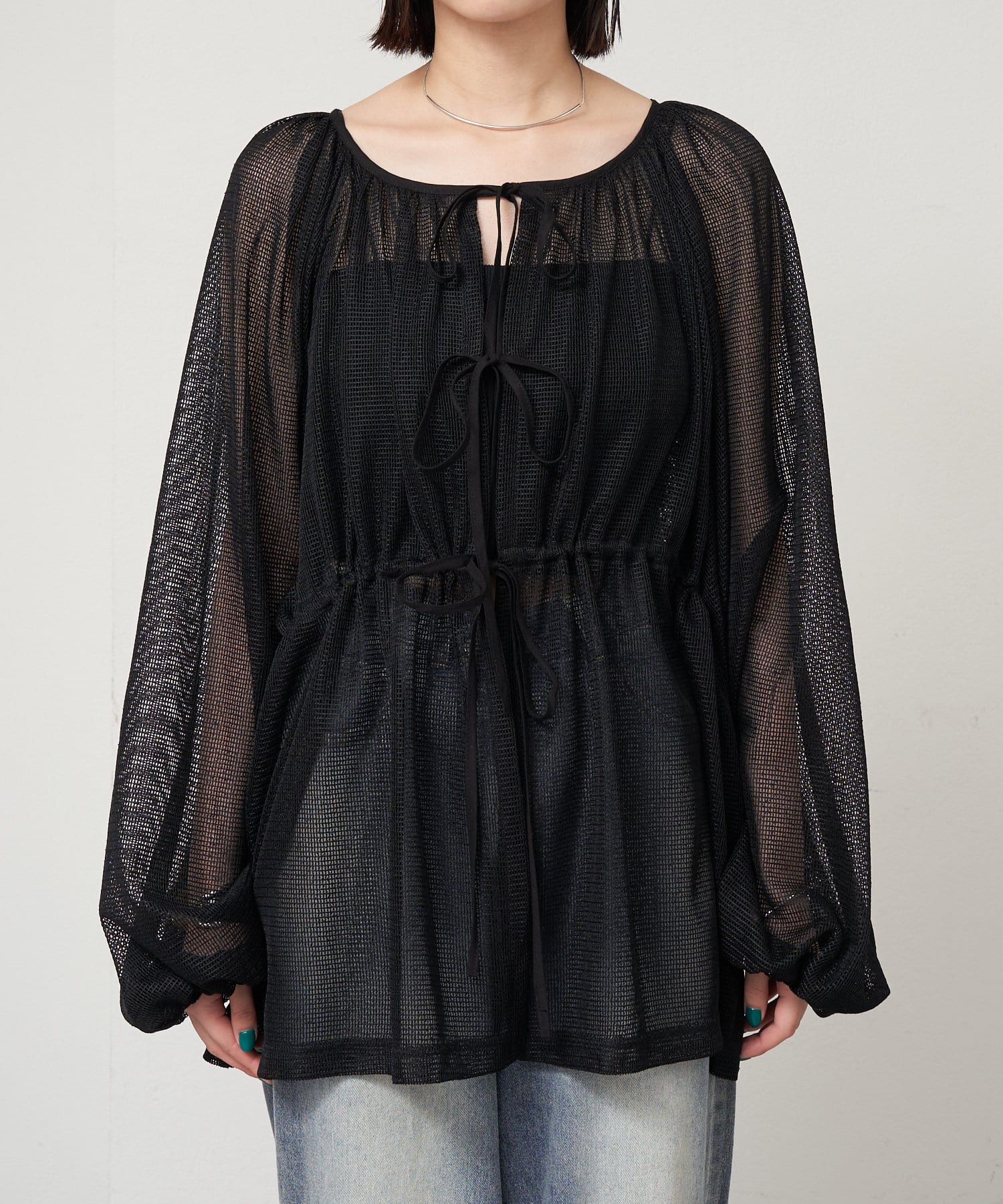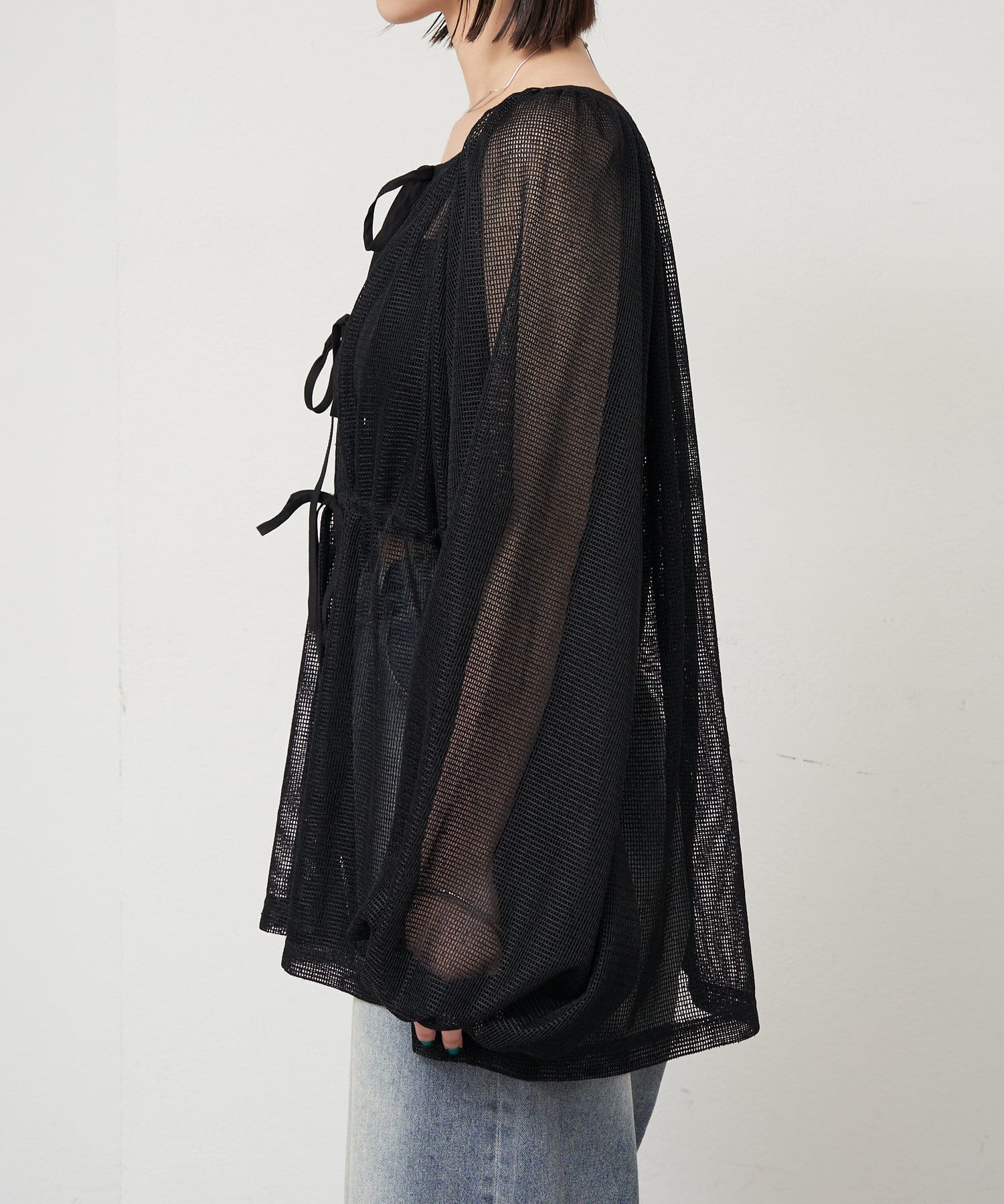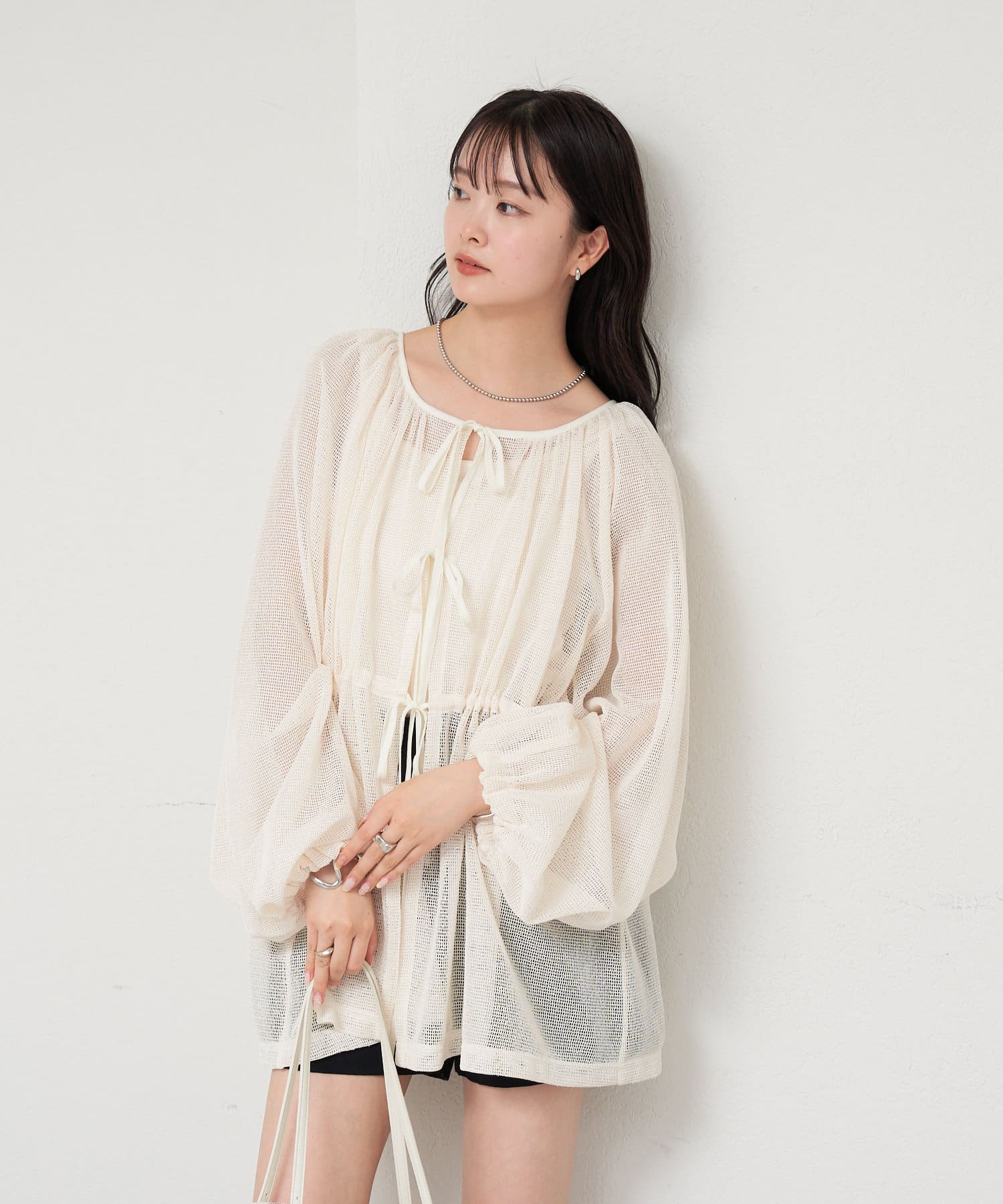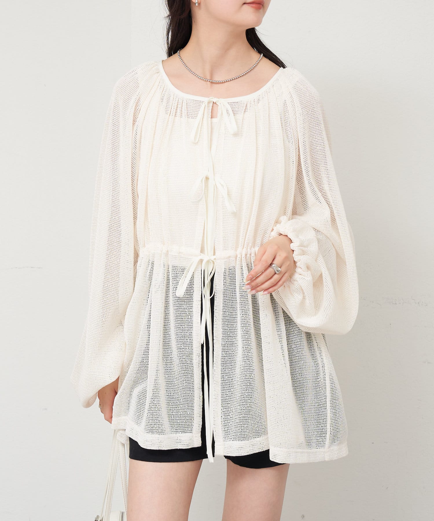 ・メッシュ素材でフロントの結べるリボンが可愛らしいブラウス。