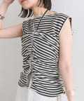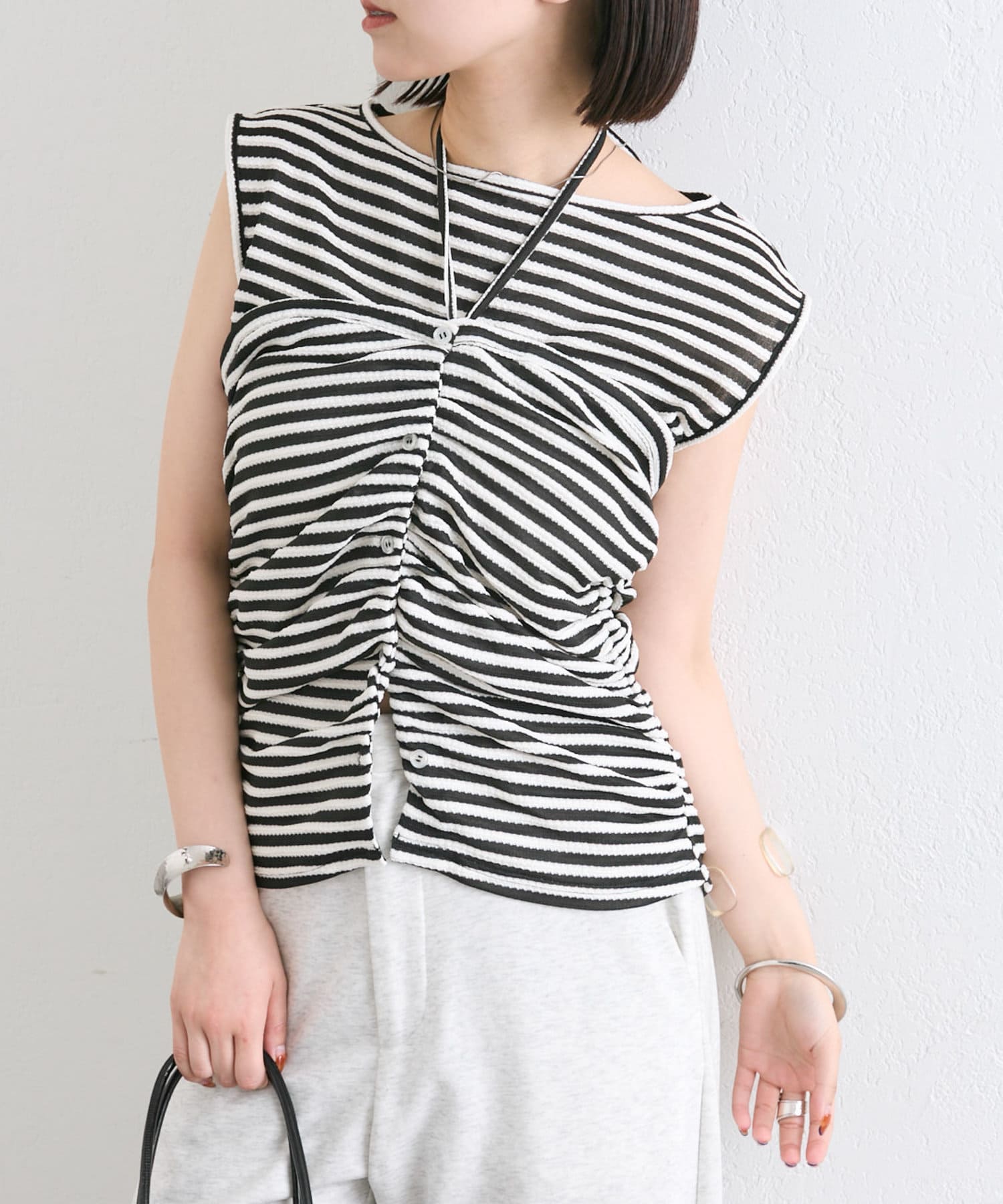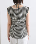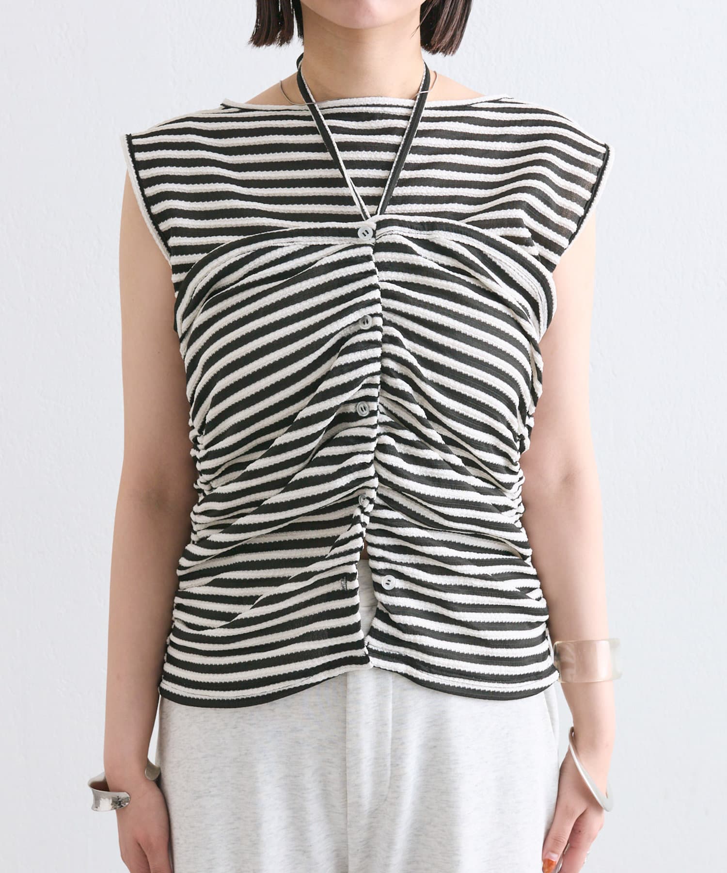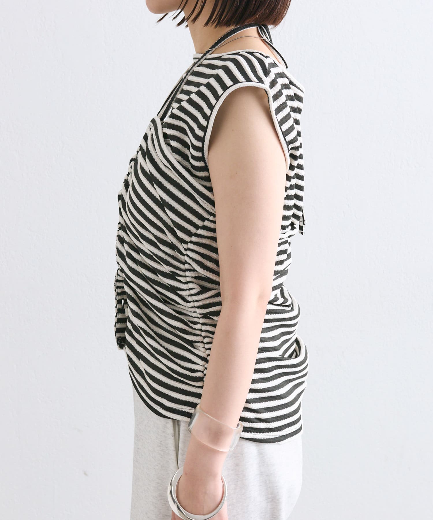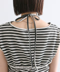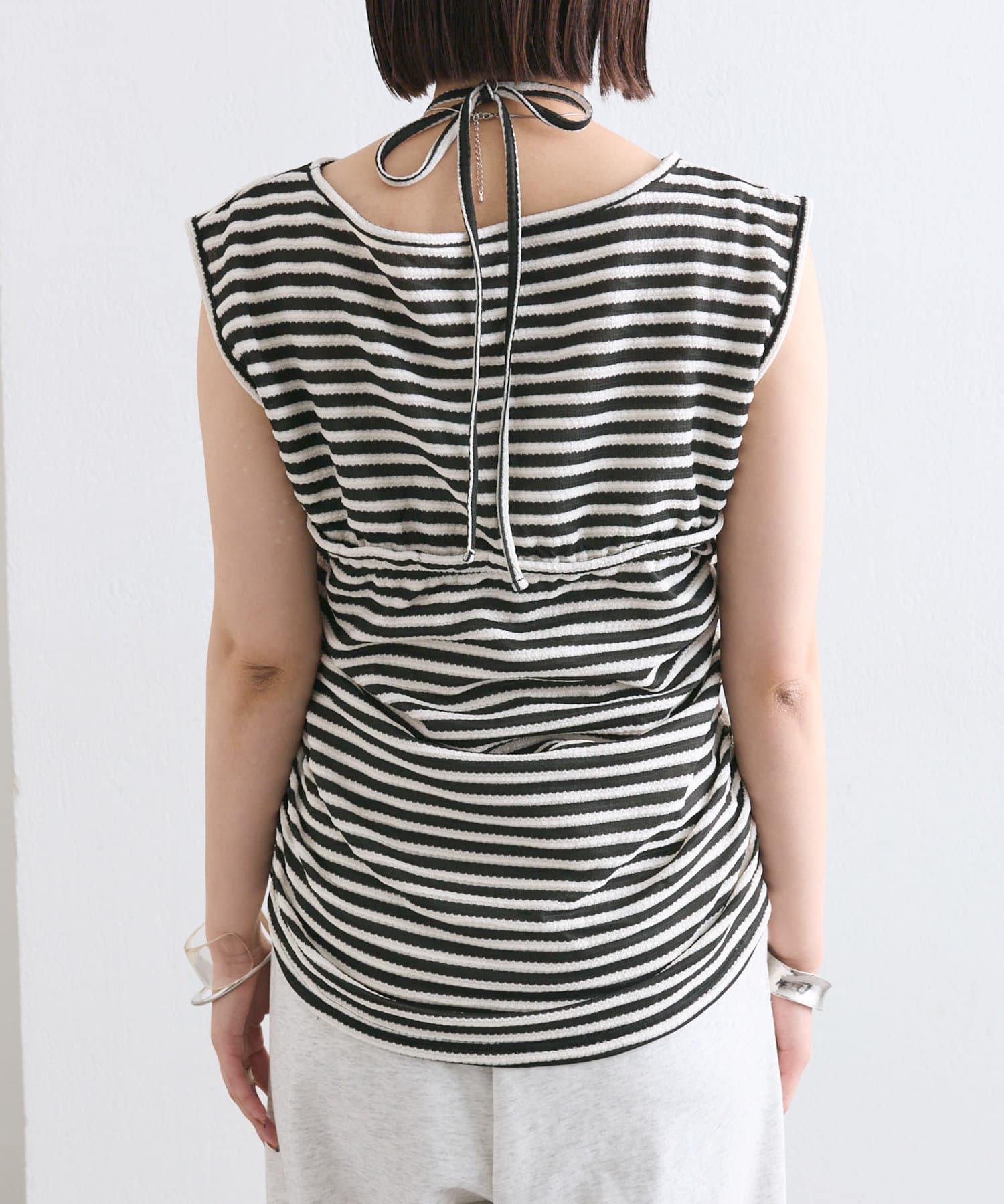 チョーカーが施されており、前と横にギャザーが入っている仕様のタンクトップ。