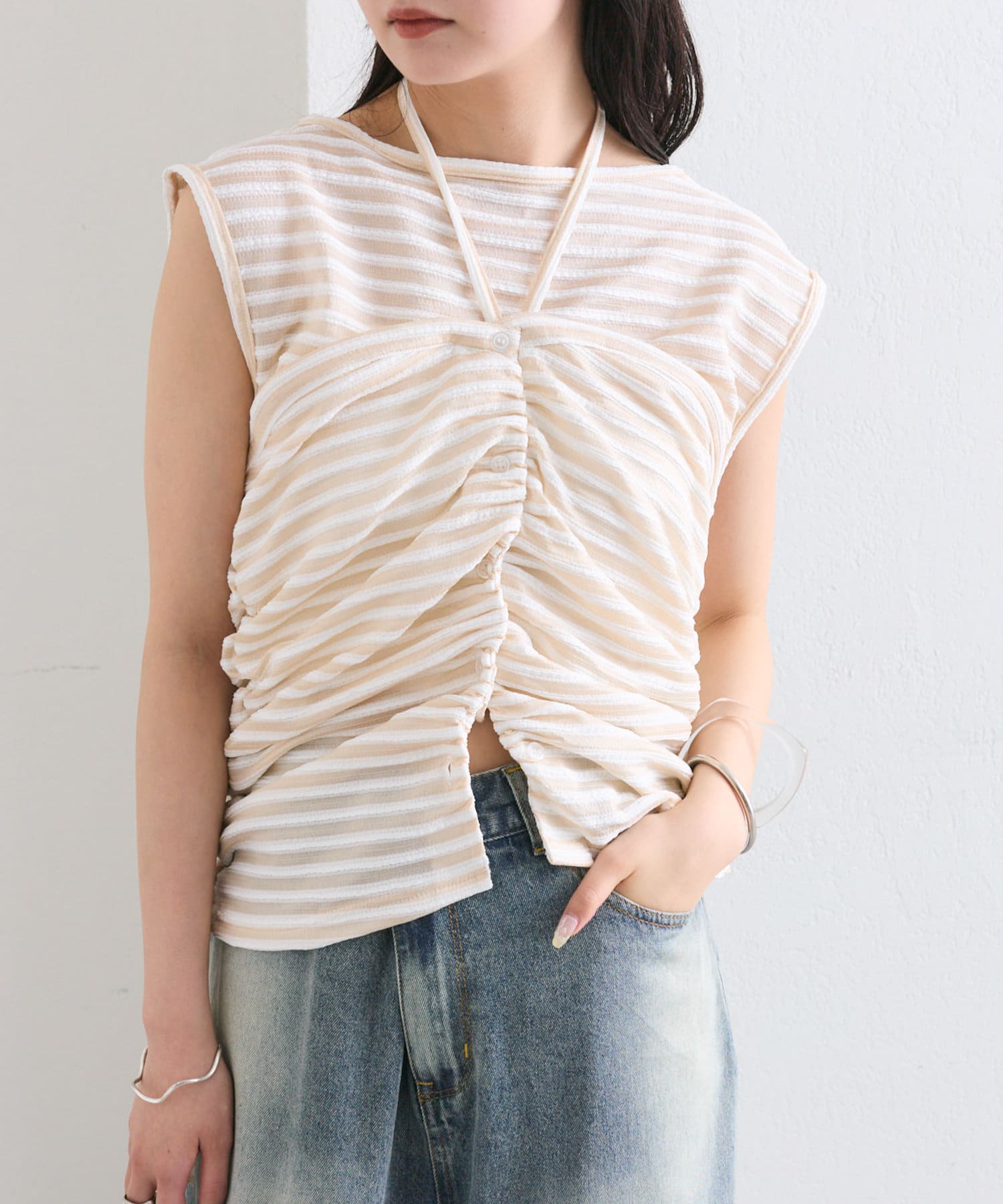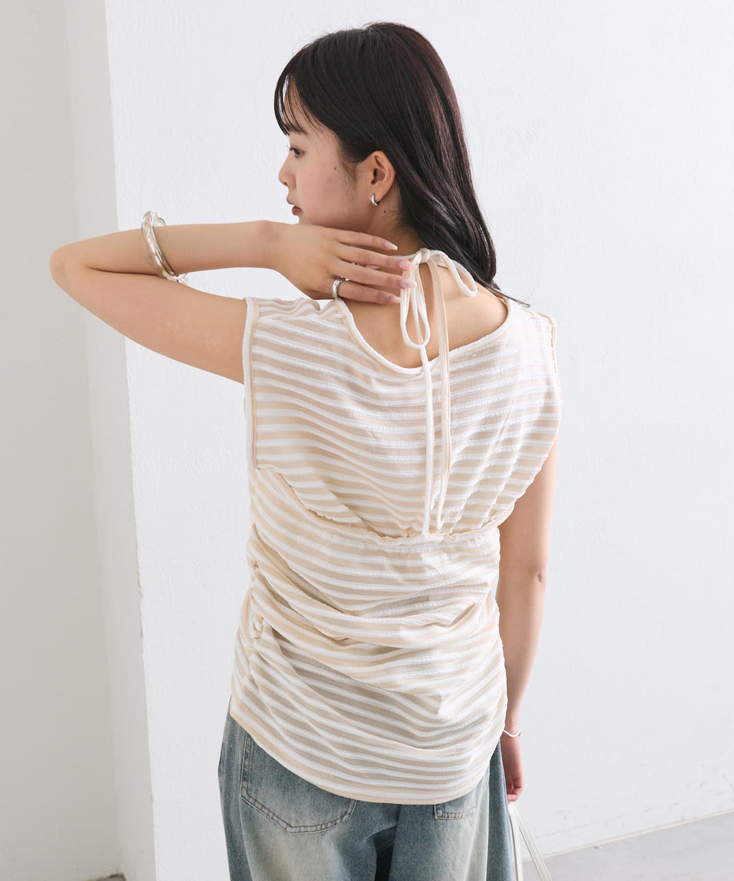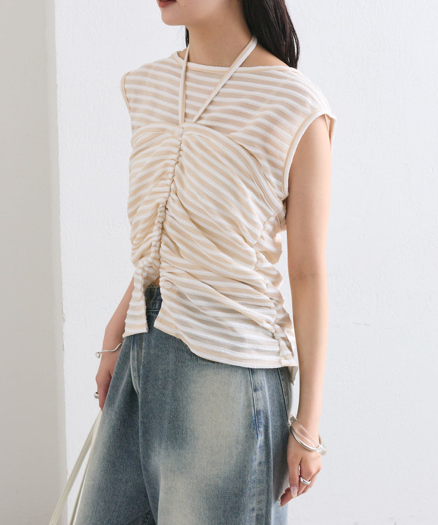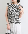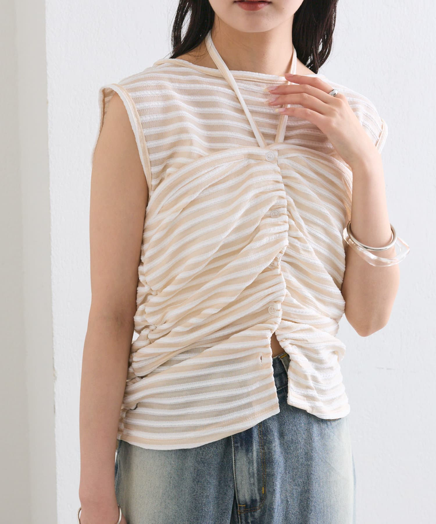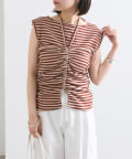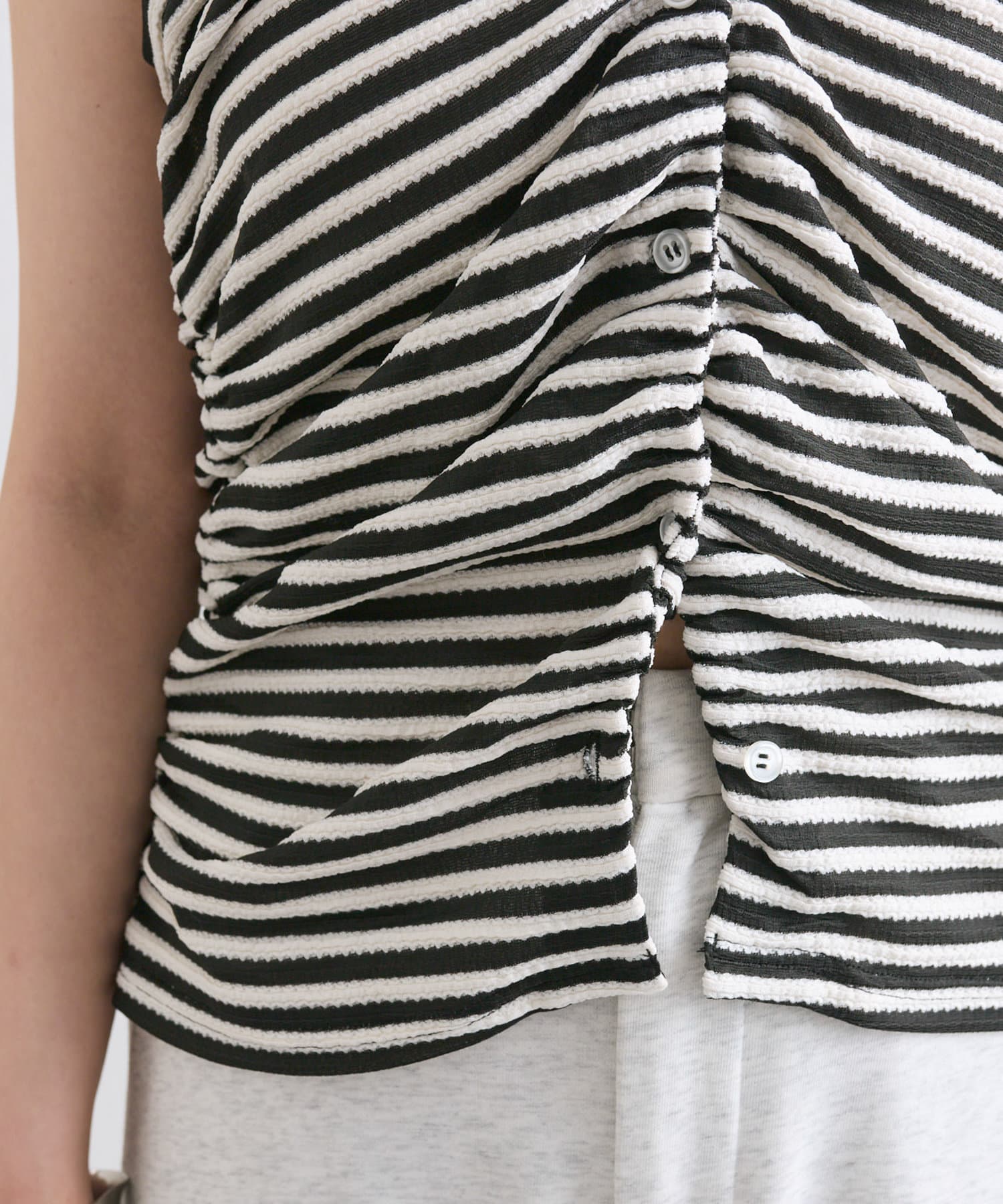 チョーカーが施されており、前と横にギャザーが入っている仕様のタンクトップ。