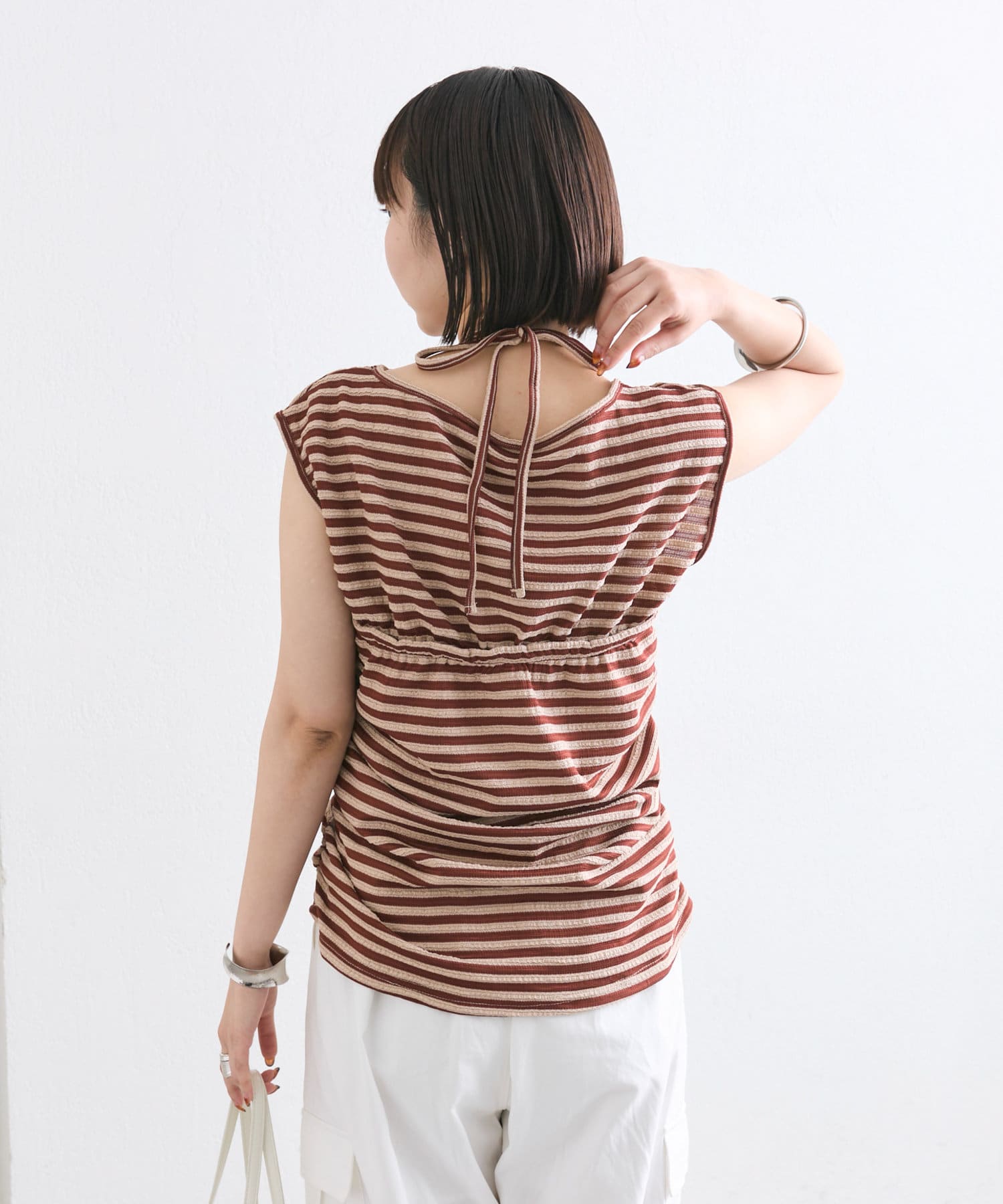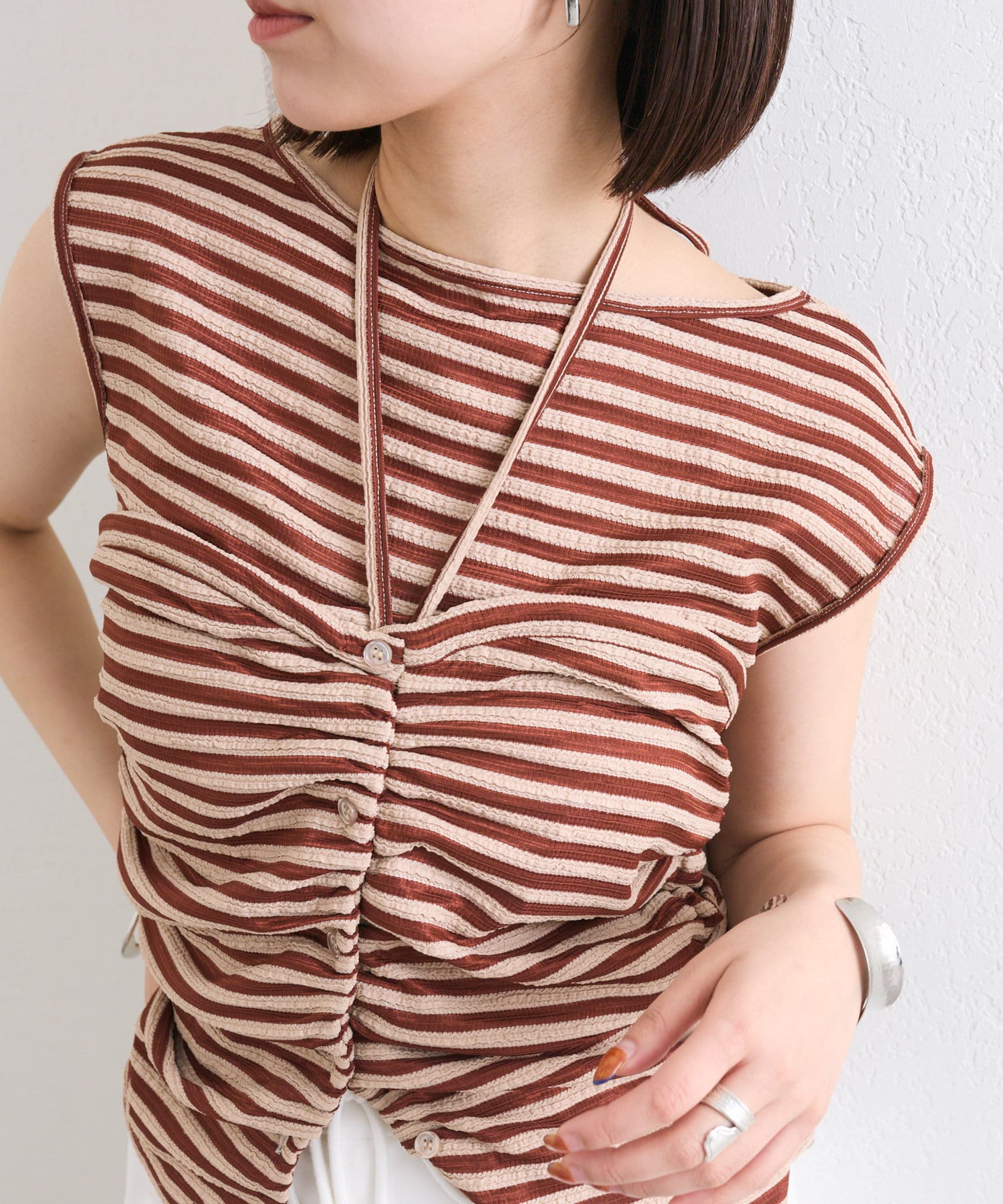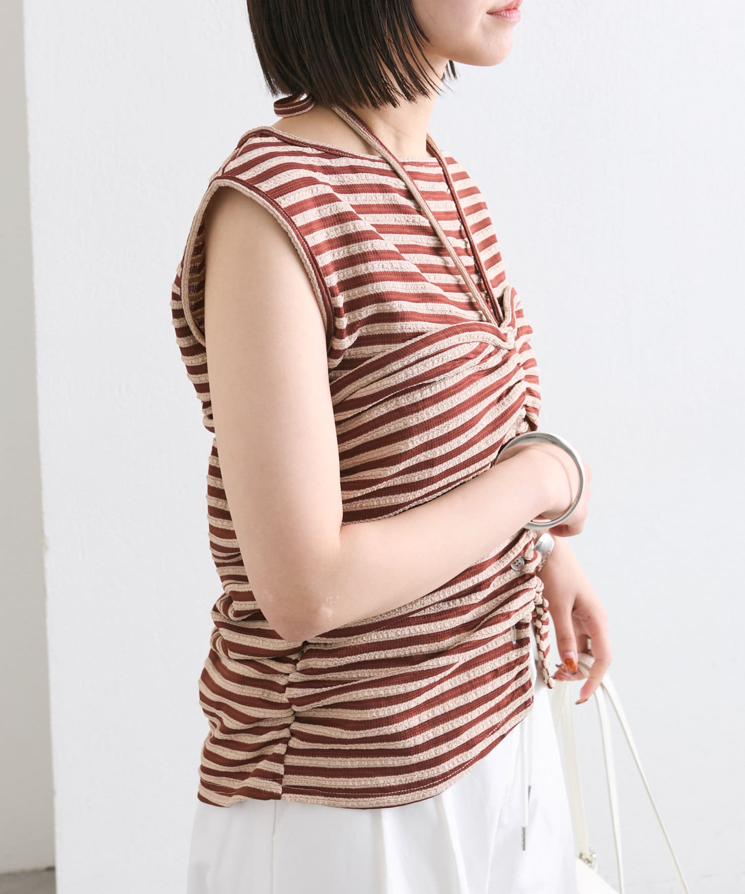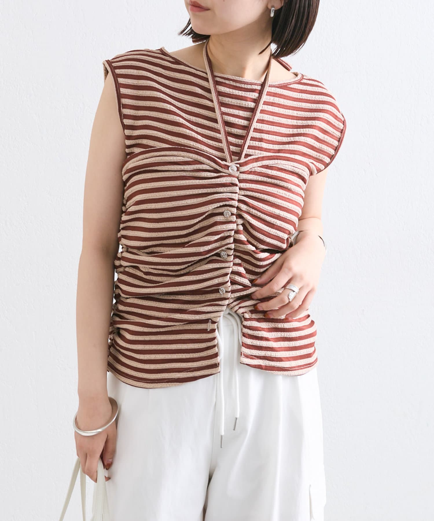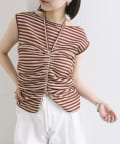 チョーカーが施されており、前と横にギャザーが入っている仕様のタンクトップ。