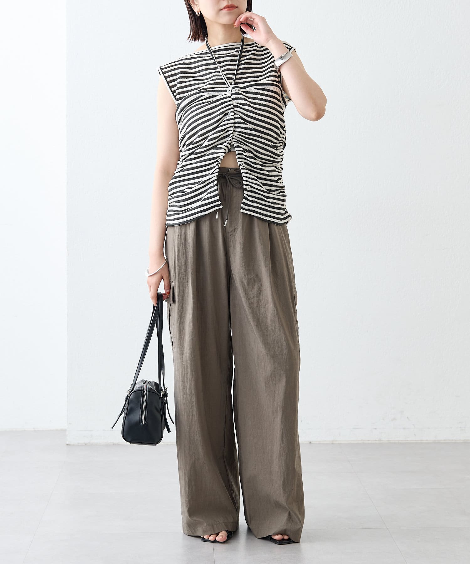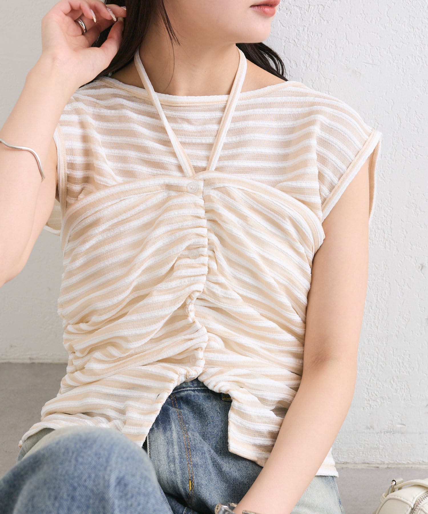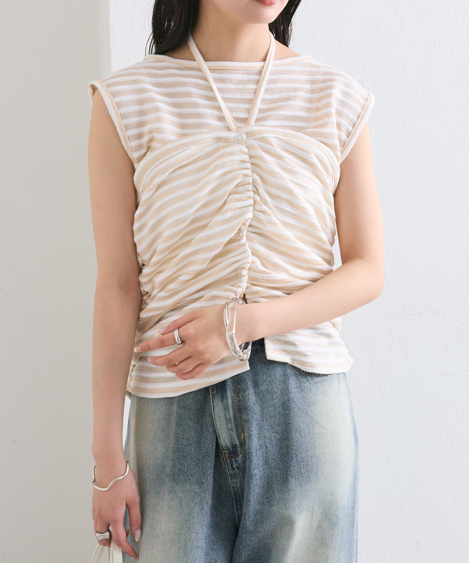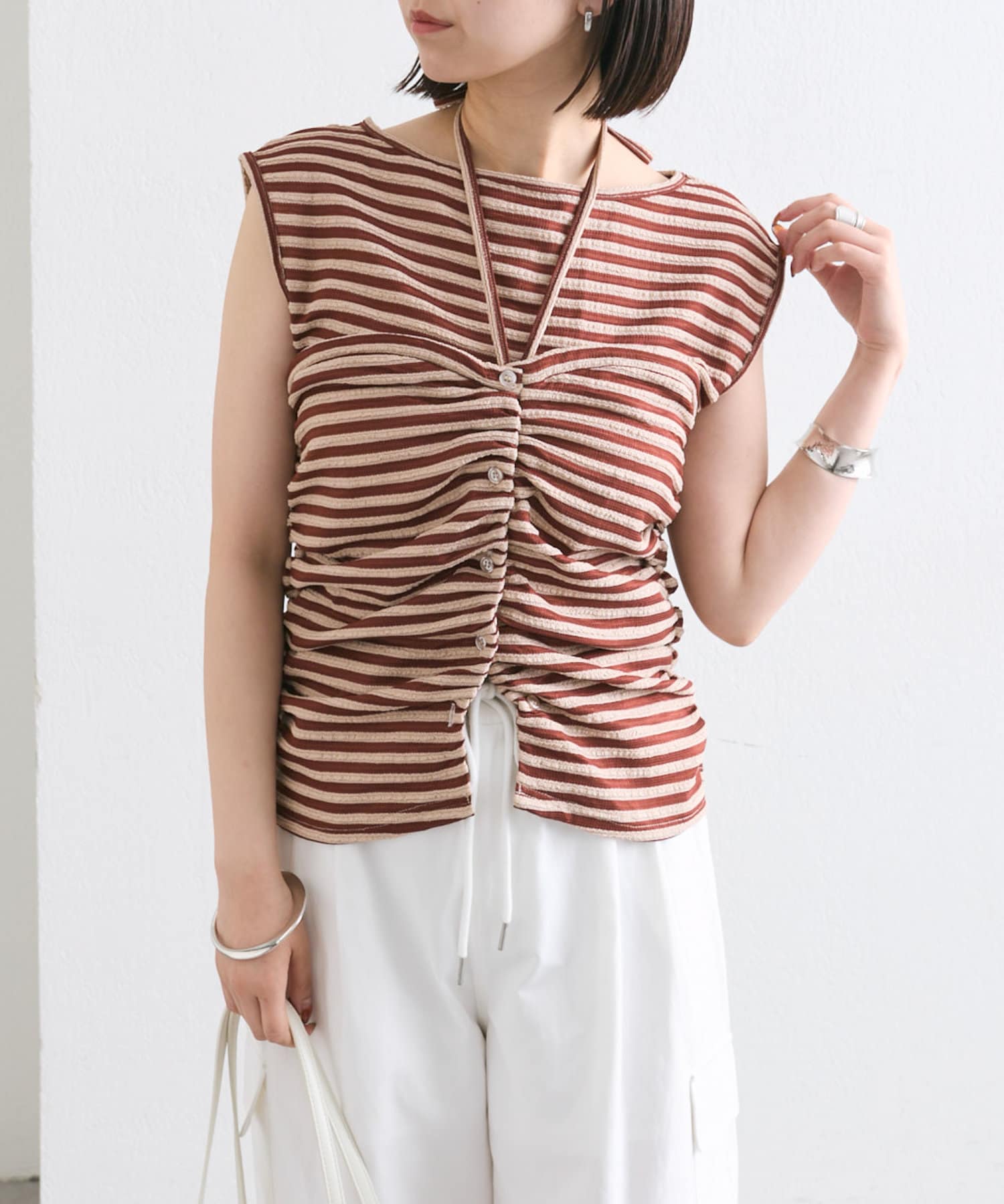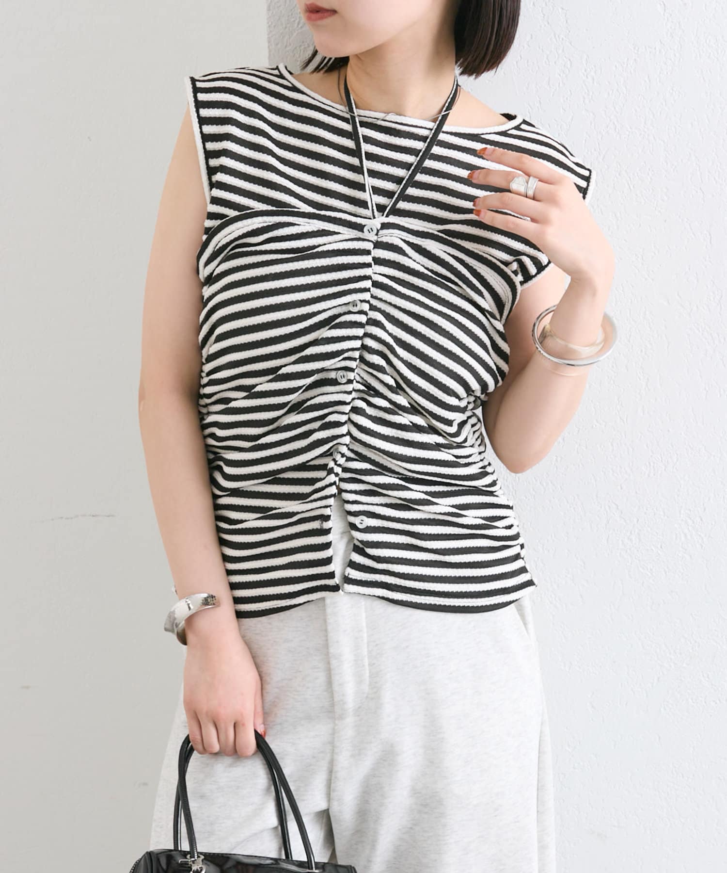 チョーカーが施されており、前と横にギャザーが入っている仕様のタンクトップ。