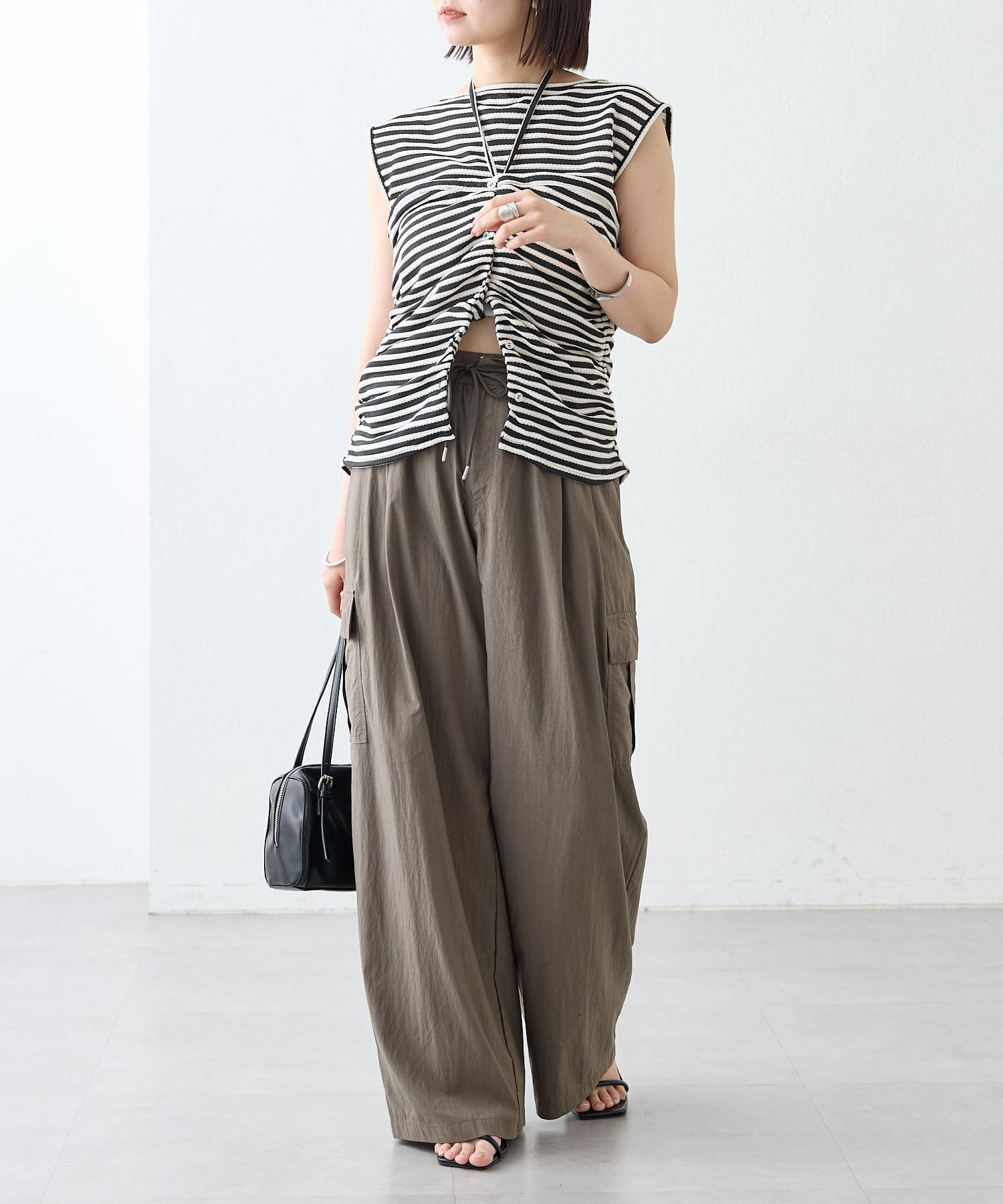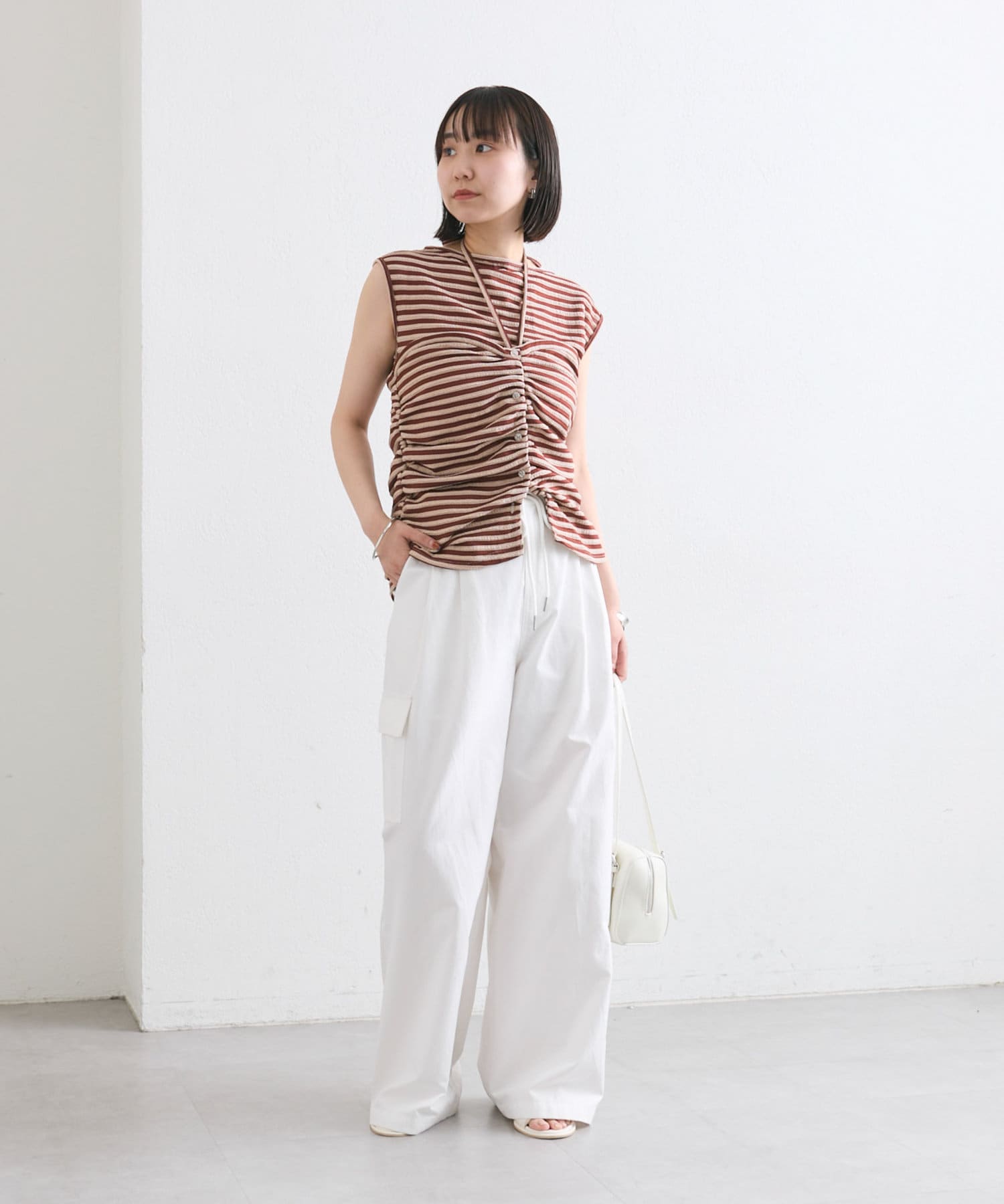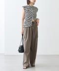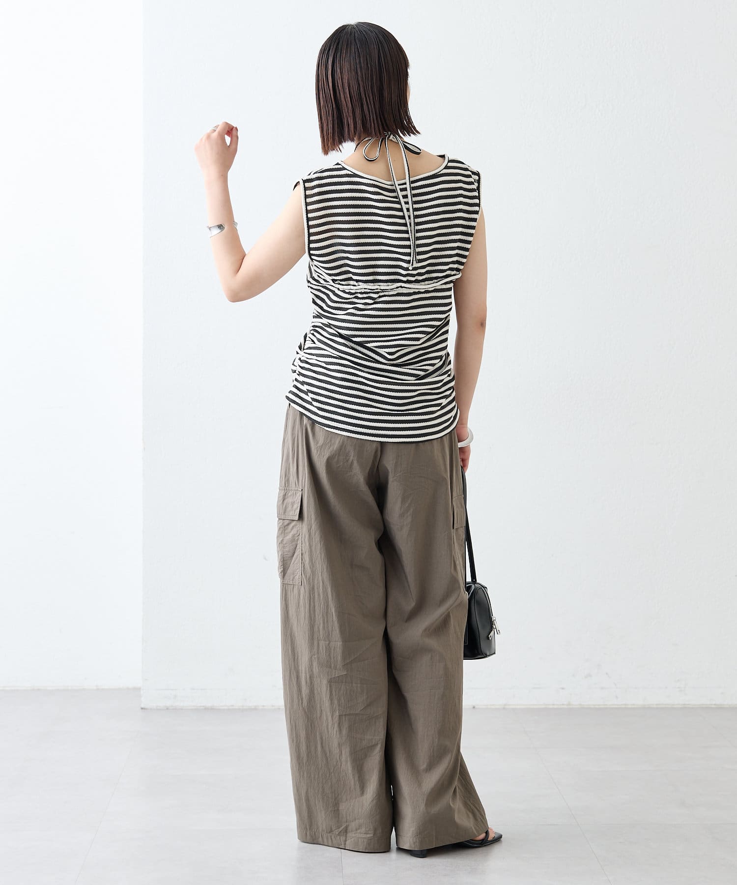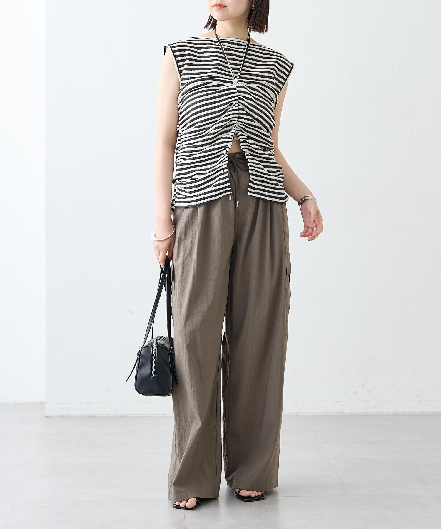 チョーカーが施されており、前と横にギャザーが入っている仕様のタンクトップ。