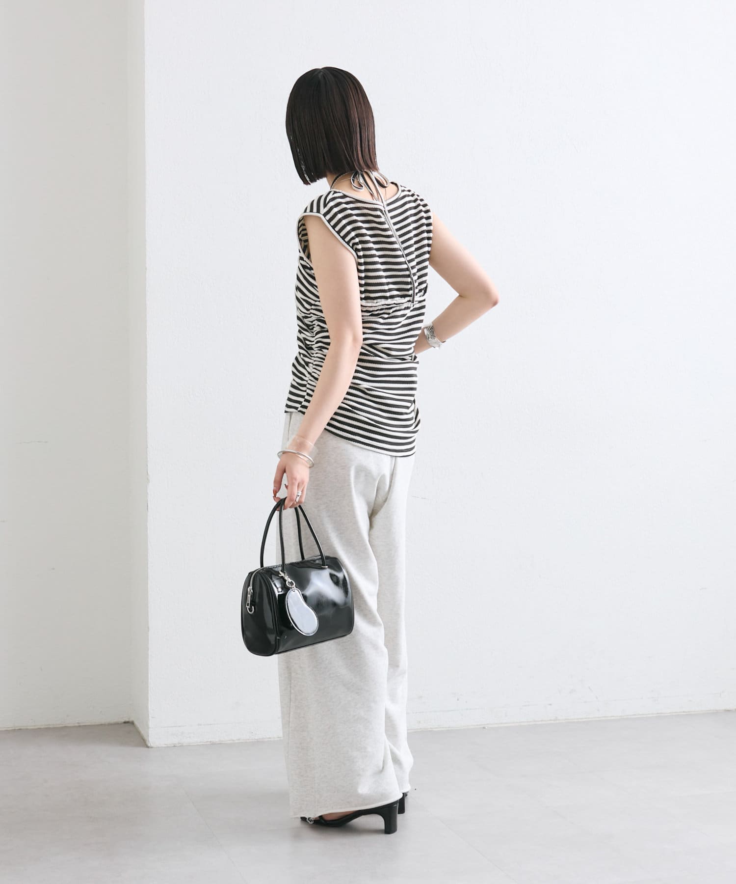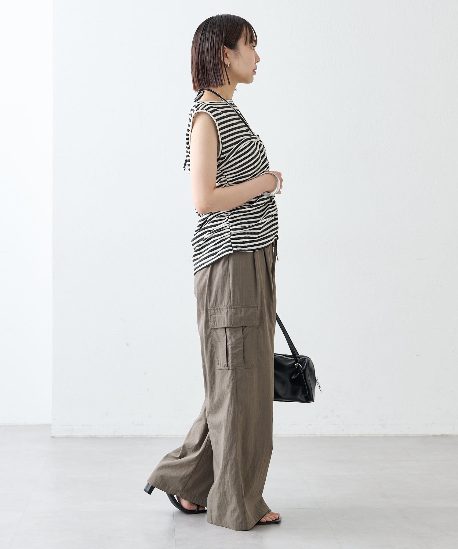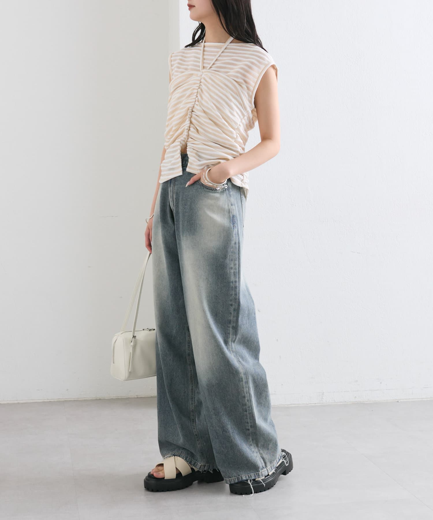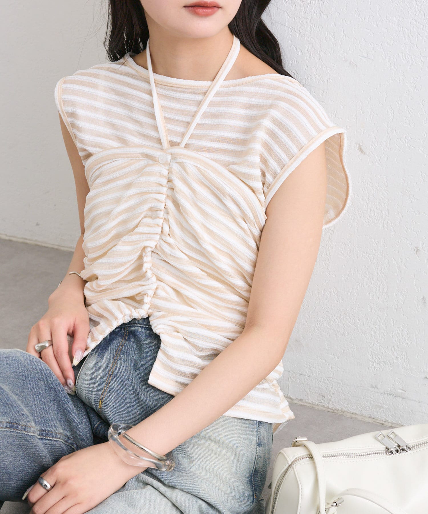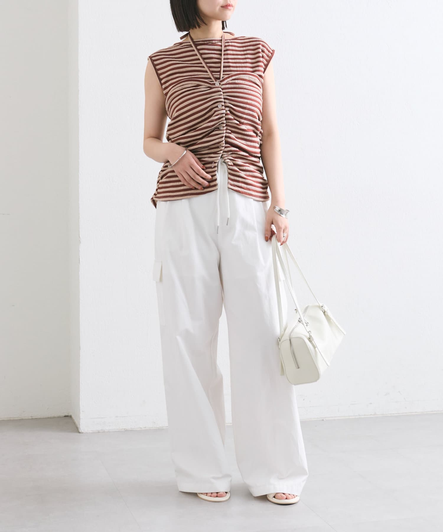 チョーカーが施されており、前と横にギャザーが入っている仕様のタンクトップ。