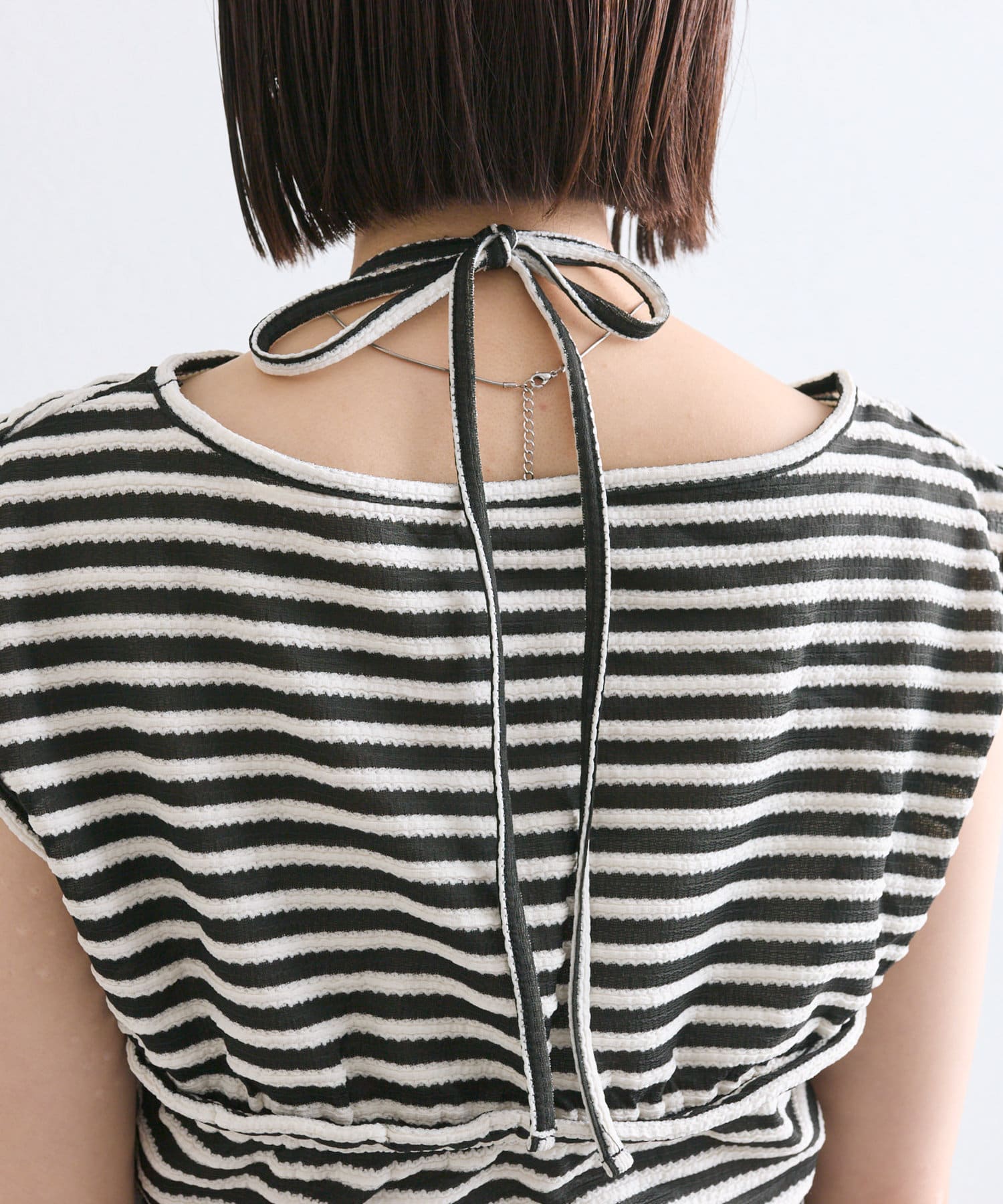 前についている紐を後ろで結んでも、前で結んでチョーカー風にできるので