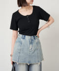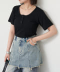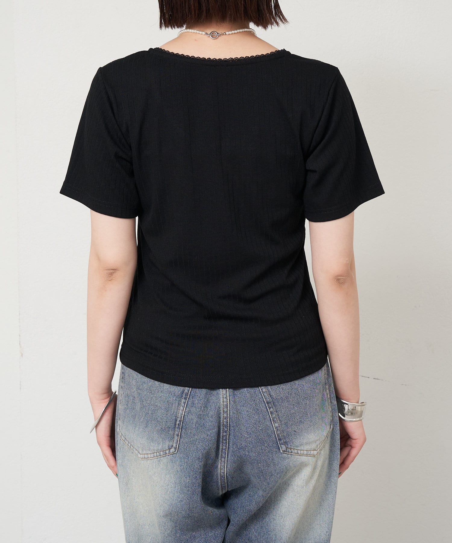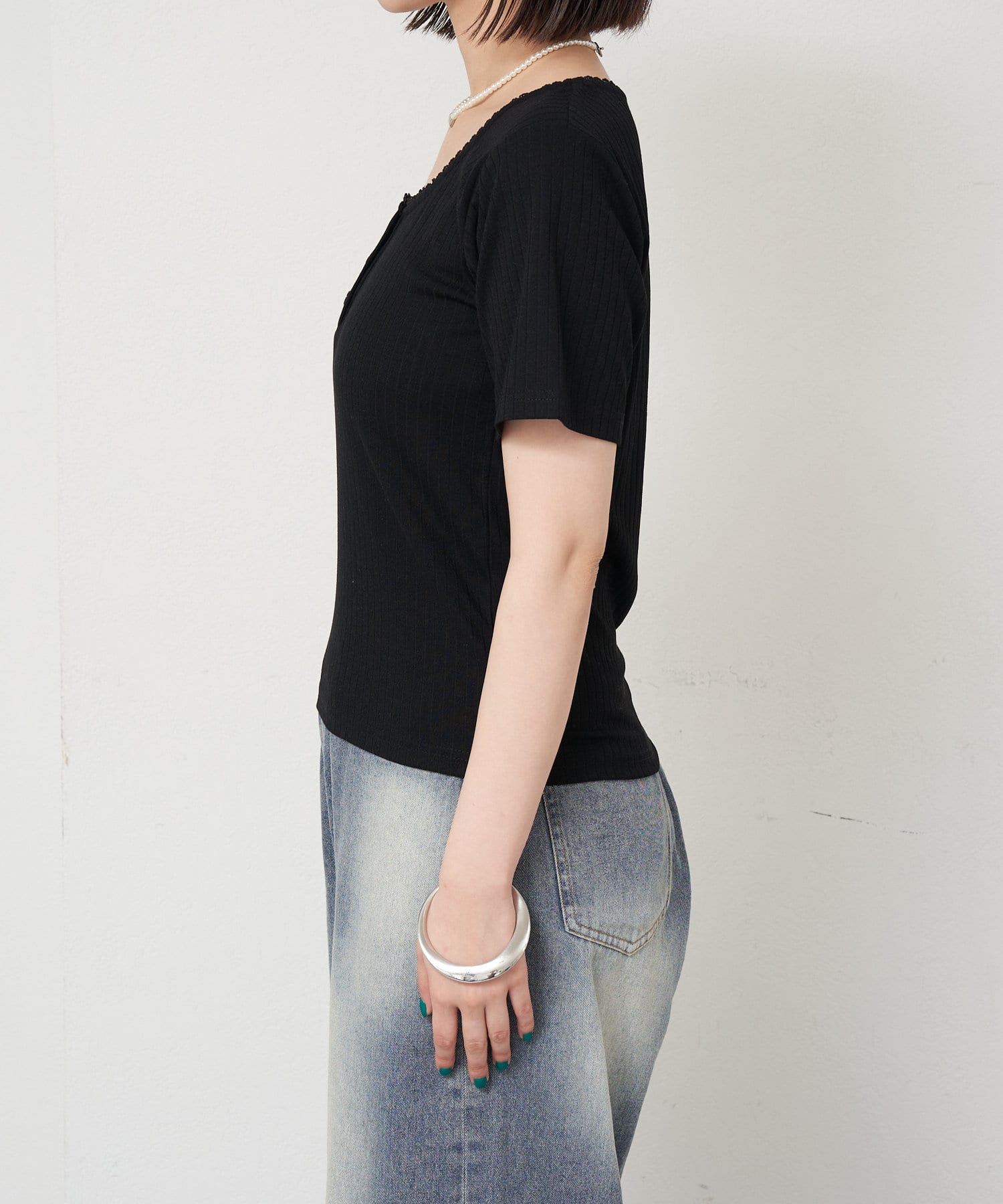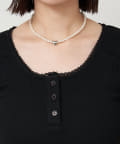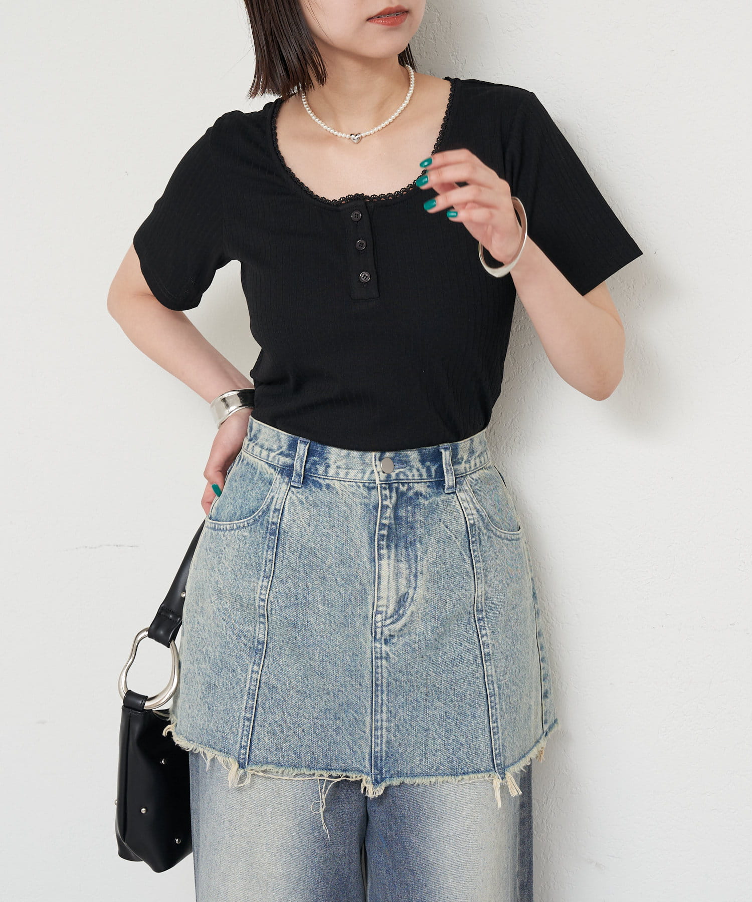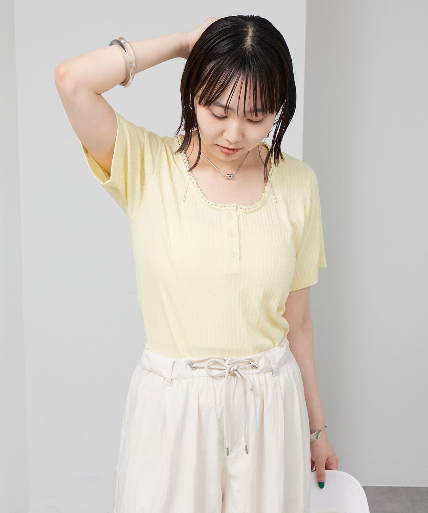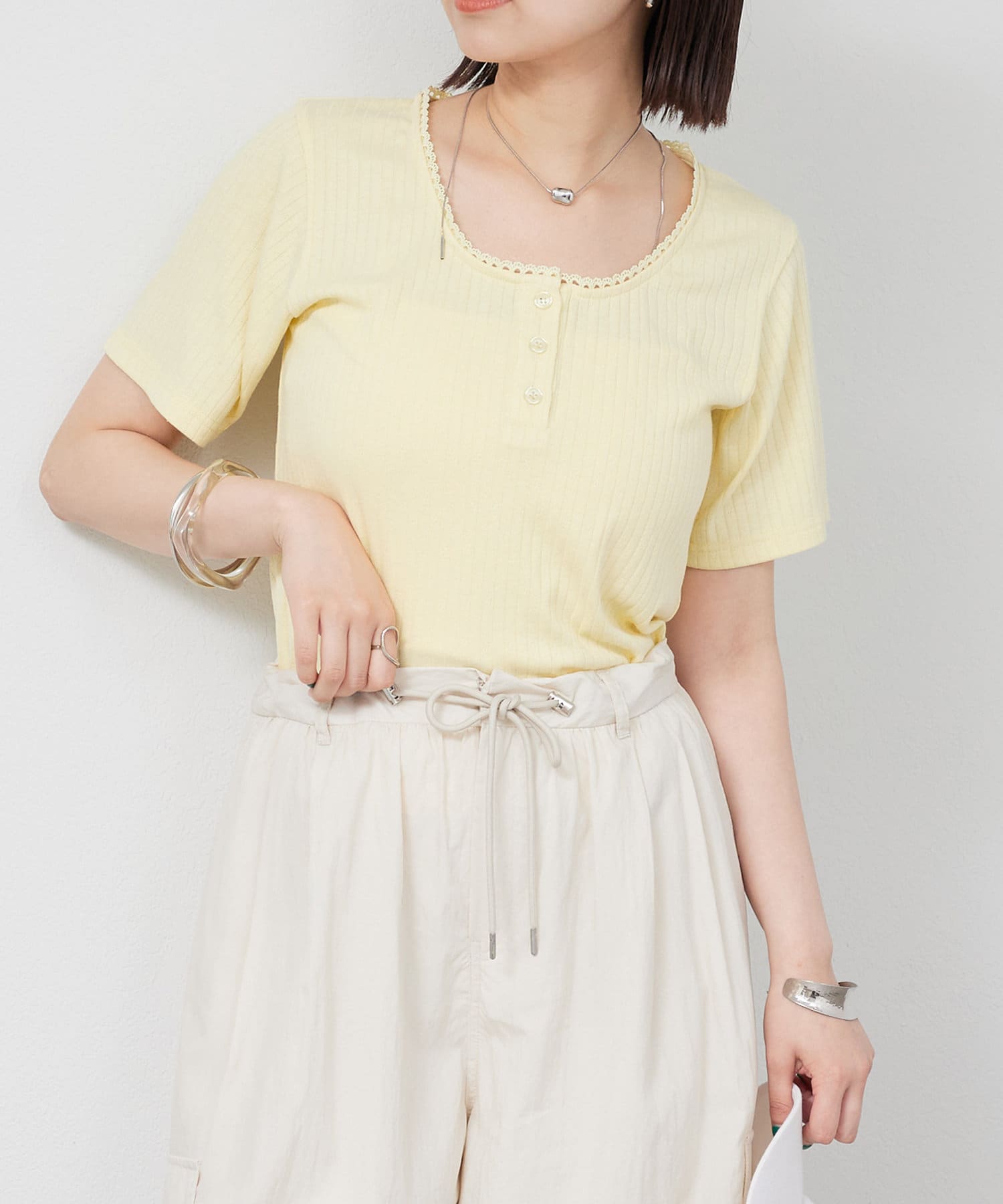 ・繊細なレースを襟元にあしらい、フェミニンな印象に仕上げたヘンリーTシャツ。フロントのボタンもオシャレポイント◎
